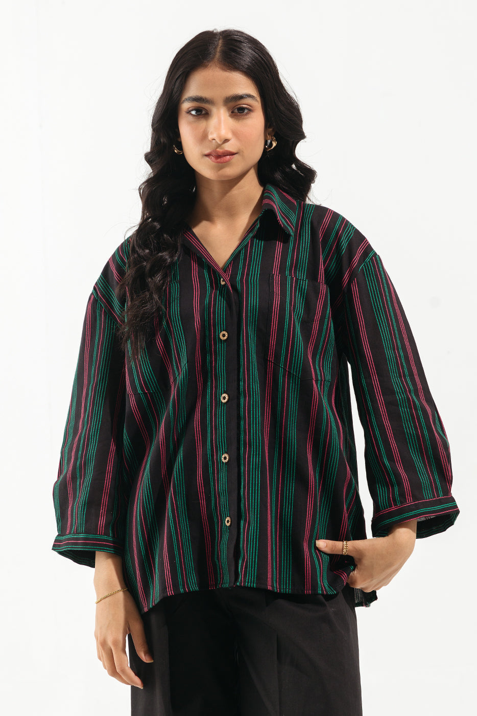 Basic Fusion Button Down Top Having A Collar Neckline With Extended Sleeves Along With Pockets On Front. Fabric:Yarn Dyed