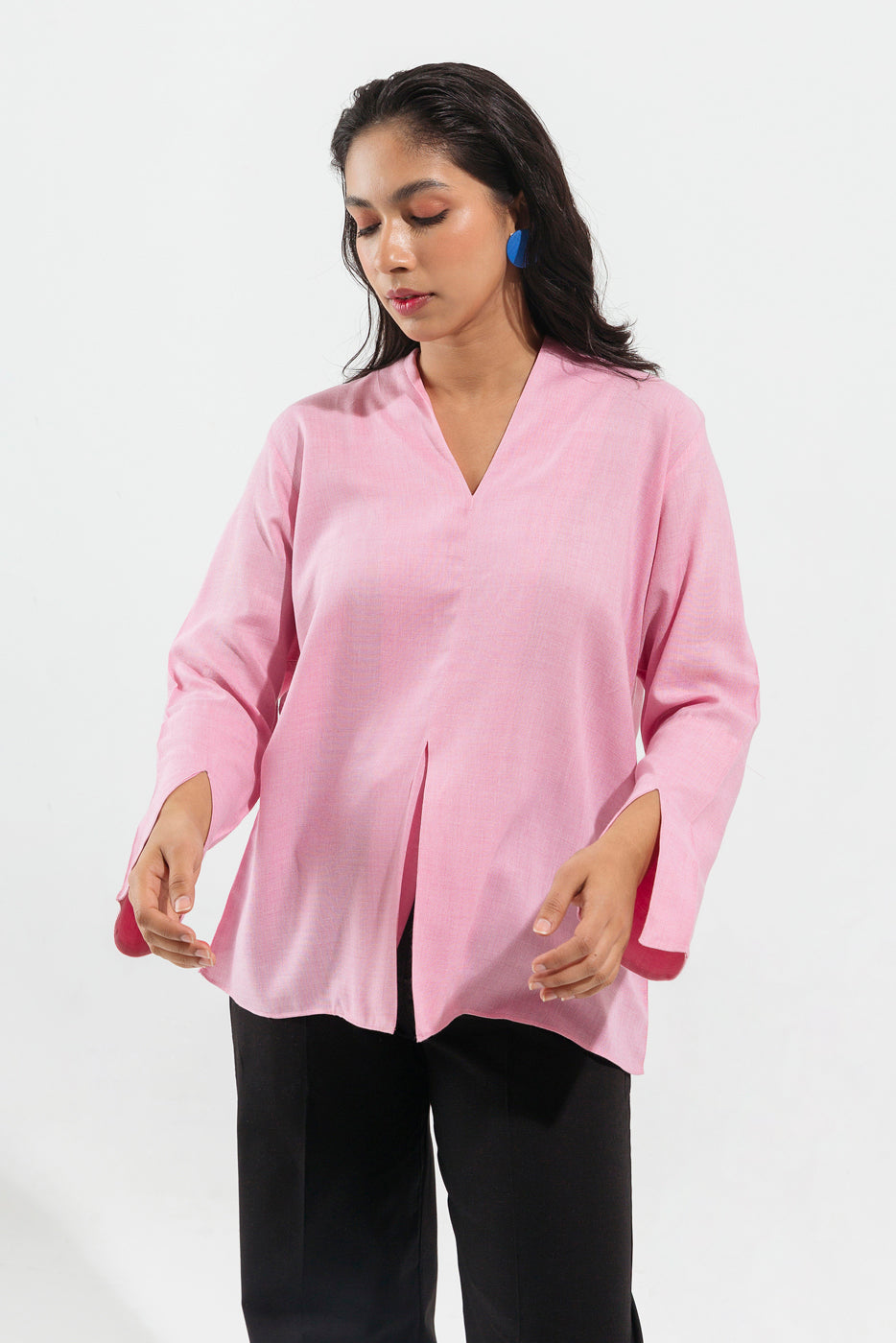 Light Pink Shawl Collar Top With Slit Cut Opening On Front And Full Sleeves.Fabric:Textured CottonWhat You'll Get: Top