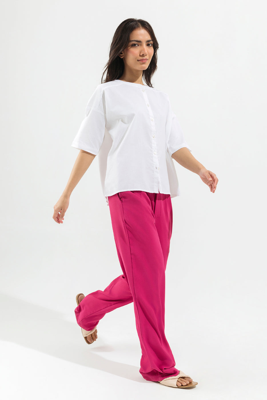 White Band Collar Top With Placket Opening, Drop Shoulder And Half Sleeves.Fabric: Crepe