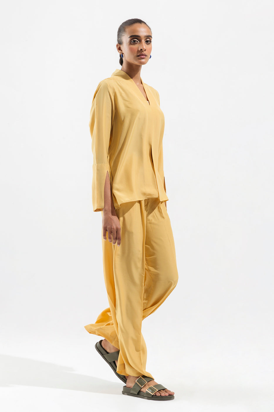 Pants With Plain Waist Belt, Overlapped Pleat Detail, Non Functional Fly And Side Seam Pockets.Fabric:Crepe What You'll Get: Shirt+Pants