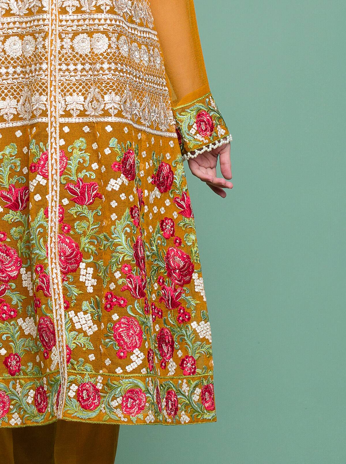 Fabric:Raw SilkEmbellishment Detail:Delicate shuffle embroidered kurta paired with organza and lace detailing on sleeves. Crystal and Swarovski embellishment on front.No. of Units: ShirtFit: Straight Size : 8 - 35" , 10 - 36" , 12 - 37" , 14 - 38"