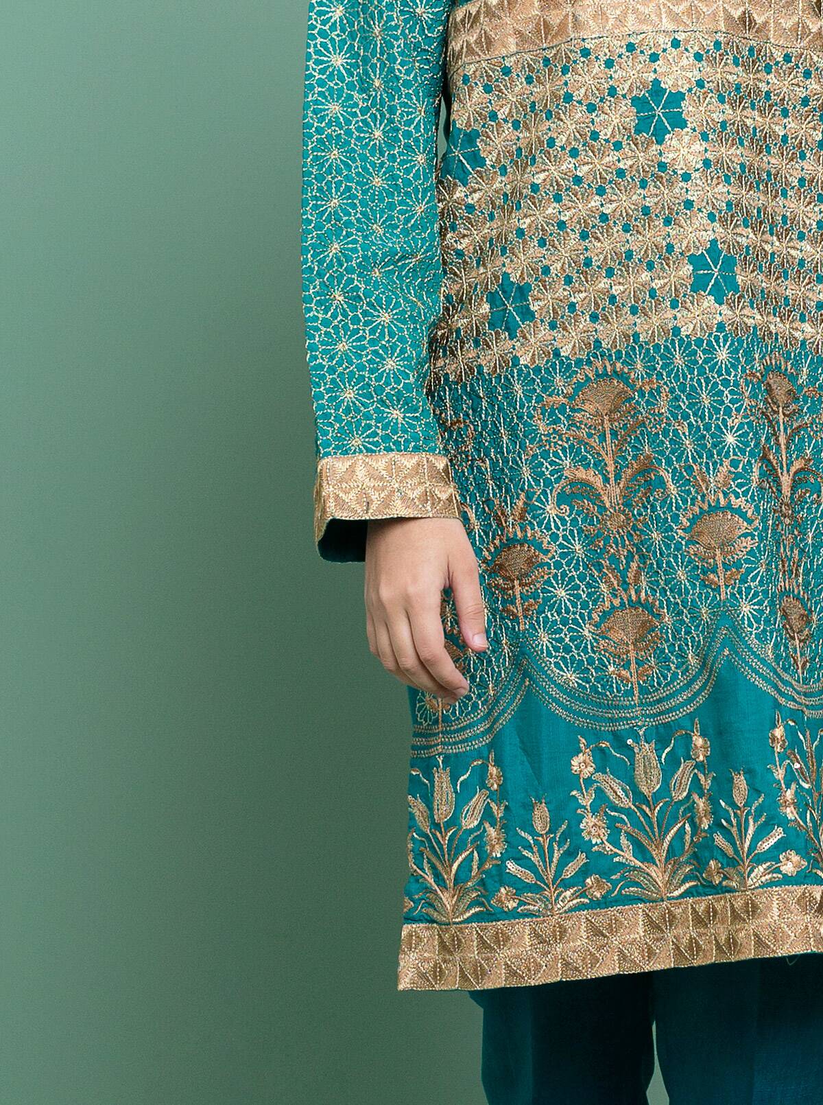 Fabric:Raw SilkEmbellishment Detail:Fully embroidered shirt front and sleeves. Dori embroidery in resham and zari thread.No. of Units: ShirtFit: Straight Size : 8 - 36" , 10 - 37" , 12 - 38" , 14 - 39"