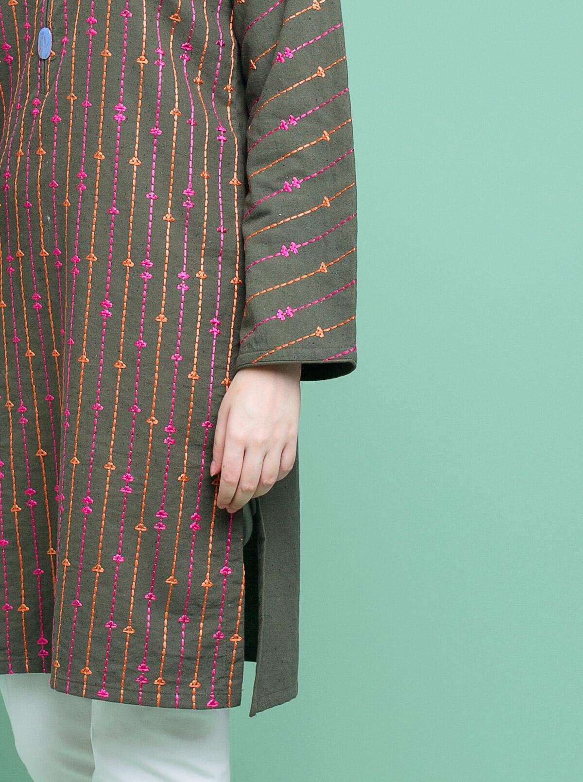 Fabric:KhaddarEmbellishment Detail:Basic boat neckline with V placket. Fully embroidered front and sleeves, with button detail.No. of Units: ShirtFit: StraightSize : 8 & 10 - 36" , 12 - 38" , 14 - 39"