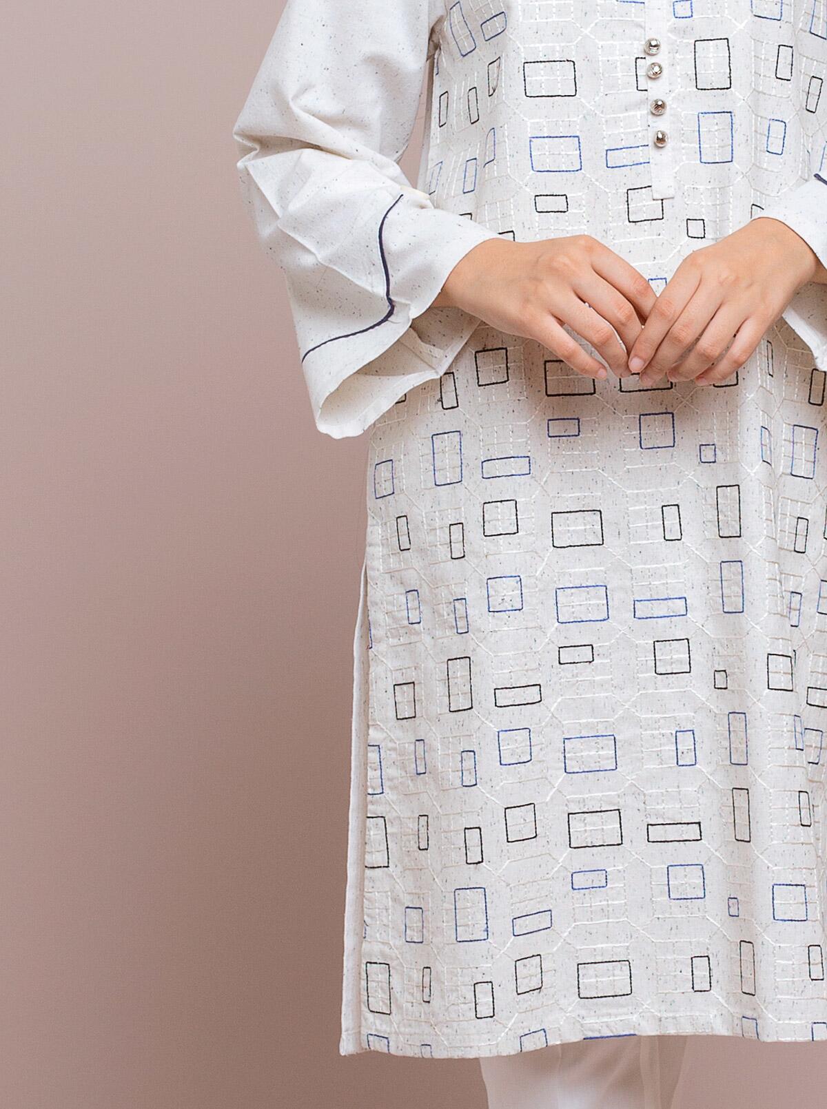 Fabric:KhaddarEmbellishment Detail:Band collar with V placket and button detail. Fully embroidered front. Trim and button detail on sleeves.No. of Units: ShirtFit: StraightSize : 8 & 10 - 36" , 12 - 38" , 14 - 40"