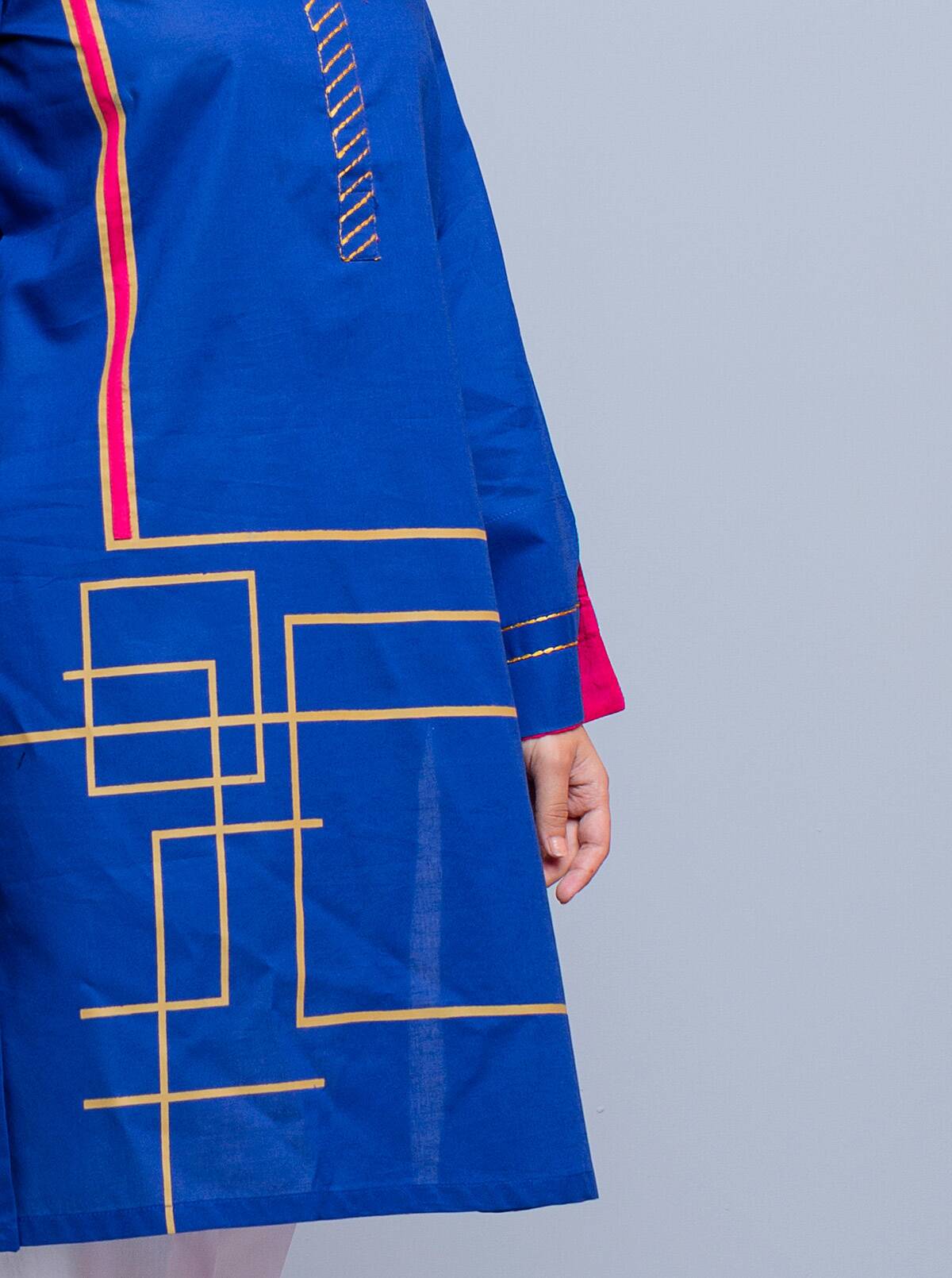 Fabric:CottonEmbellishment Detail:Band collar with front placket. Slant stitch detail on placket. Screen printed front and top stitch detail on sleeves.No. of Units: ShirtFit: StraightSize : 8 & 10 - 35" , 12 - 36" , 14 - 38"