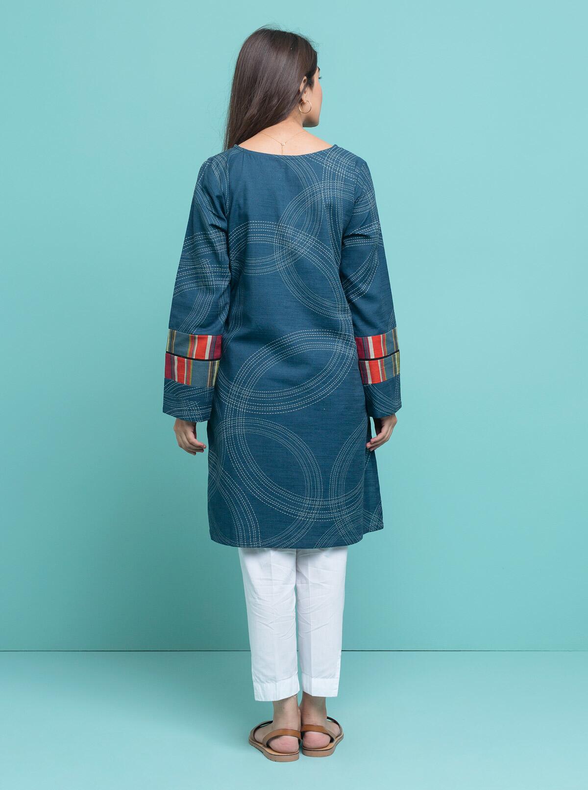 Fabric:Slub KhaddarEmbellishment Detail:Boat neckline with loop detail. Lace and trim detail on sleeves.No. of Units: ShirtFit: Straight Size : 8 & 10 - 36" , 12 - 38" , 14 - 40"
