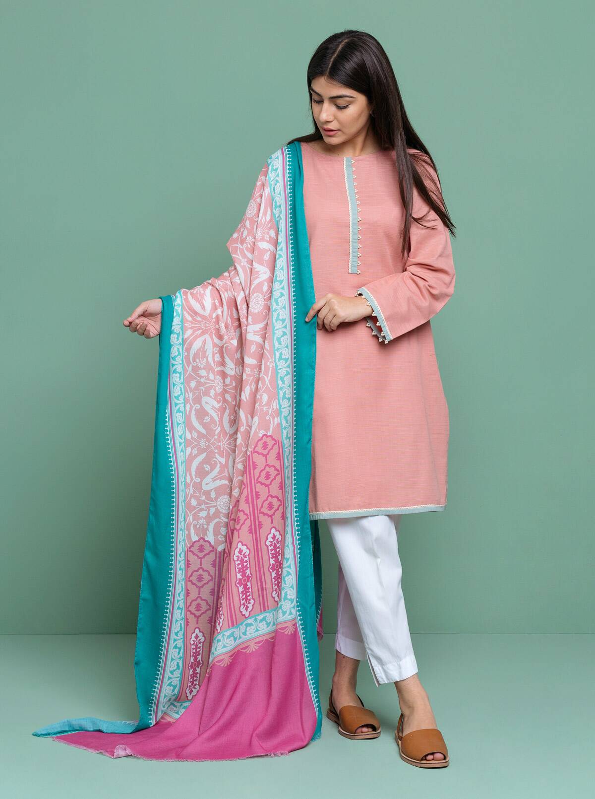 Fabric:KhaddarEmbellishment Detail:Boat neck with contrast front patti. Lace and handwork detail on neck and sleeve. Paired with a printed shawl.No. of Units: ShirtFit: Straight + ShawlSize : 8 & 10 - 36" , 12 - 38" , 14 - 40"