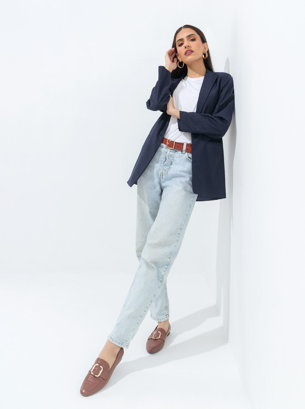 Dark navy blazer with notch collar, regular sleeves, front opening with button and fake welt pockets. Fabric: Twill