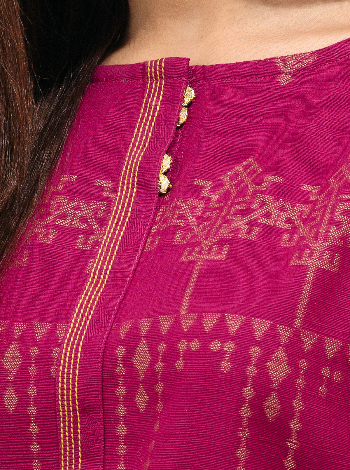 Basic round neck jacquard shirt with gota detailing on placket. Round hemline with loop insert on sleeve cuff. Fabric: Jaquard