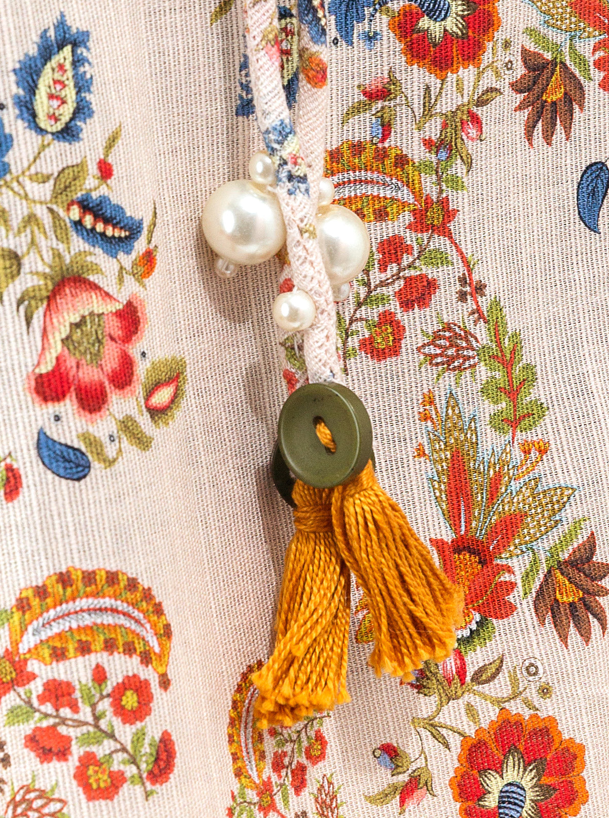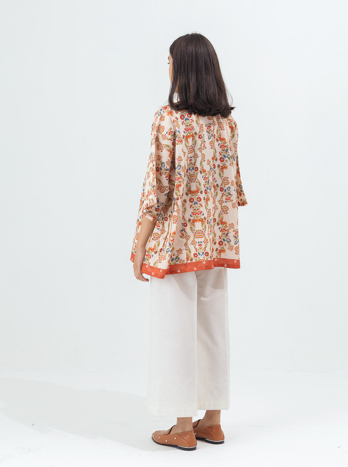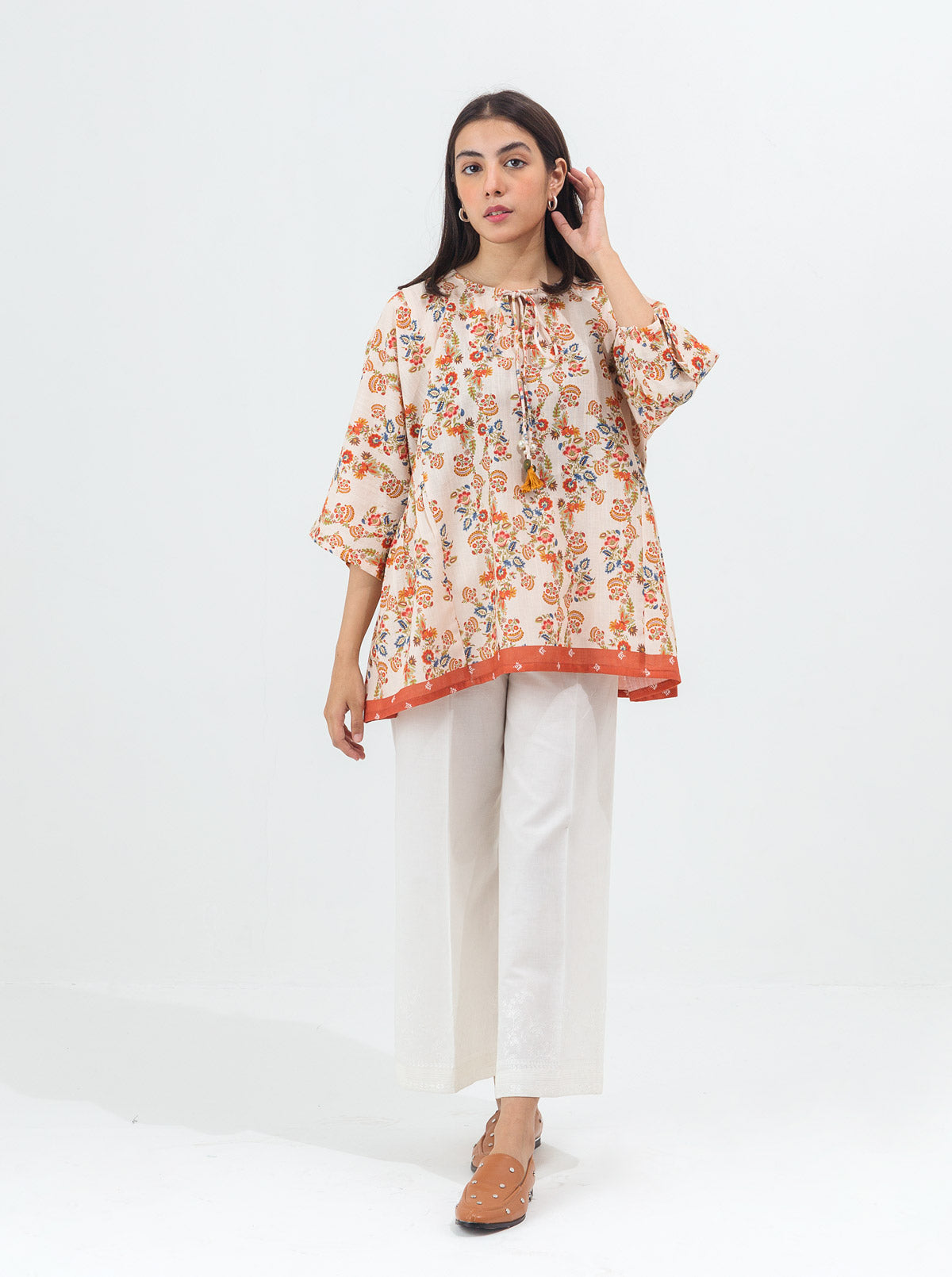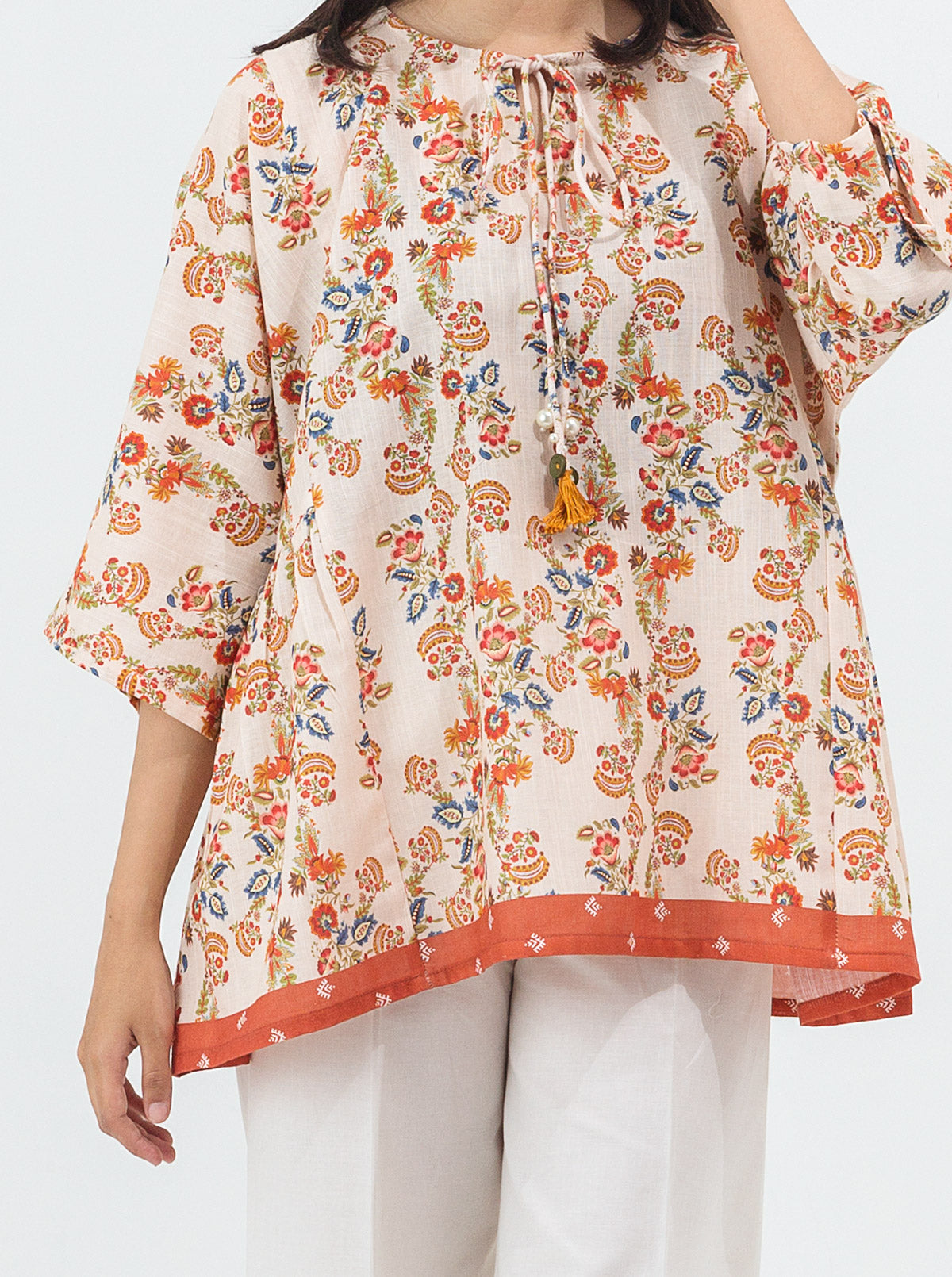 Printed peplum with tassle on neckline. Fabric: Slub khaddar