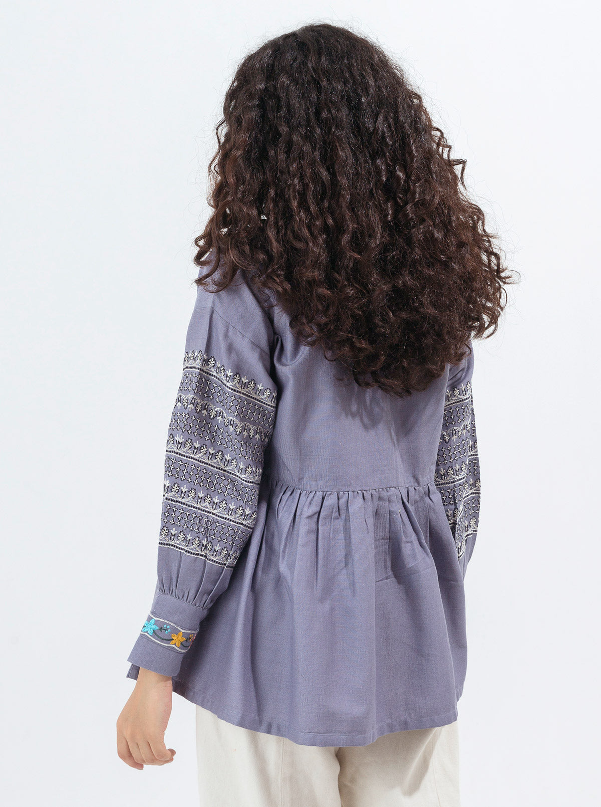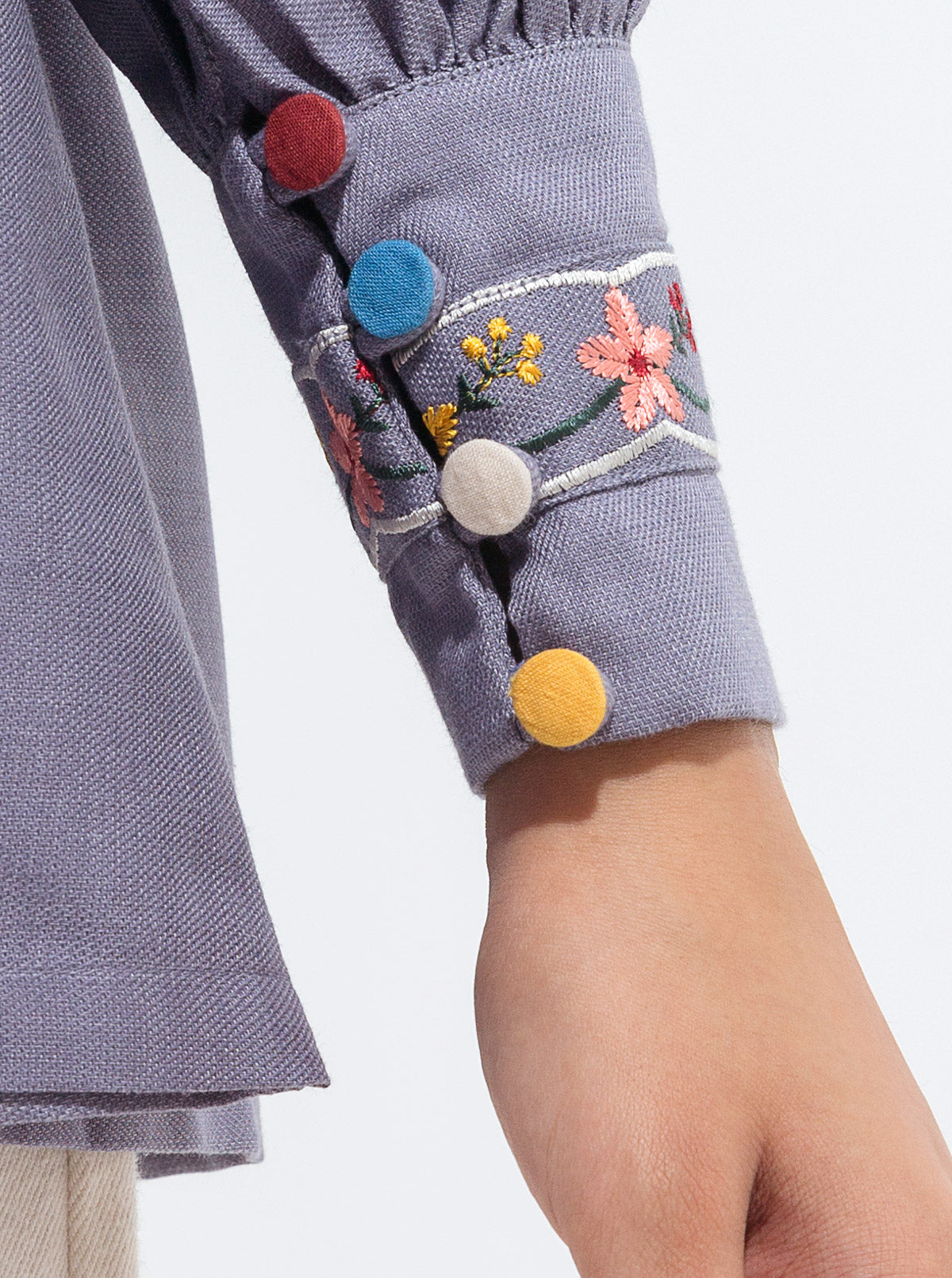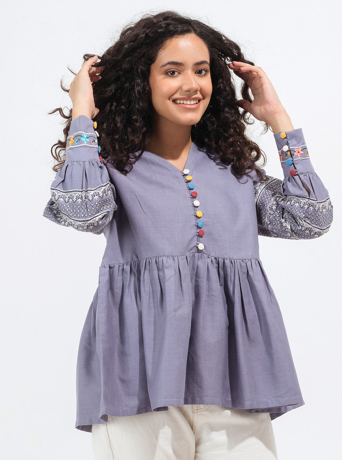 Gathered Top With Contrast Buttons And Embroidery On Sleeves. Fabric: Yarn Dyed