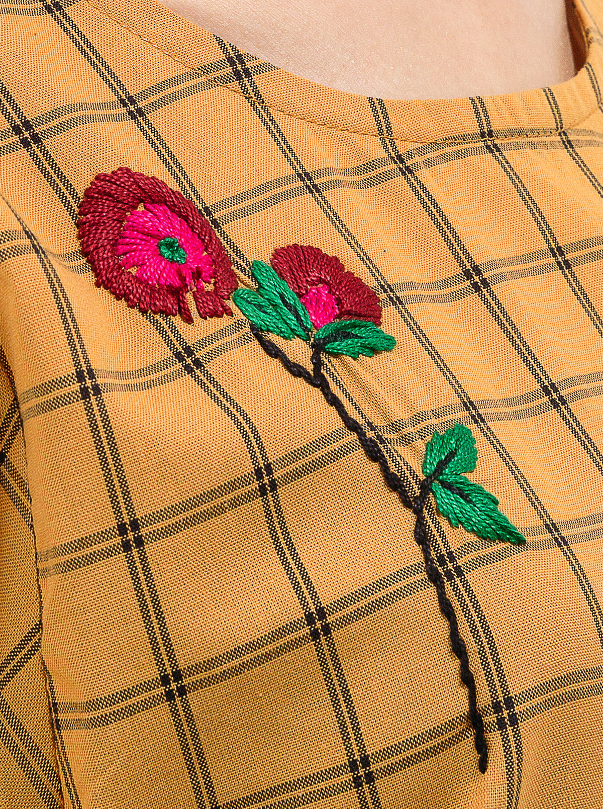 Loose fit Shirt With Round Neckline, Hand Stitched Motifs On Front And Button Detail On Sleeves. Fabric: Yarn Dyed Cotton
