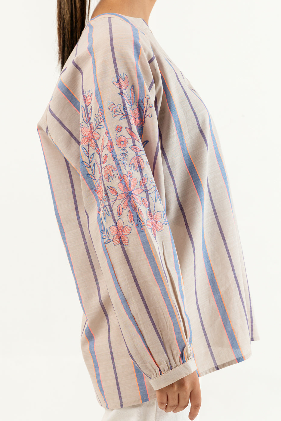 Basic fusion top with a v neckline having raglan sleeves and gathers on it with an embroidered motifs.Fabric: Cambric