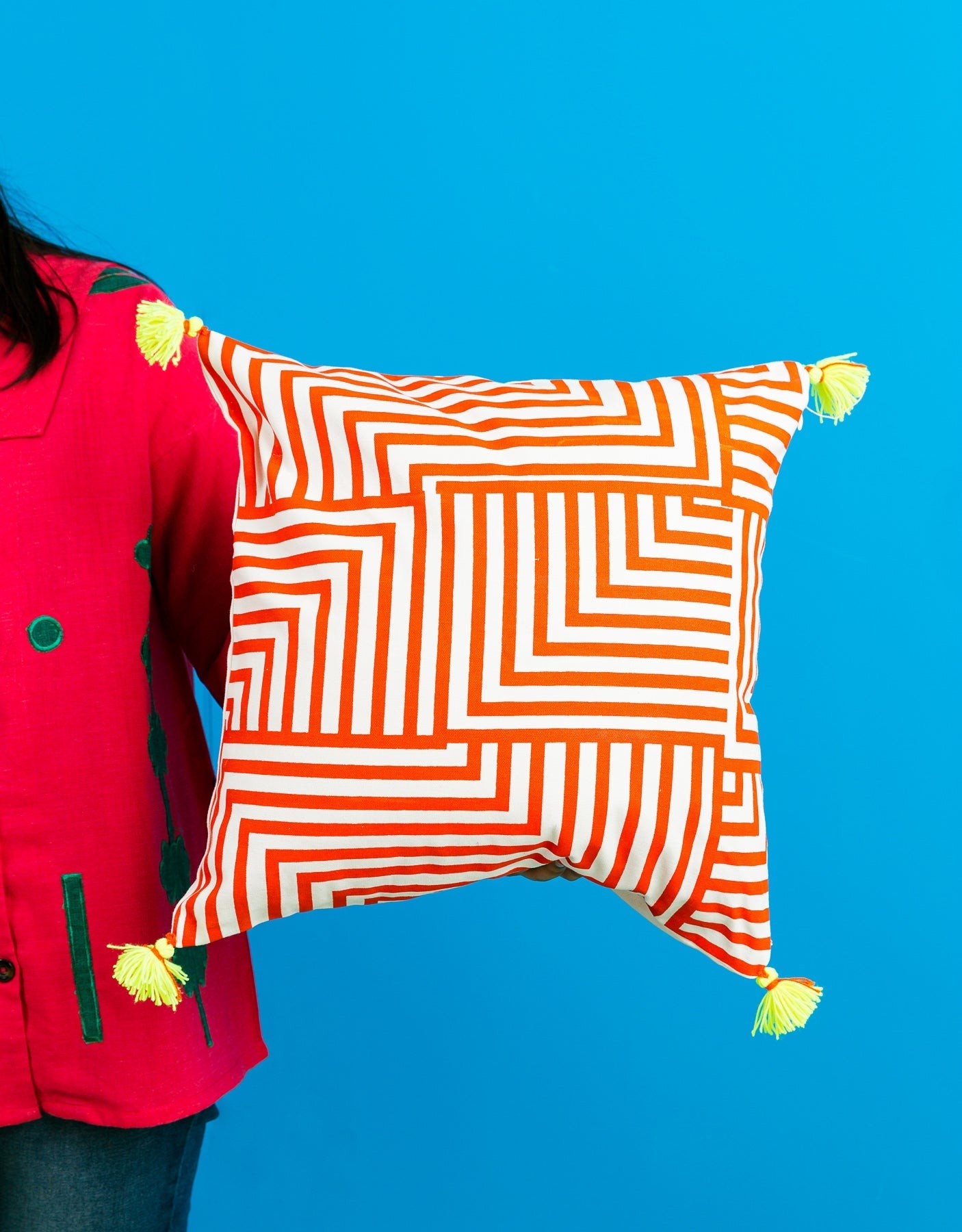 Add Some Geometric Frenzy To Your Living Room, With This Hand-Painted Vibrant Orange Cushion Perfect For The New Season.