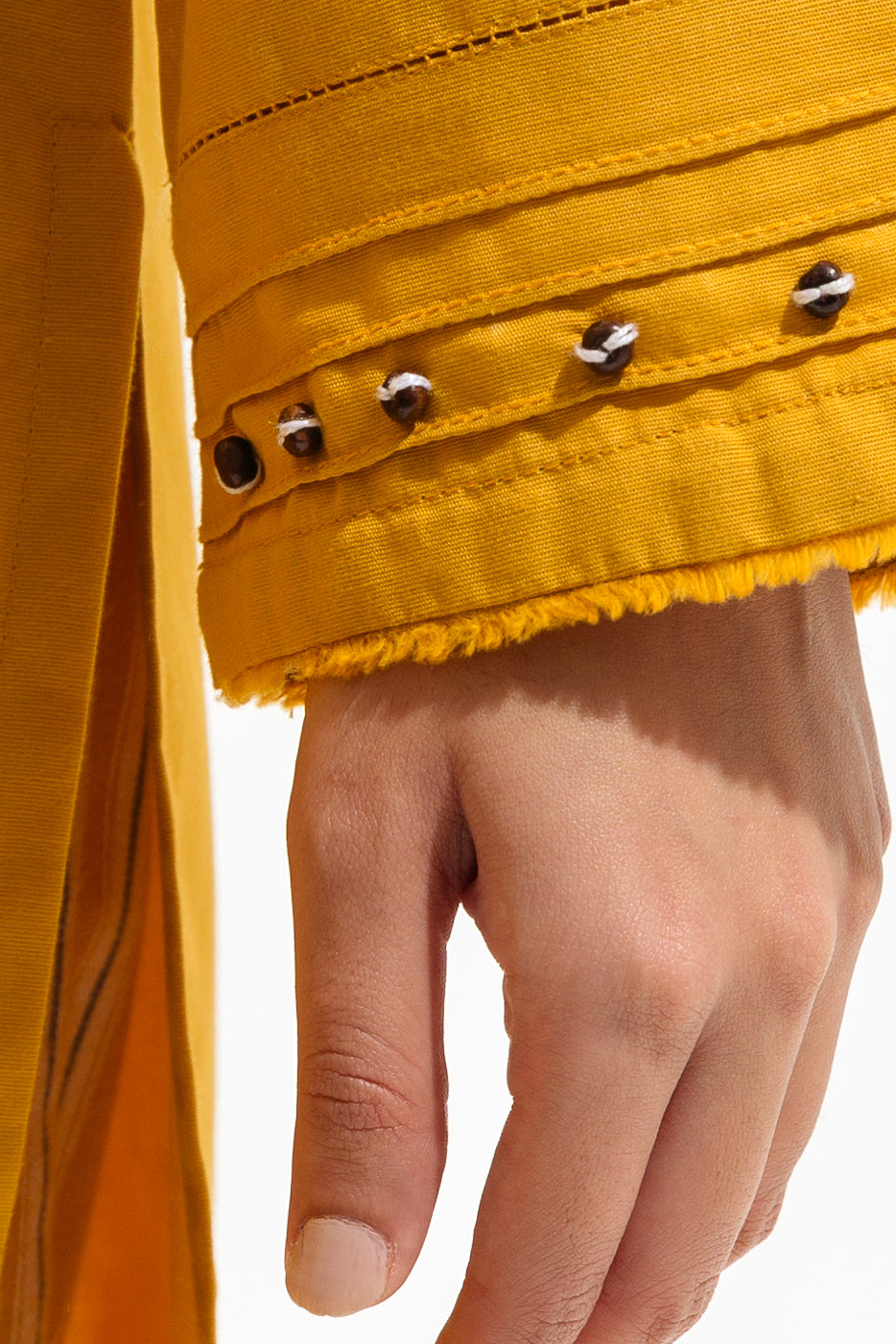 Basic Shirt With Overlapping Neckline, With Pintucks And Fray Edges On Neckline And Sleeves. Handwork Detail On Neckline And Sleeves. Paired With Flannel Pants.Fabric: Plain Khaddar