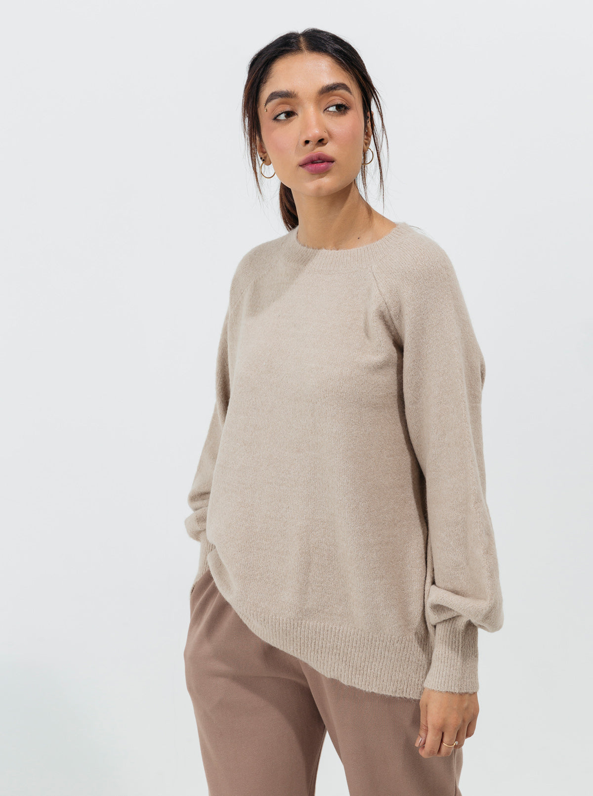 Flat knit short pullover with rib round neck, raglan full length balloon sleeves with rib cuffs and hem Fabric: 56%acrylic 27%polyamide 17%elastane
