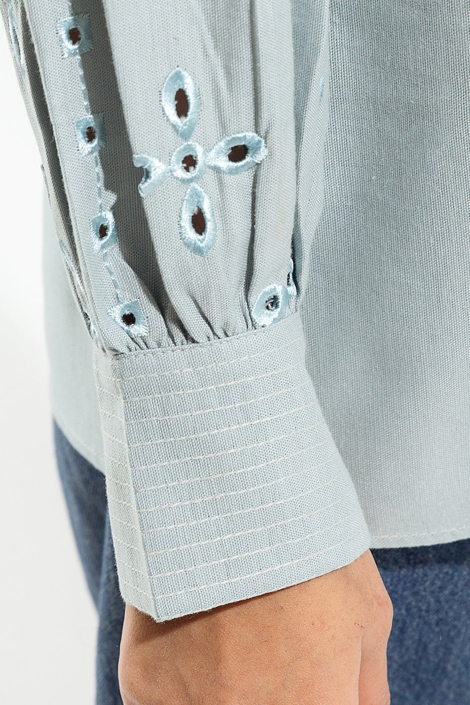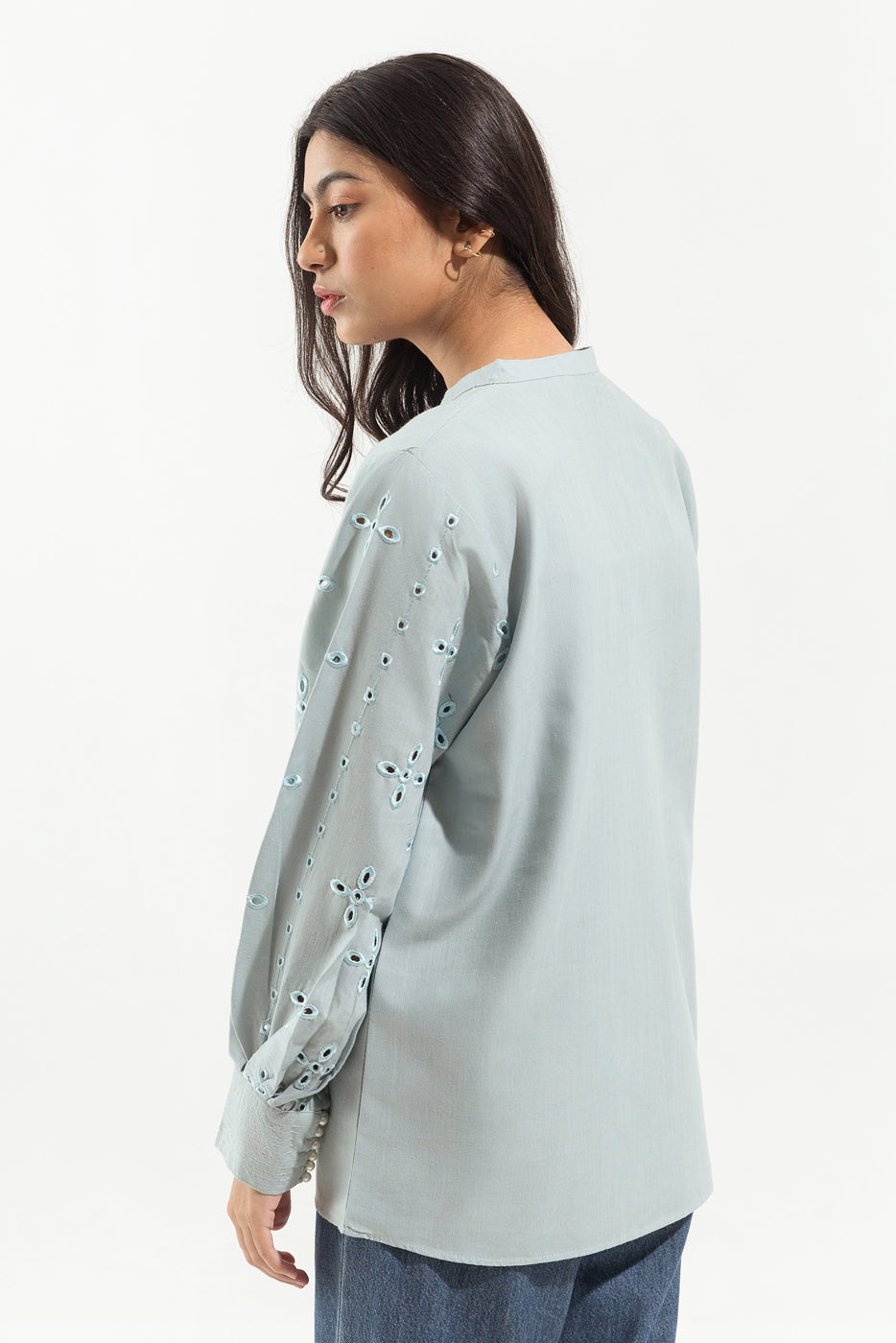 Basic Fusion Top With Schiffli Embroidery On Sleeves Having Cuffs With Loop Pearl Buttons And A Tassel On Front Band Collar. Fabric: