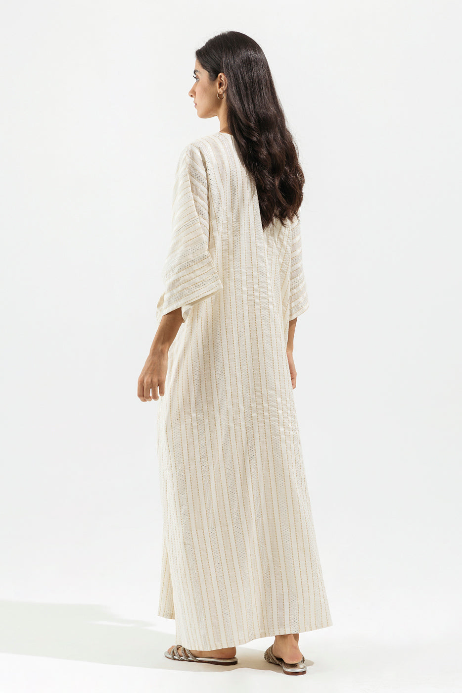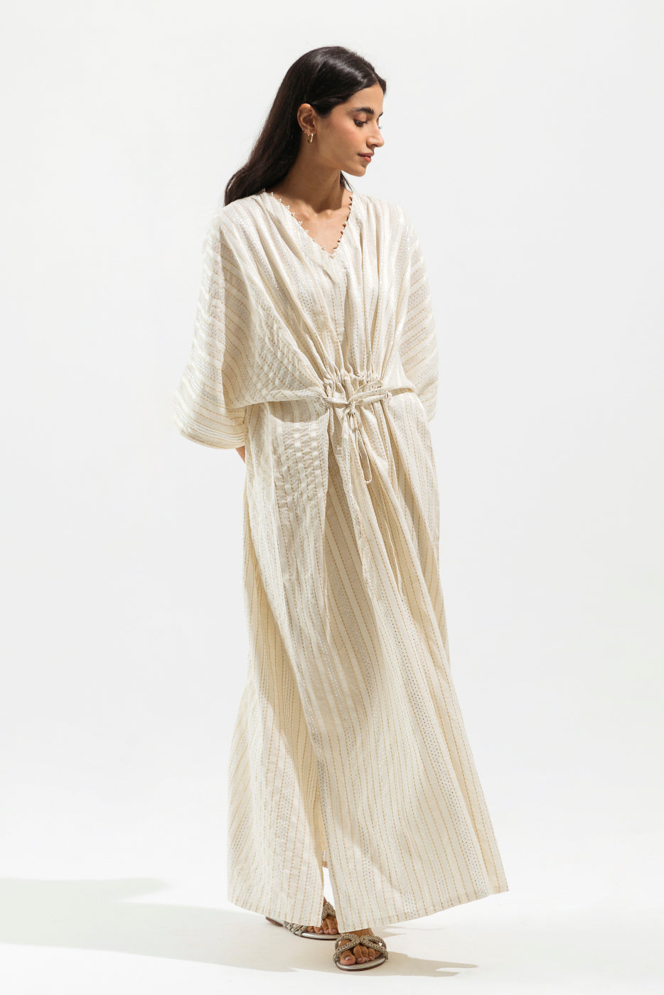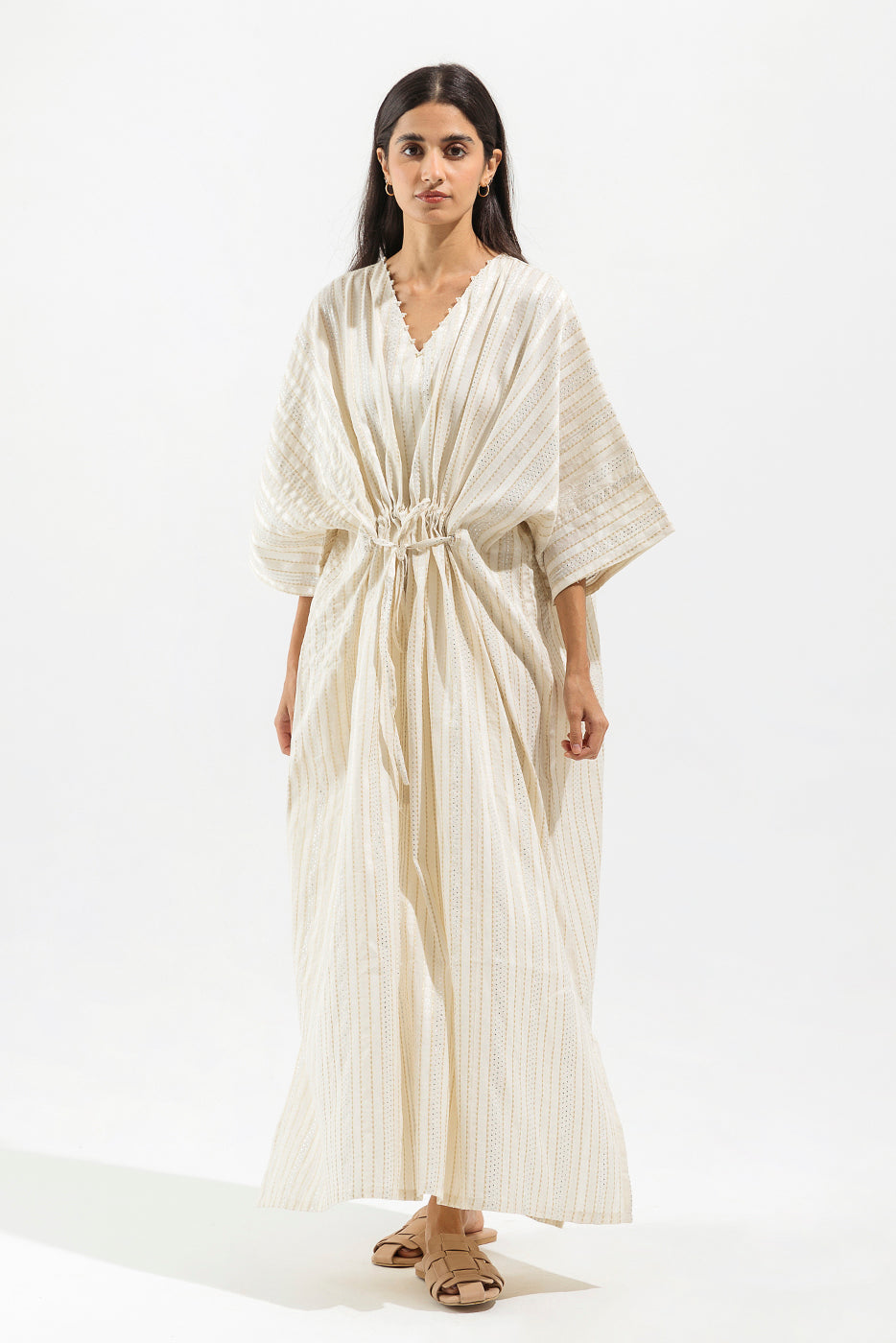 Kaaftaan With Draw String And Tassles. V Neck And Straight Hem.Fabric: Textured