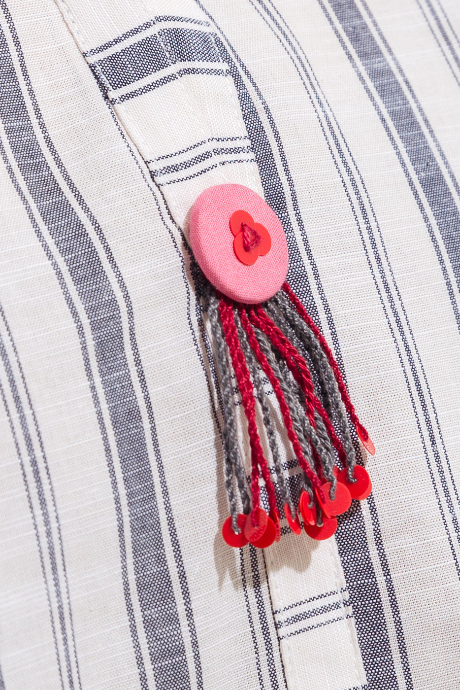 Block printed kurta with band and placket.Handmade button on placket. Frayed edges on sleeves. Straight hem.Fabric: Yarn Dyed