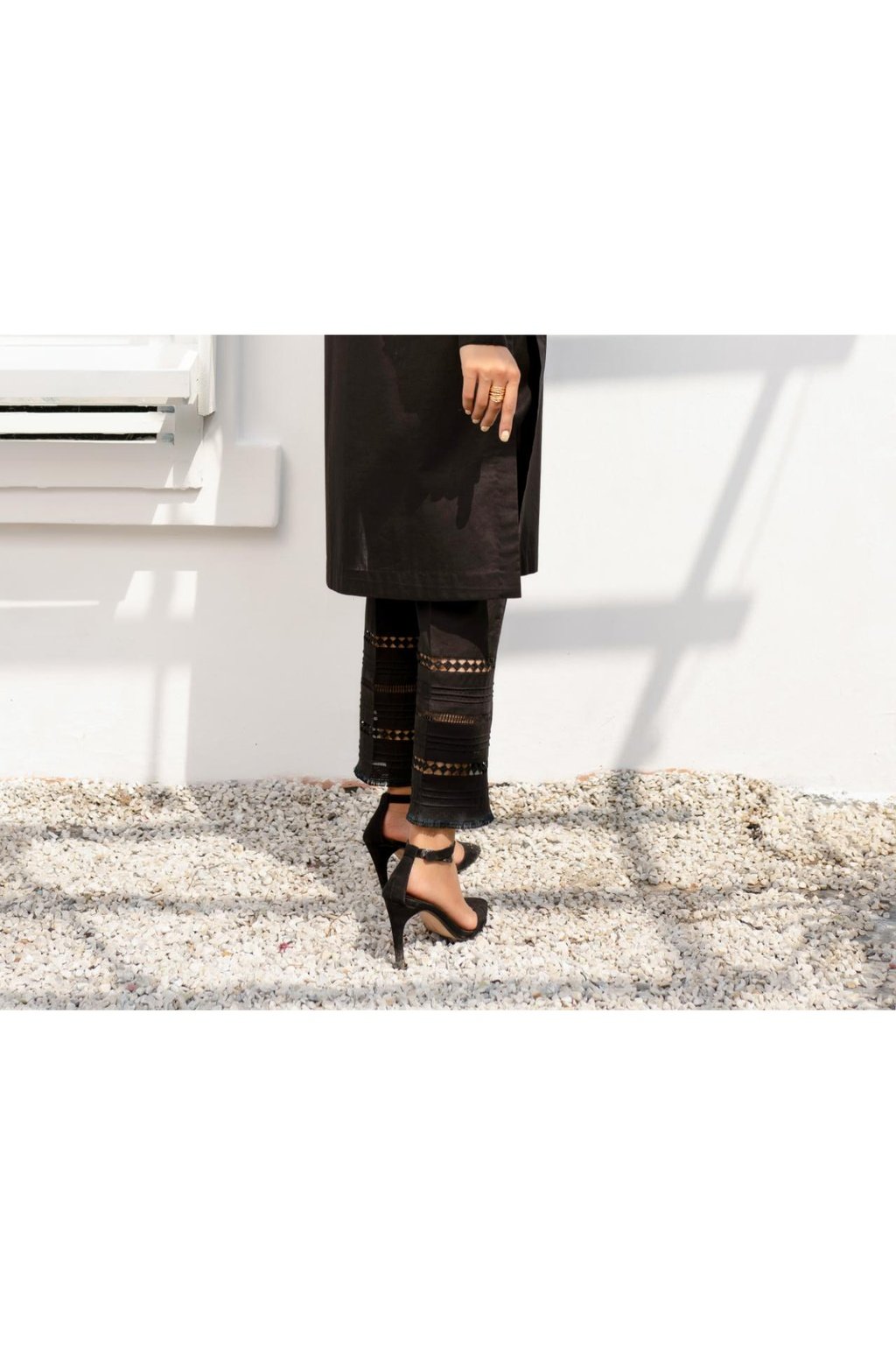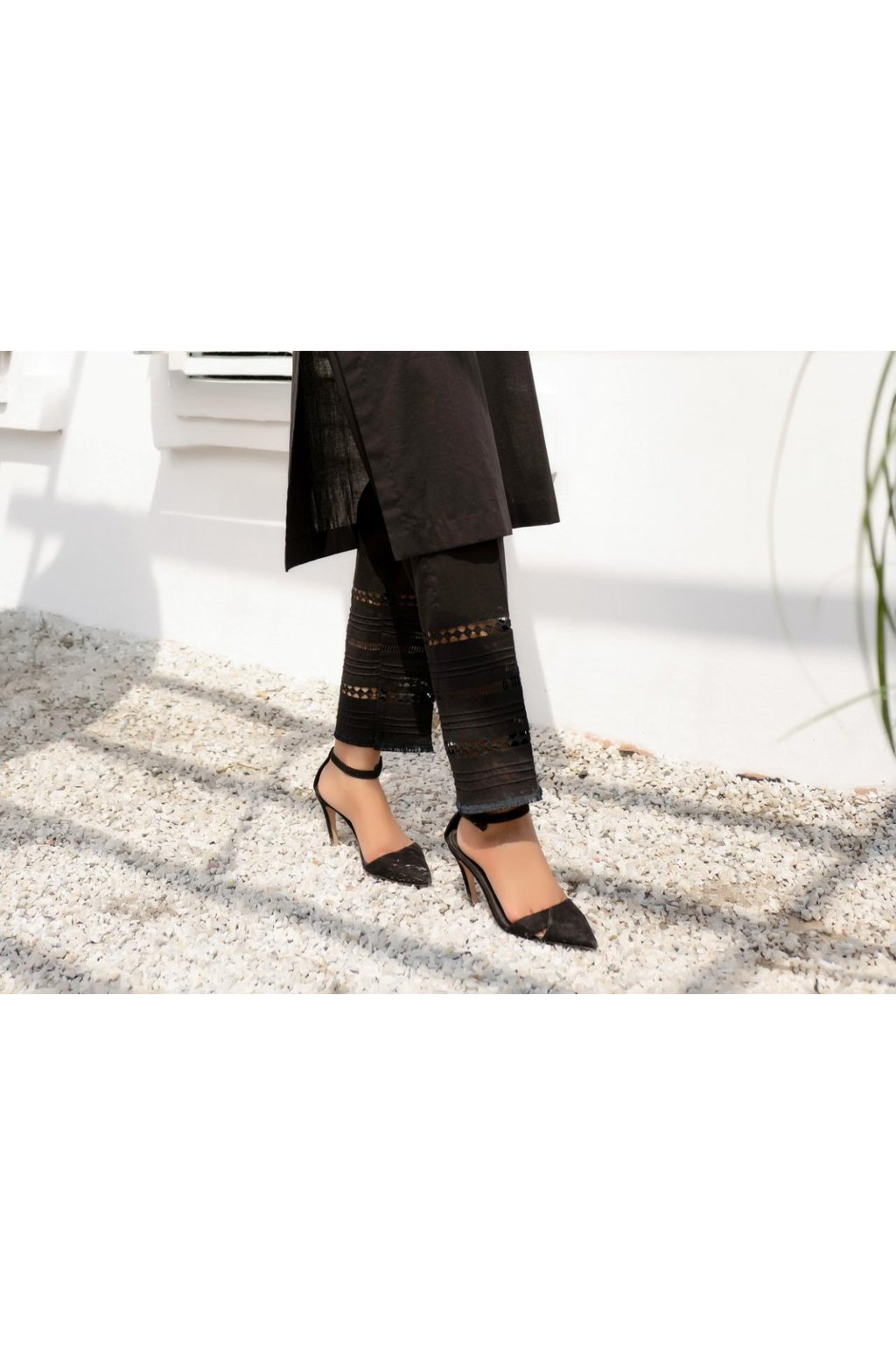 Straight Cotton Trouser with lace and pleat details.
