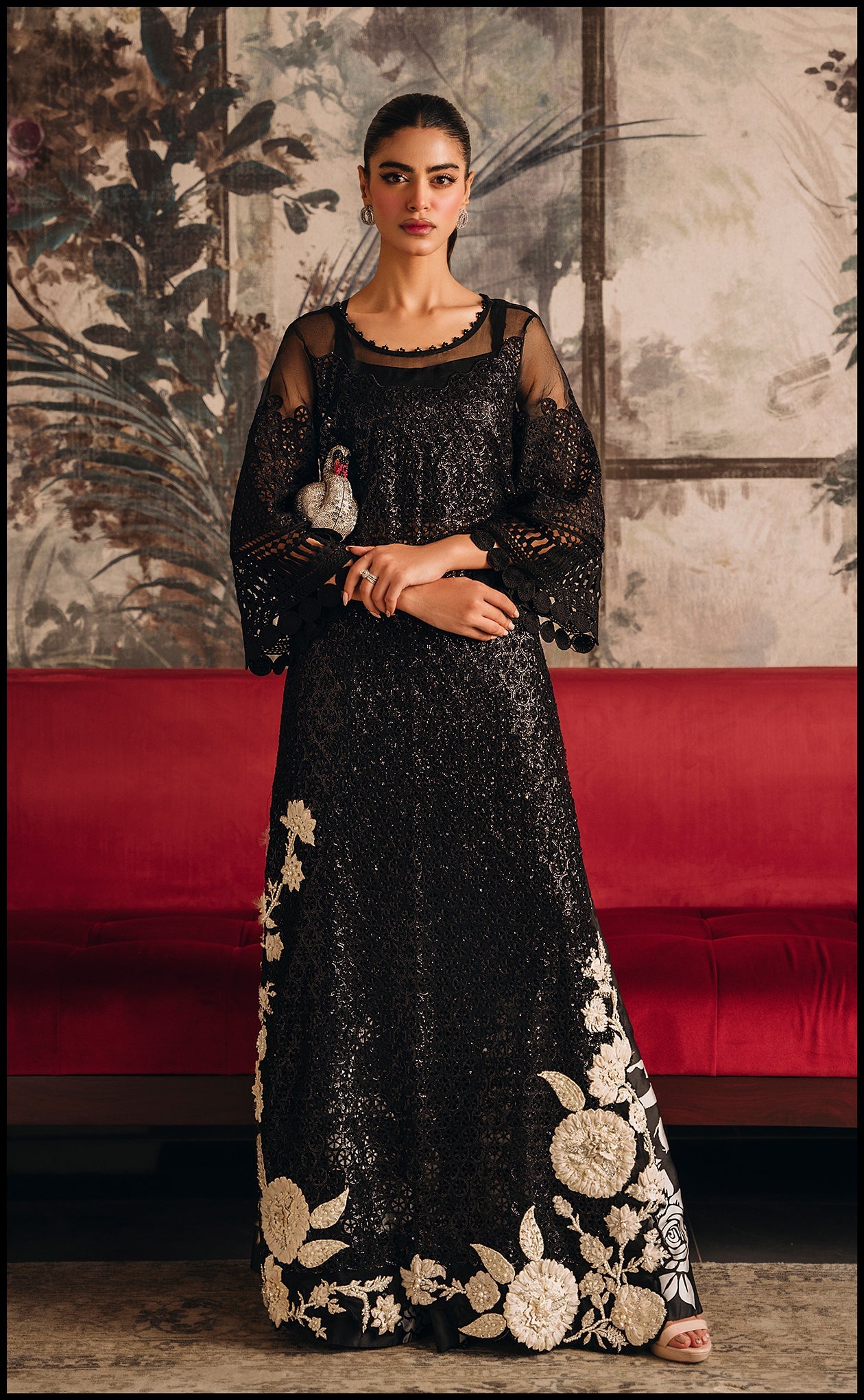 The black desert rose, chic shimer emberoiderd on the organza and embroidered white motifs having a 3d embellishments. Its a long chic silhouette paired with embroidered silk pants. A cutwork look with a geometrical pattern defines the beauty of this collection.