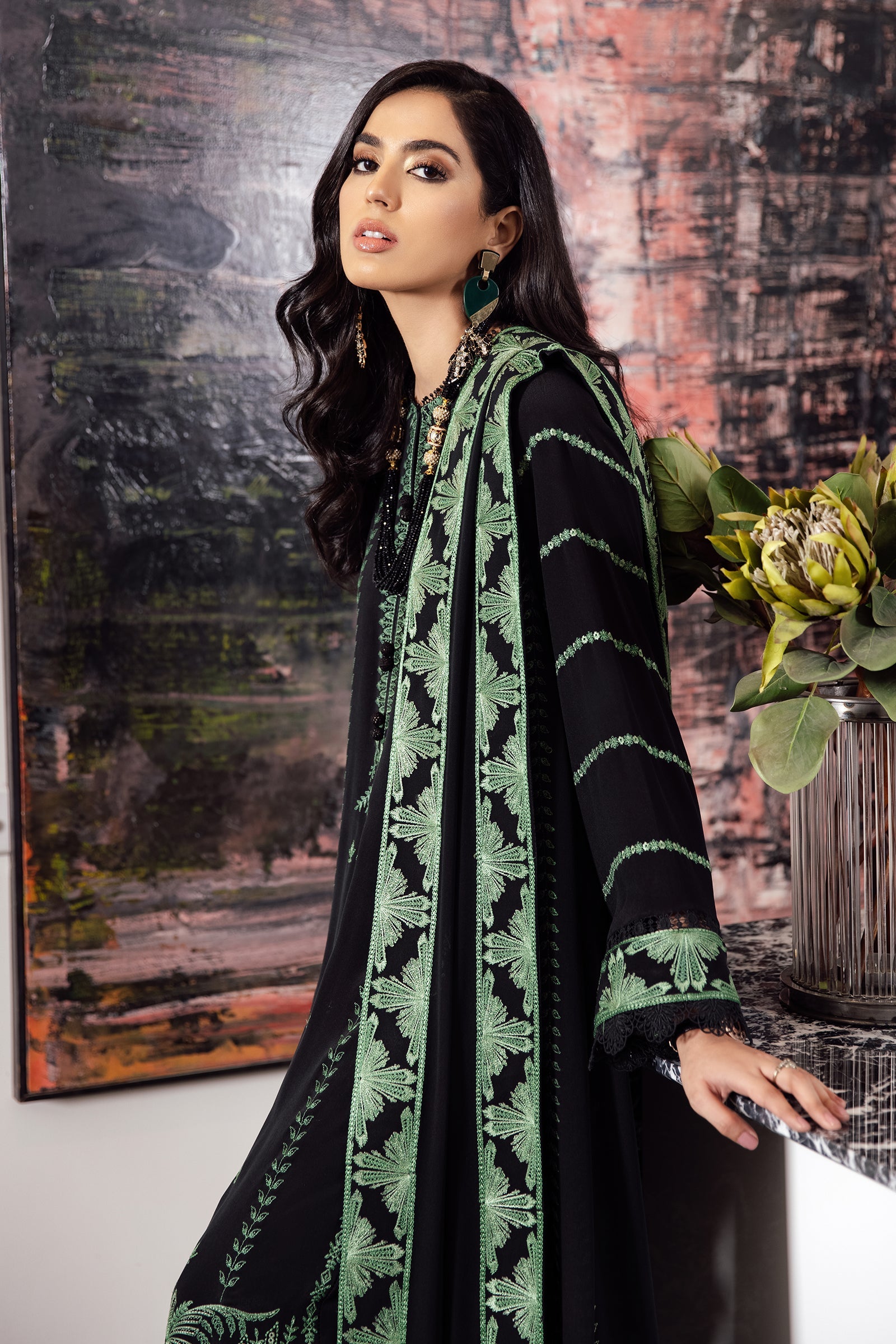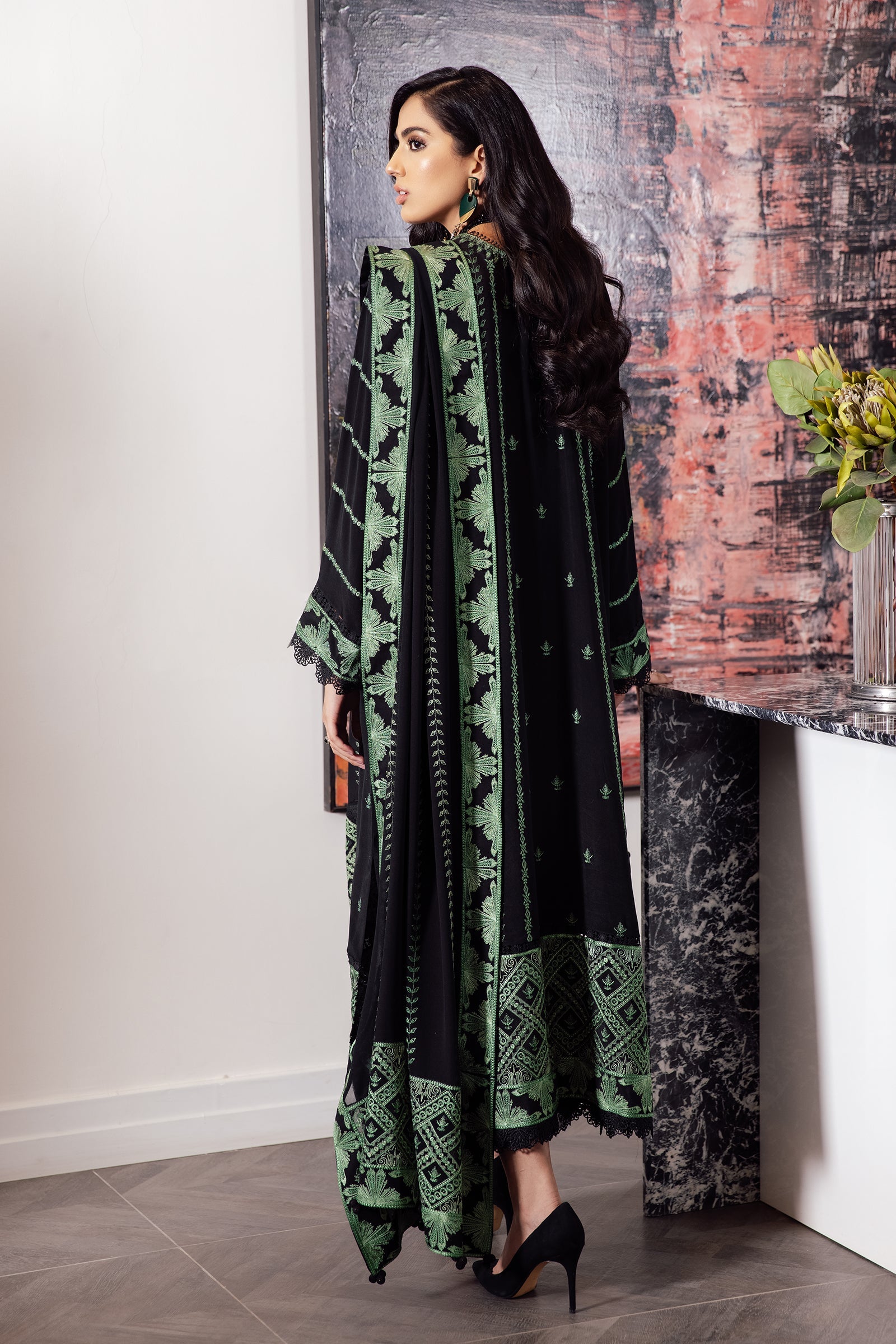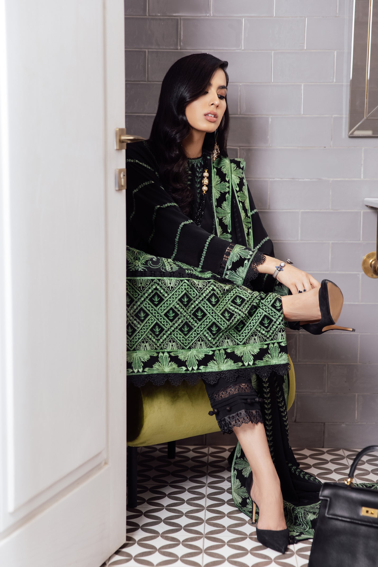 A classically elegant look, 'Black Sage' features beautifully rendered floral embroidery in sage silk thread on a sooty black canvas. Layered with a fully embroidered dupatta and tonal pants, this versatile ensemble can easily be taken from day to night occasions!
