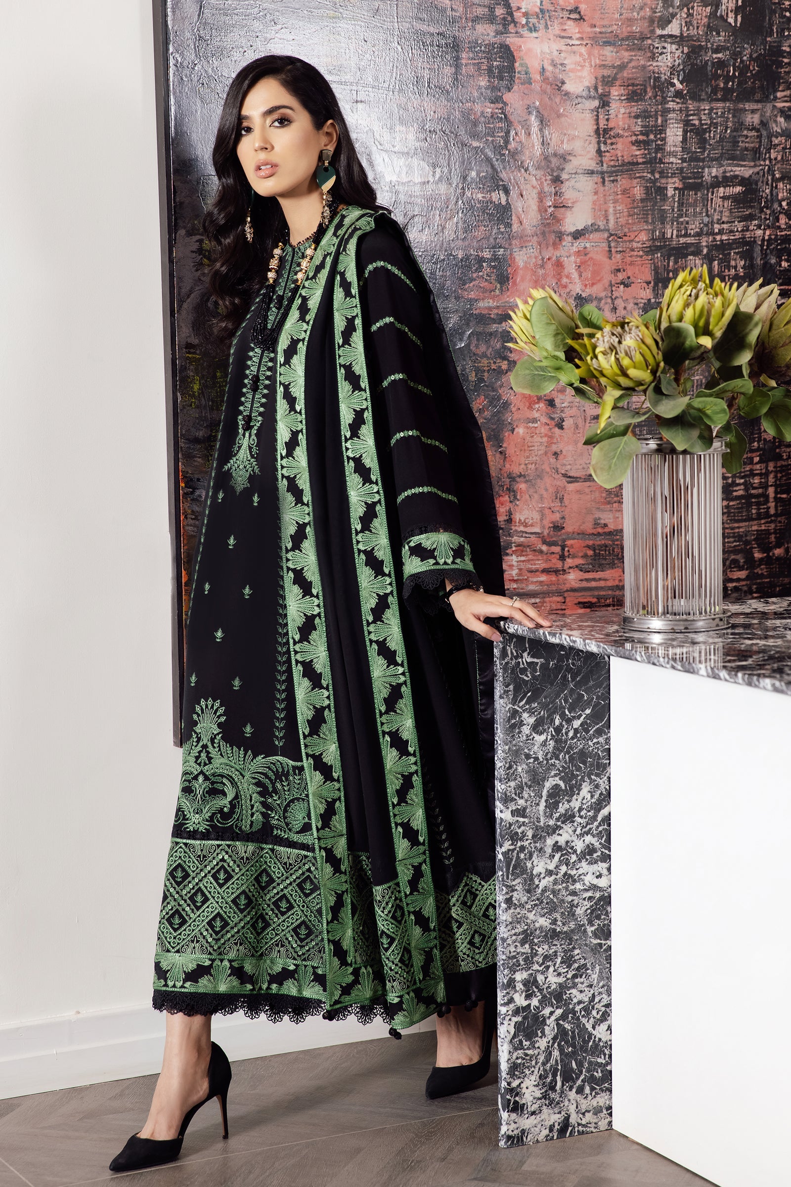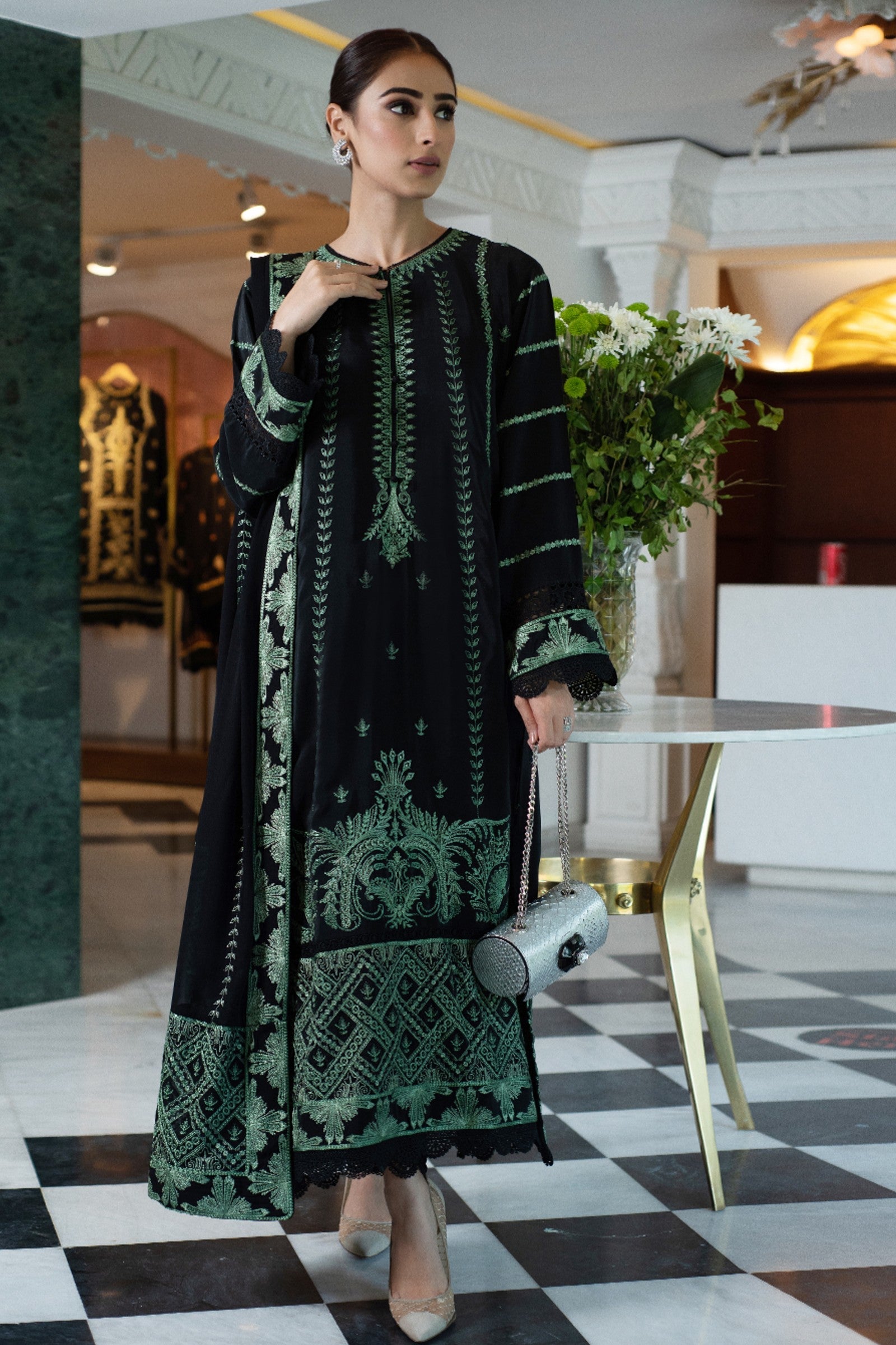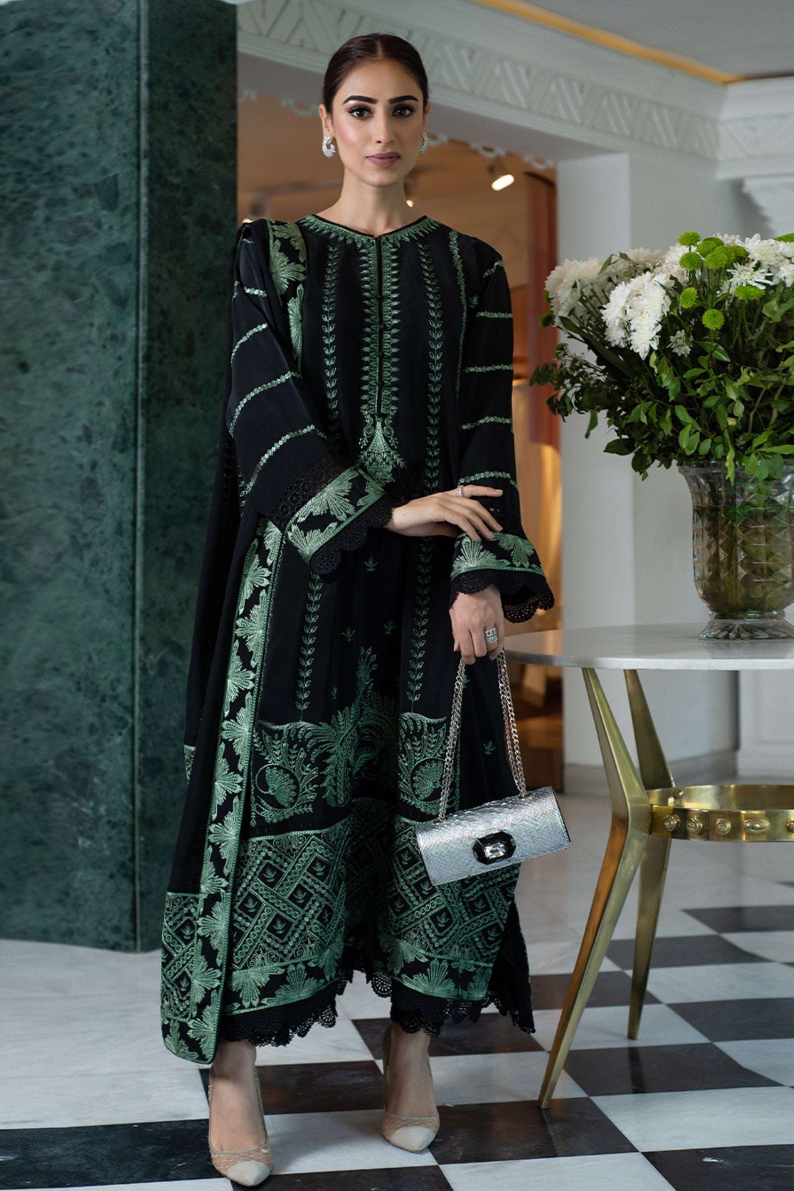 A classically elegant look, 'Black Sage' features beautifully rendered floral embroidery in sage silk thread on a sooty black canvas. Layered with a fully embroidered dupatta and tonal pants, this versatile ensemble can easily be taken from day to night occasions!