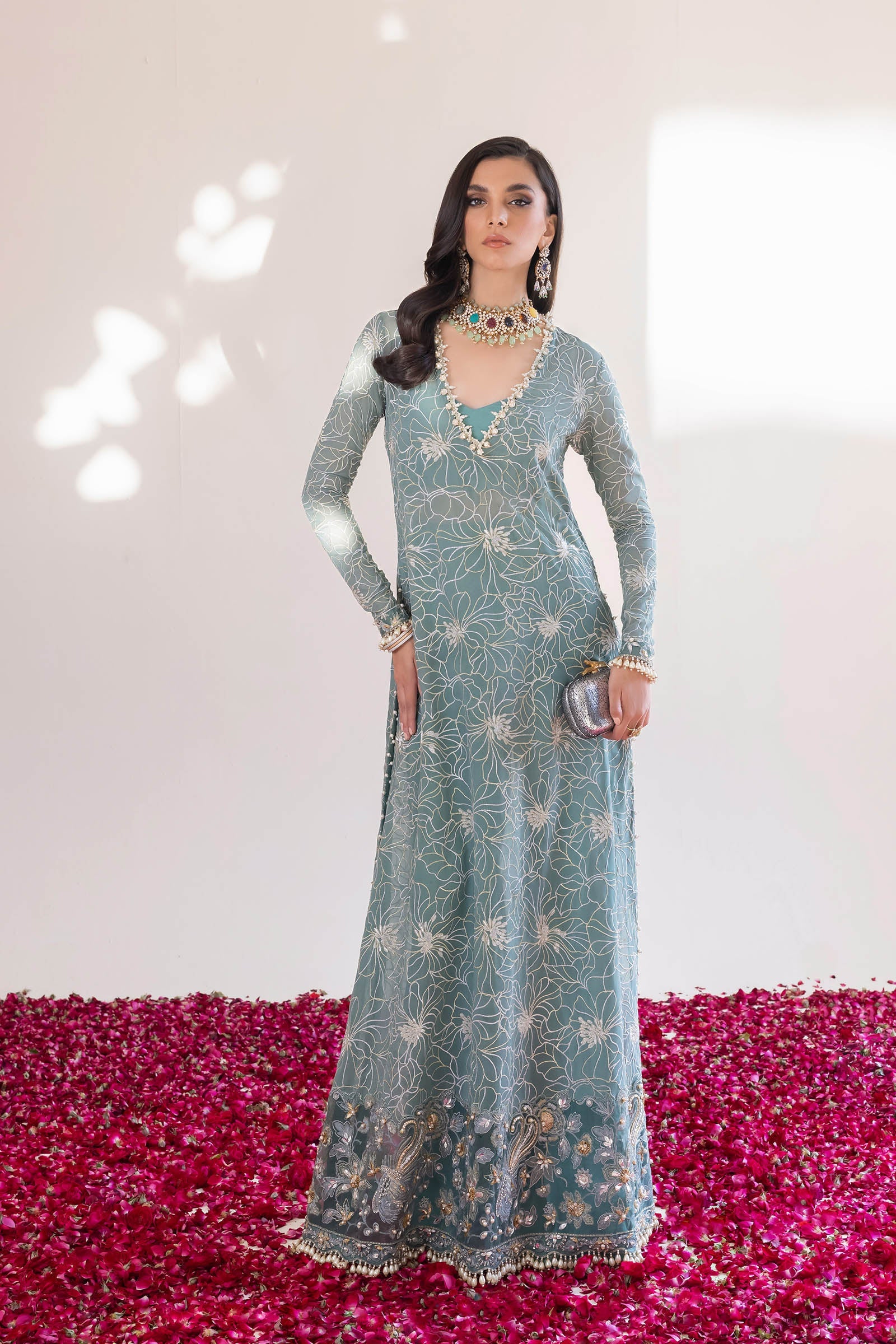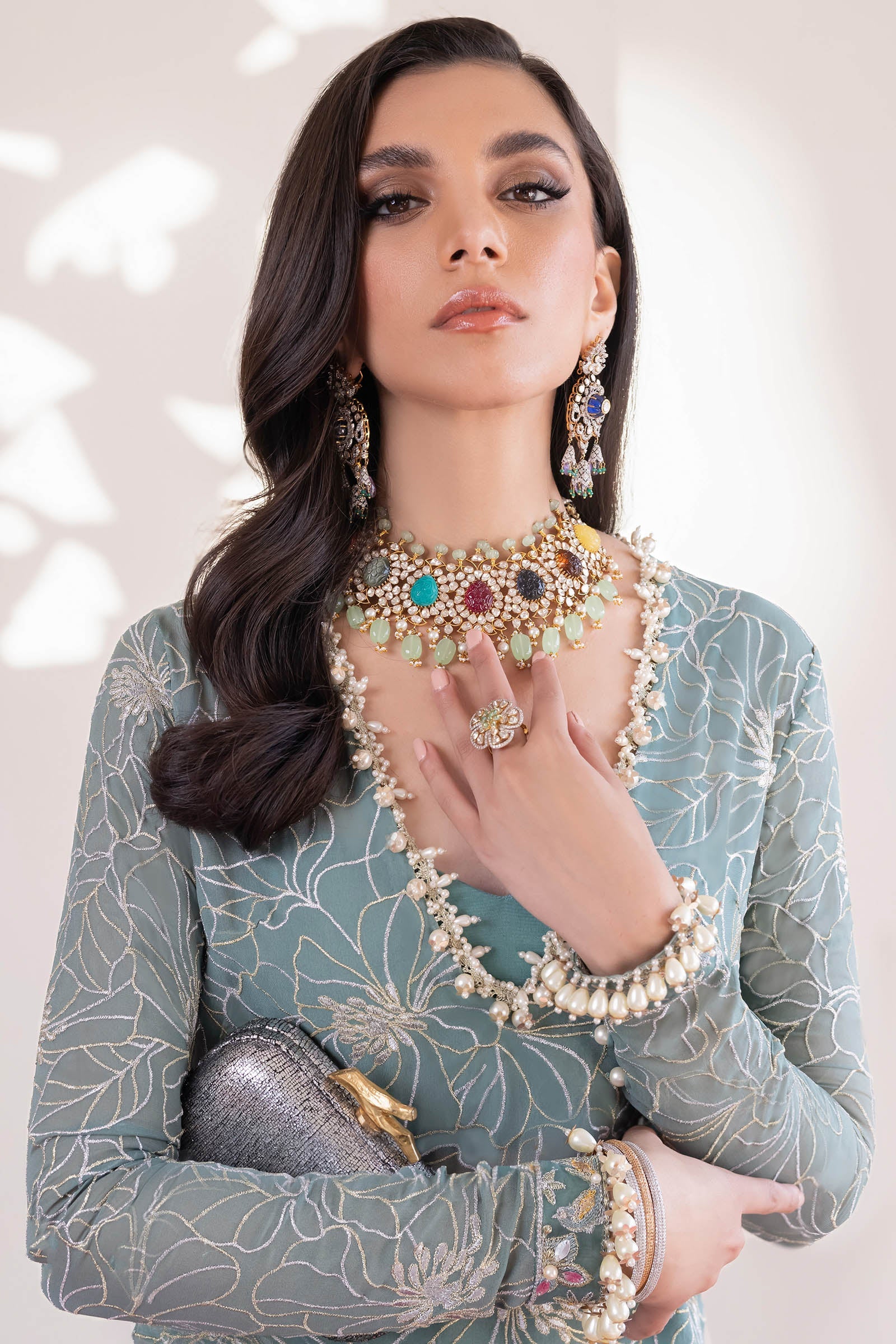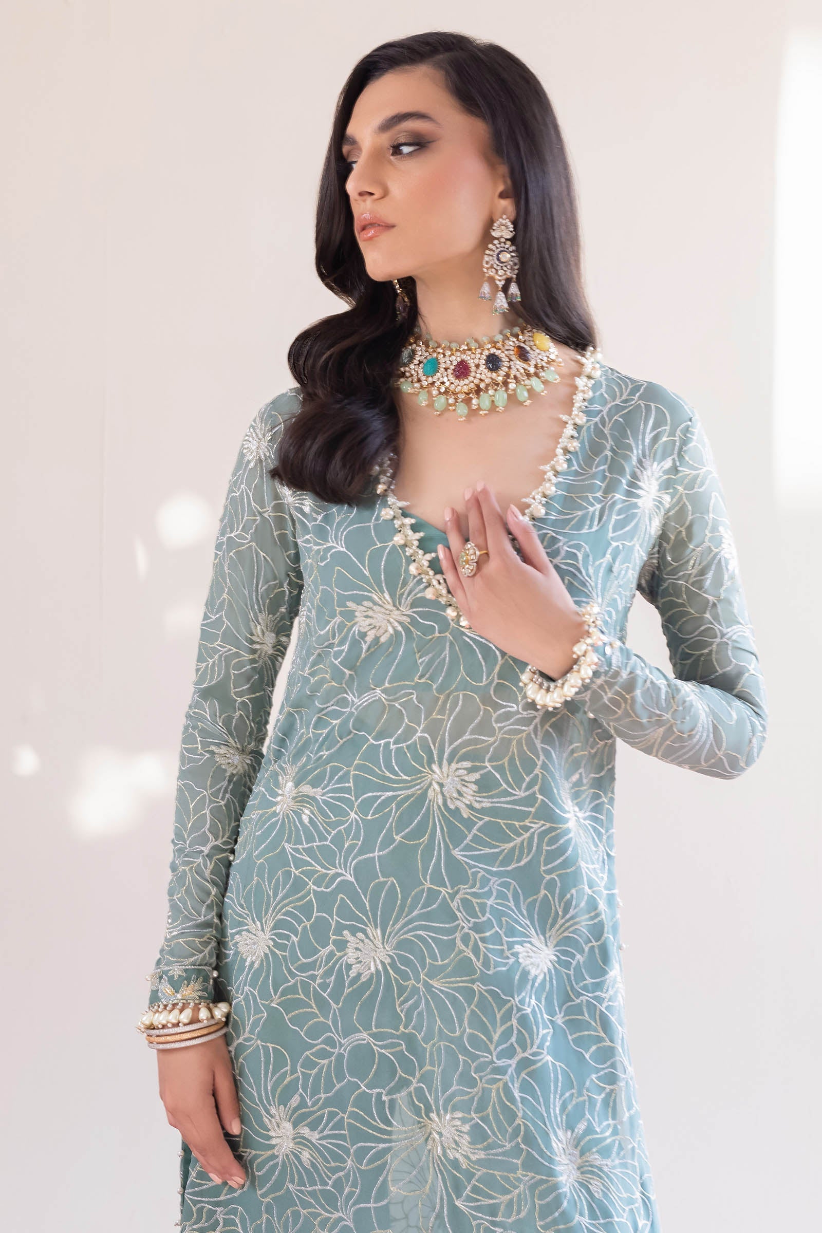 Delicate florals stretch out in moonlit tendrils on the cool powder blue canvas of ‘Bleu Étoile’. The design features a scintillating whorl of intricate flowers laid out in silvery tilla to create for a mesmerising composition. Framed with a finely detailed border, this classic design truly epitomises refined elegance.