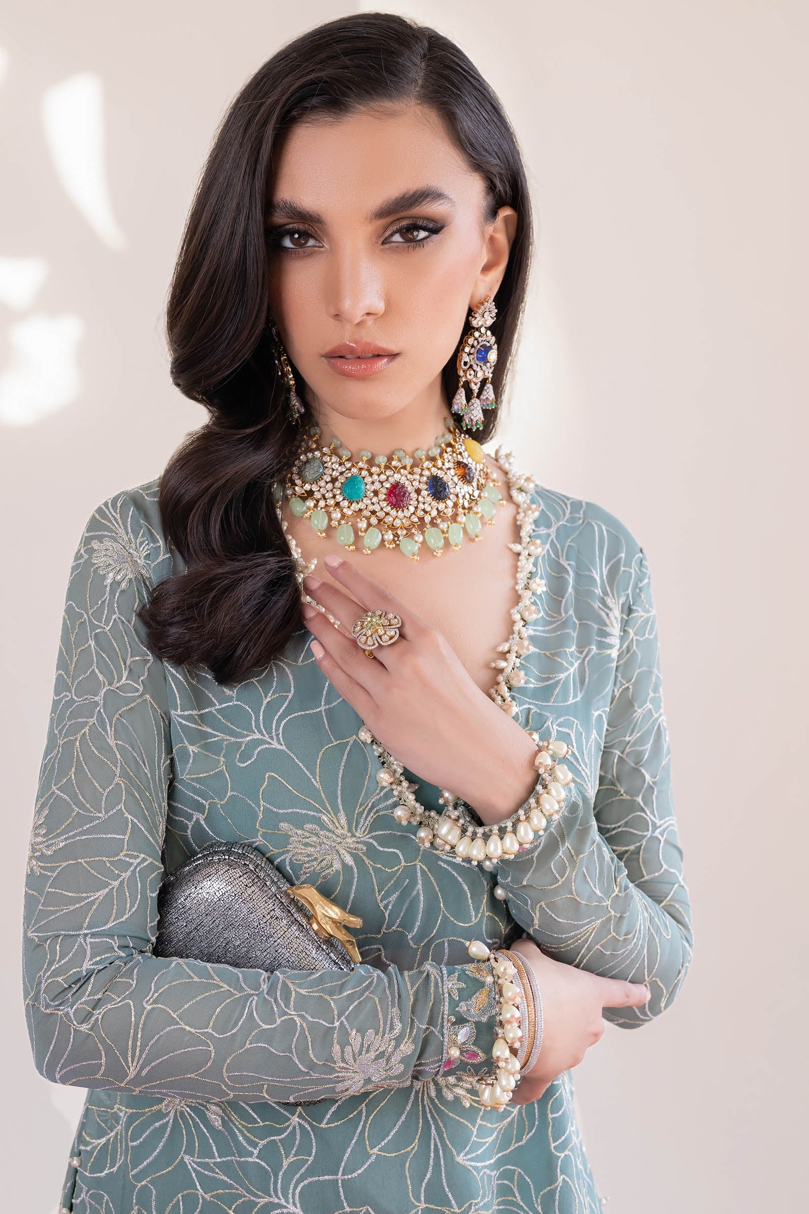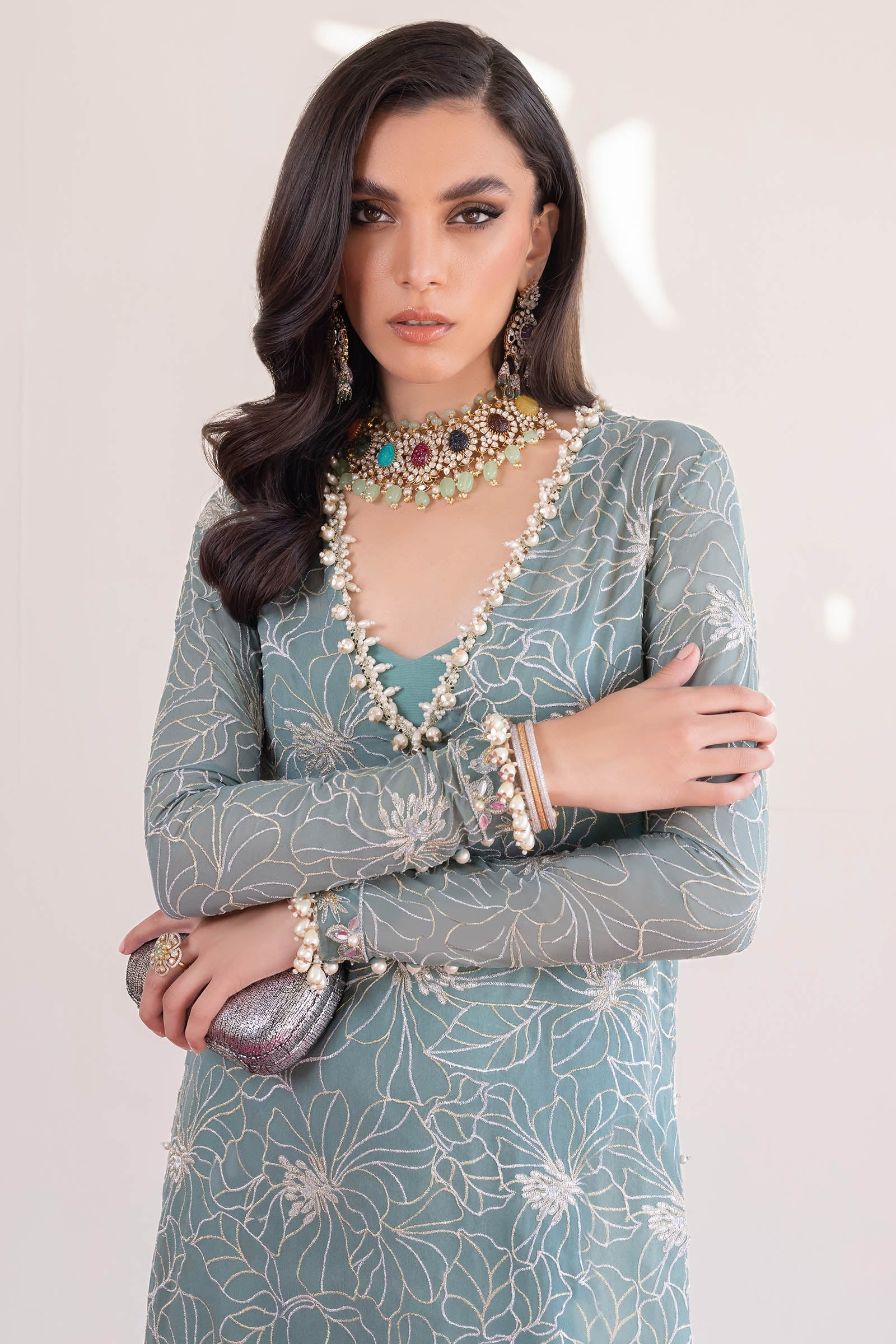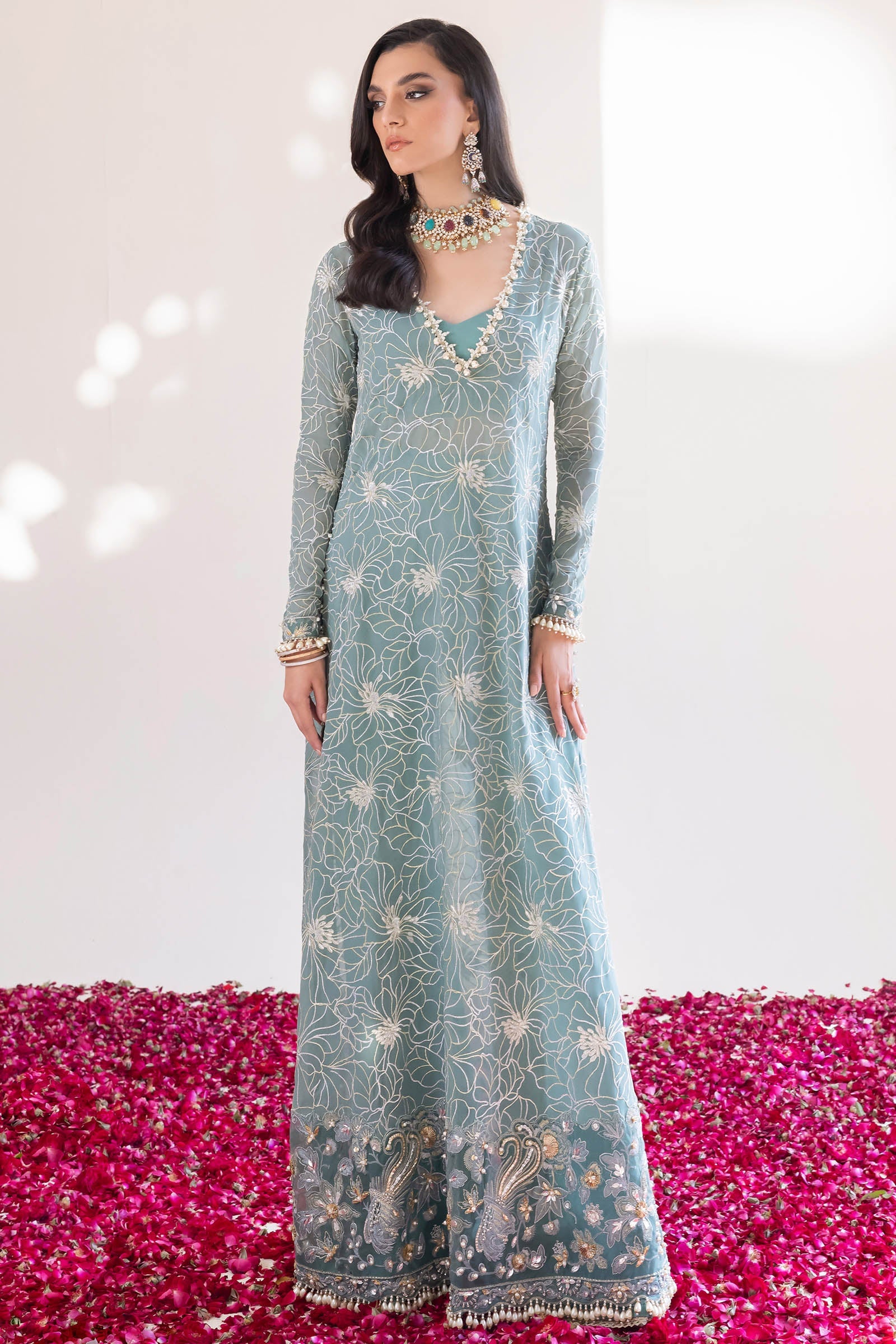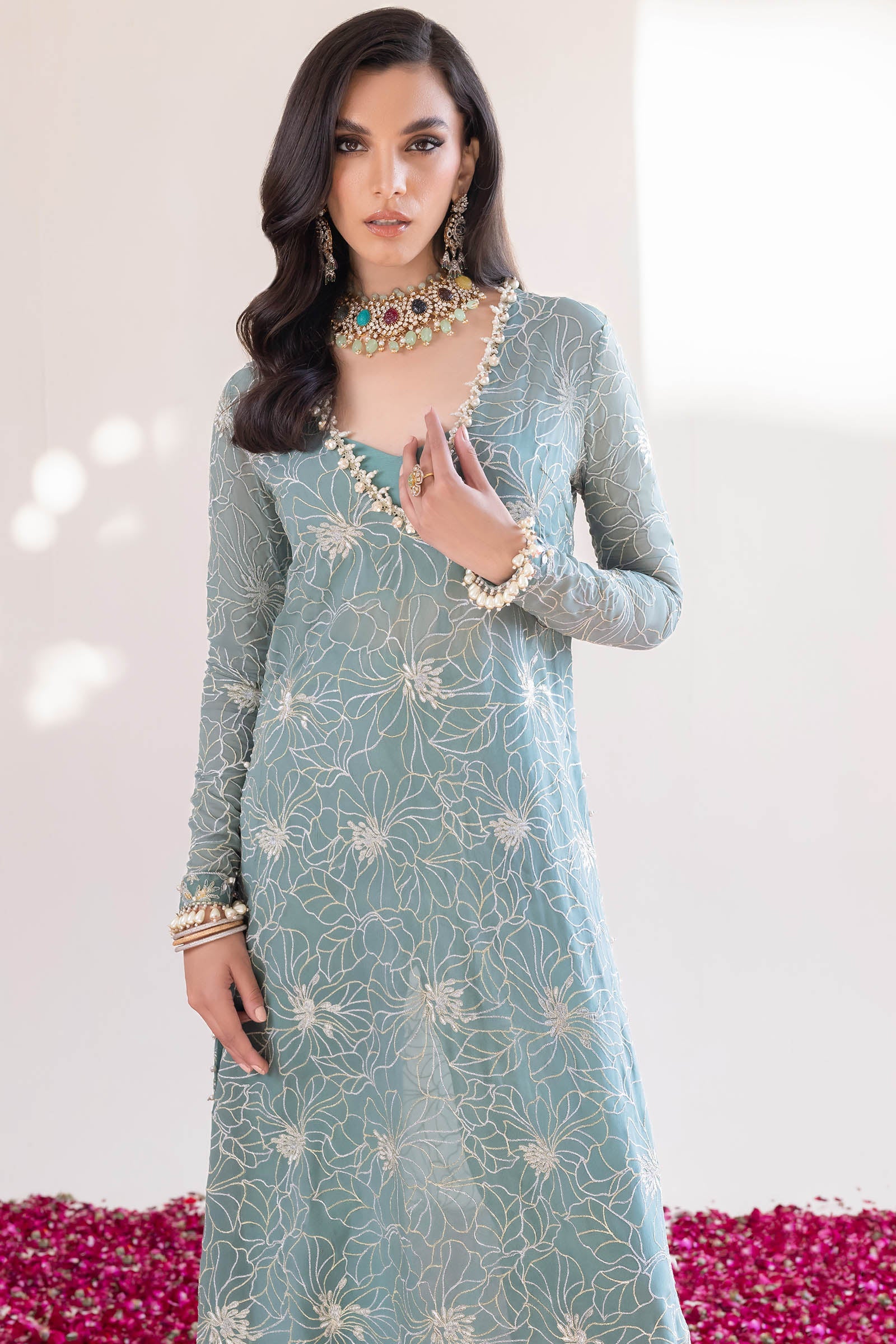 Delicate florals stretch out in moonlit tendrils on the cool powder blue canvas of ‘Bleu Étoile’. The design features a scintillating whorl of intricate flowers laid out in silvery tilla to create for a mesmerising composition. Framed with a finely detailed border, this classic design truly epitomises refined elegance.