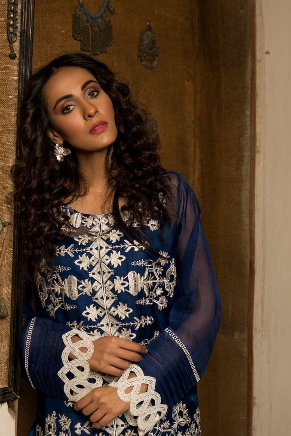 Blue organza geometric embroidered kurta with pleating and lace detailing. Paired with silk pants with lace on the side.