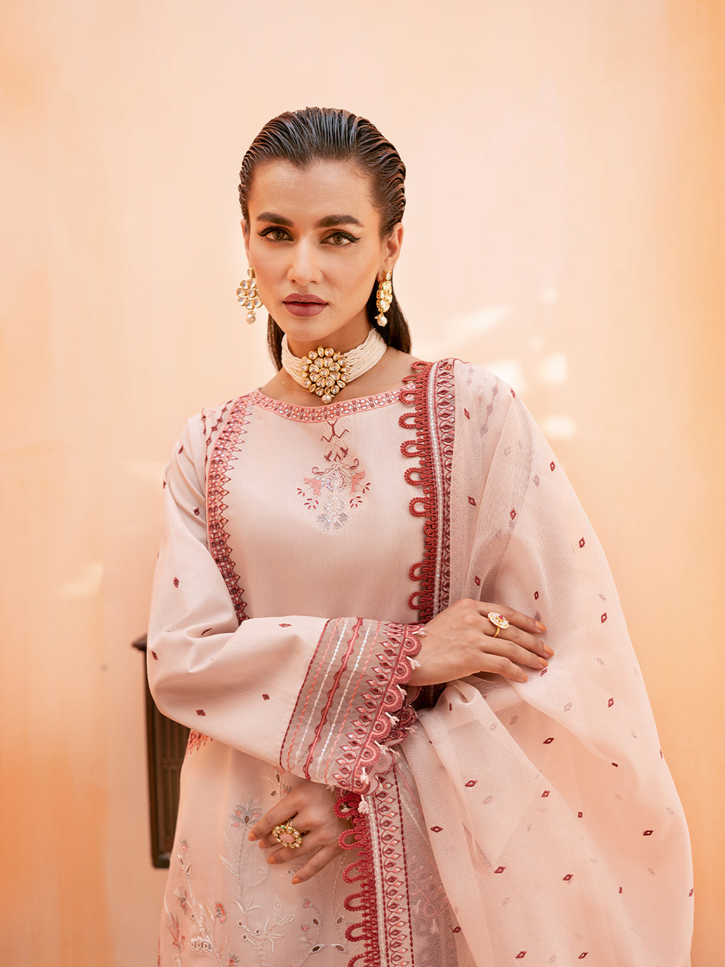 Rendered in pastel blush pink, this graceful straight fit shirt features astonishing embroideries / chikankari in contrasting shades of pink and ivory. Completing the look with straight pants and khaddi net dupatta enhanced with lace finishing.