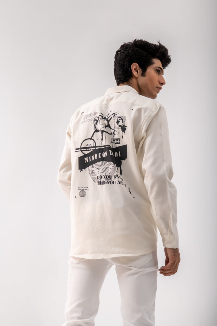 Drop Shoulder Spread Collar Shirt Featuring Printed Artwork On Back And Front, Long Sleeves With Buttoned Cuffs, And Button Up Front.