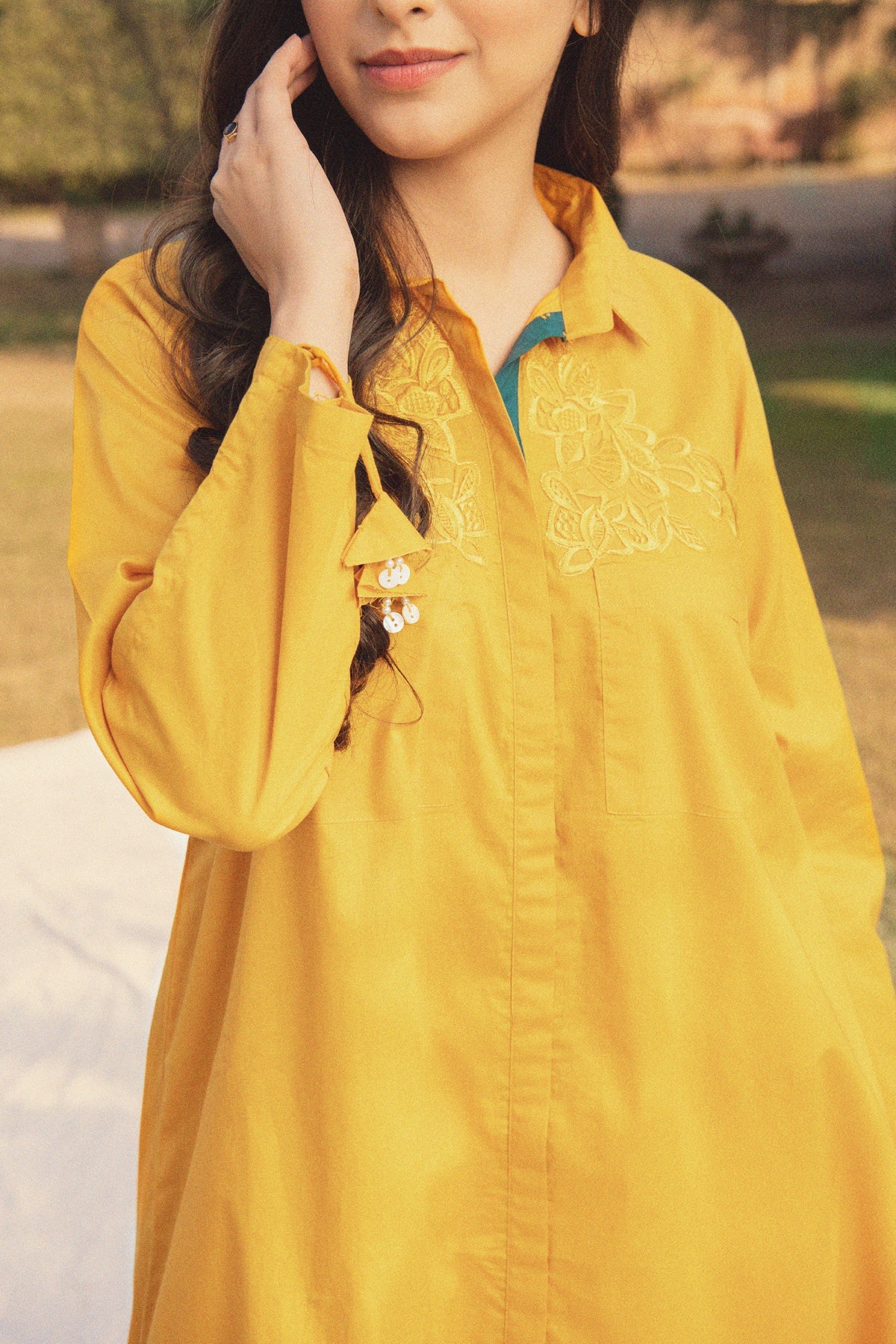Cut Work Embroidered Cambric Shirt And Placket Detail With Color Trim.