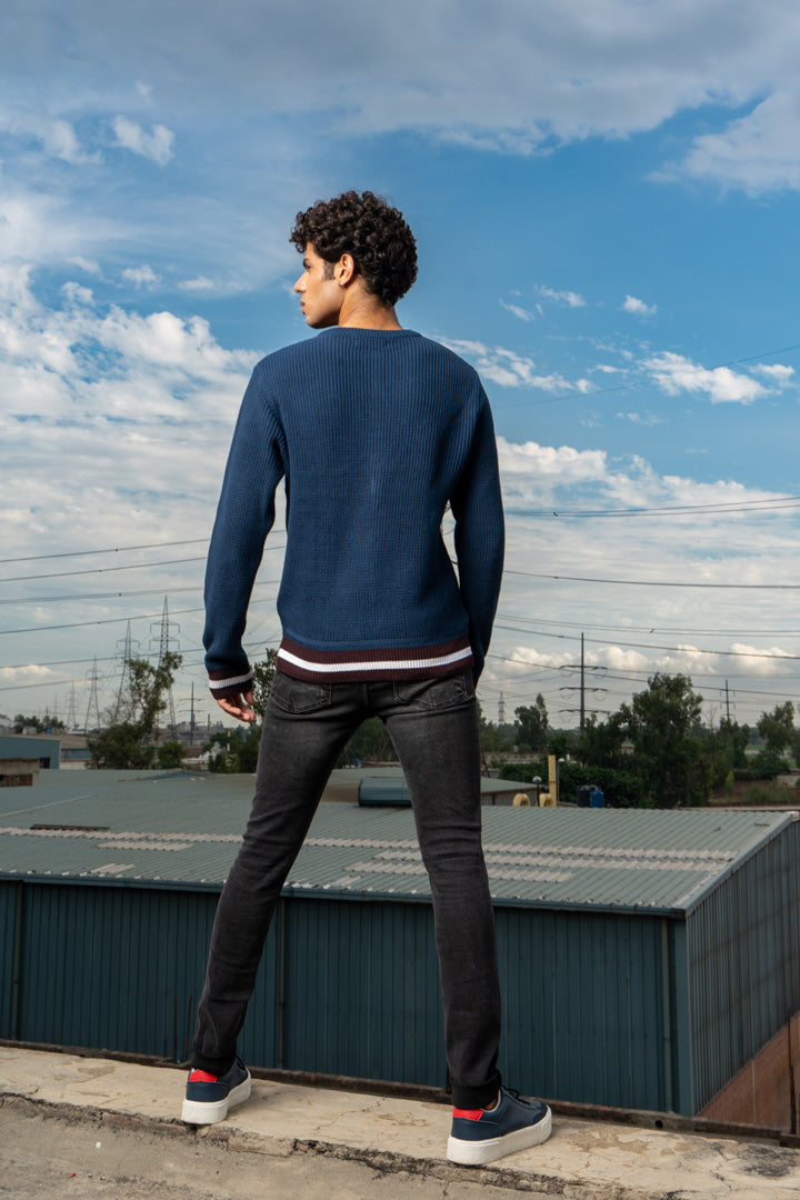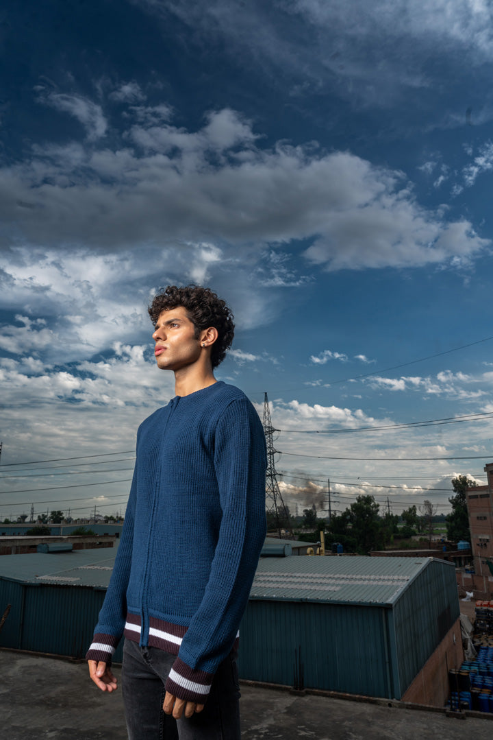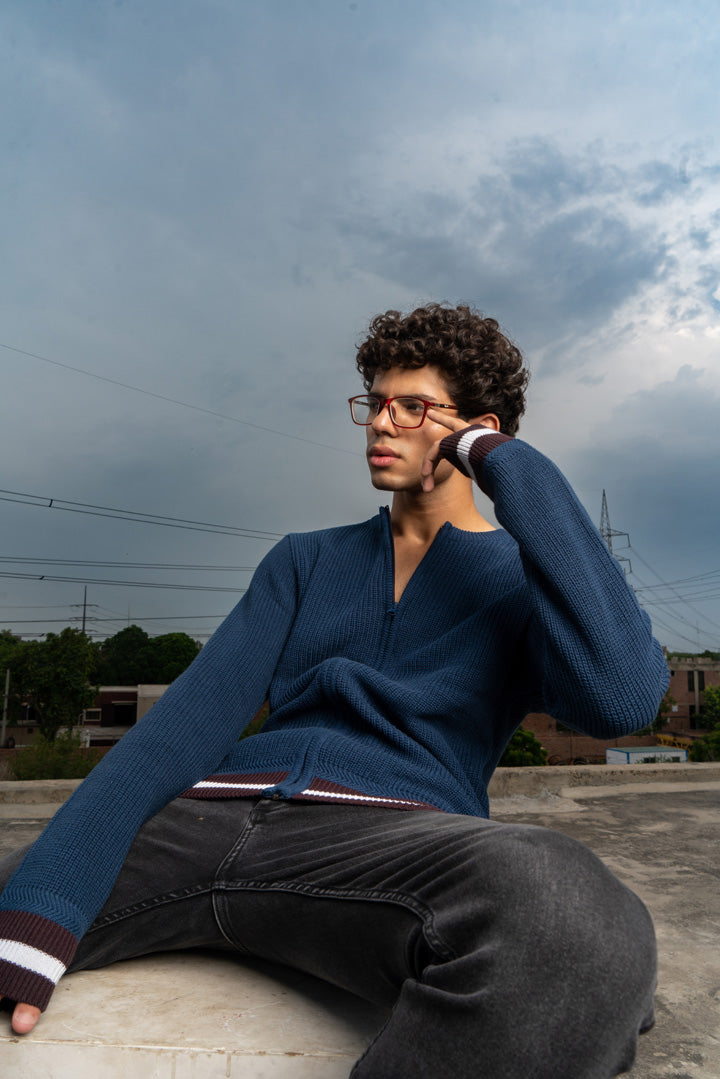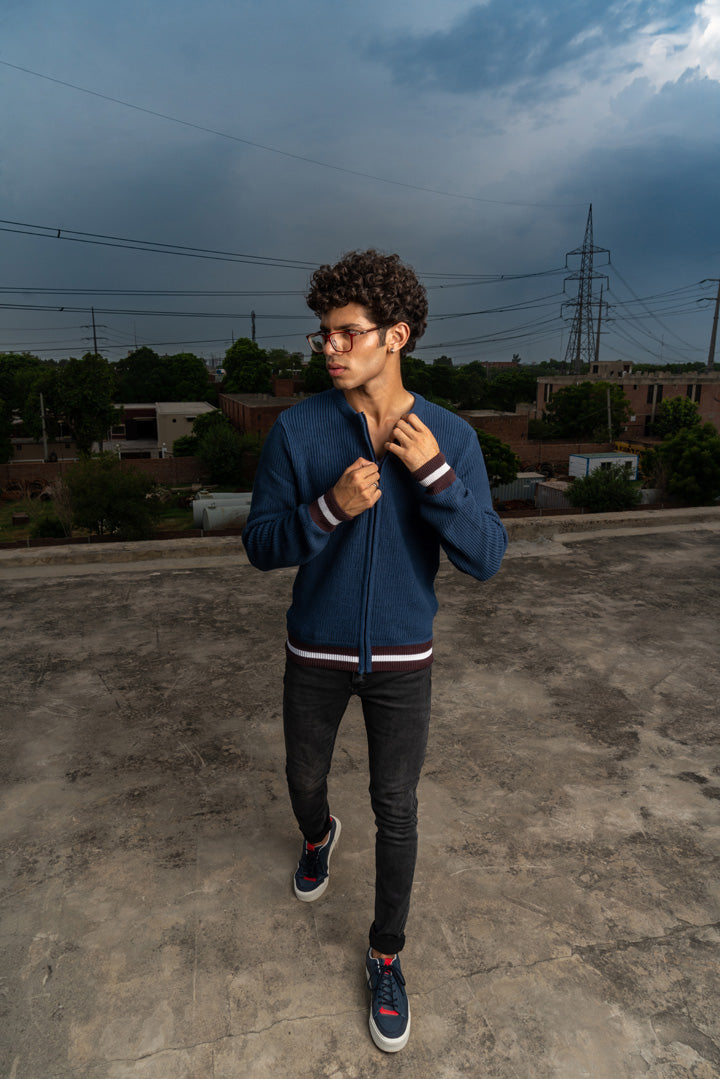Blue Zipper Sweater With Striped Hemline And Sleeve Borders