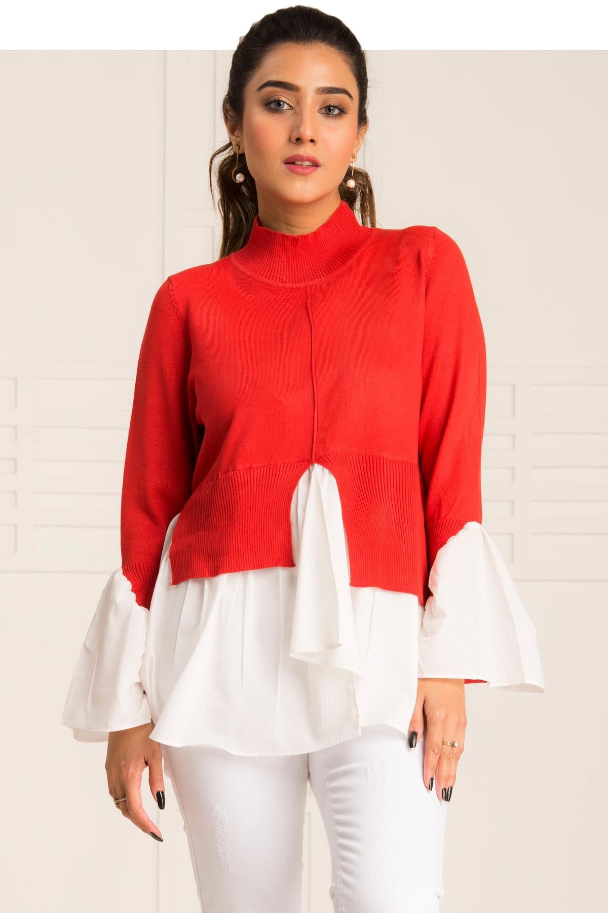 Double Shade Comfy Sweaters In Red And White, Designed With Trendy Sleeves To Give A Chic Look.