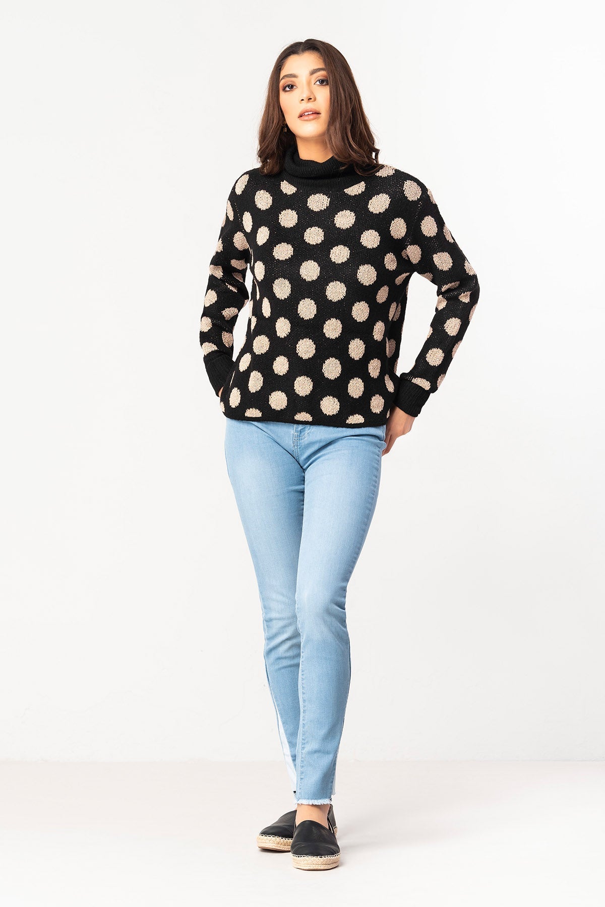 Lady In Black With Polka Dot Design, Mock Turtleneck With Raglan Sleeves.