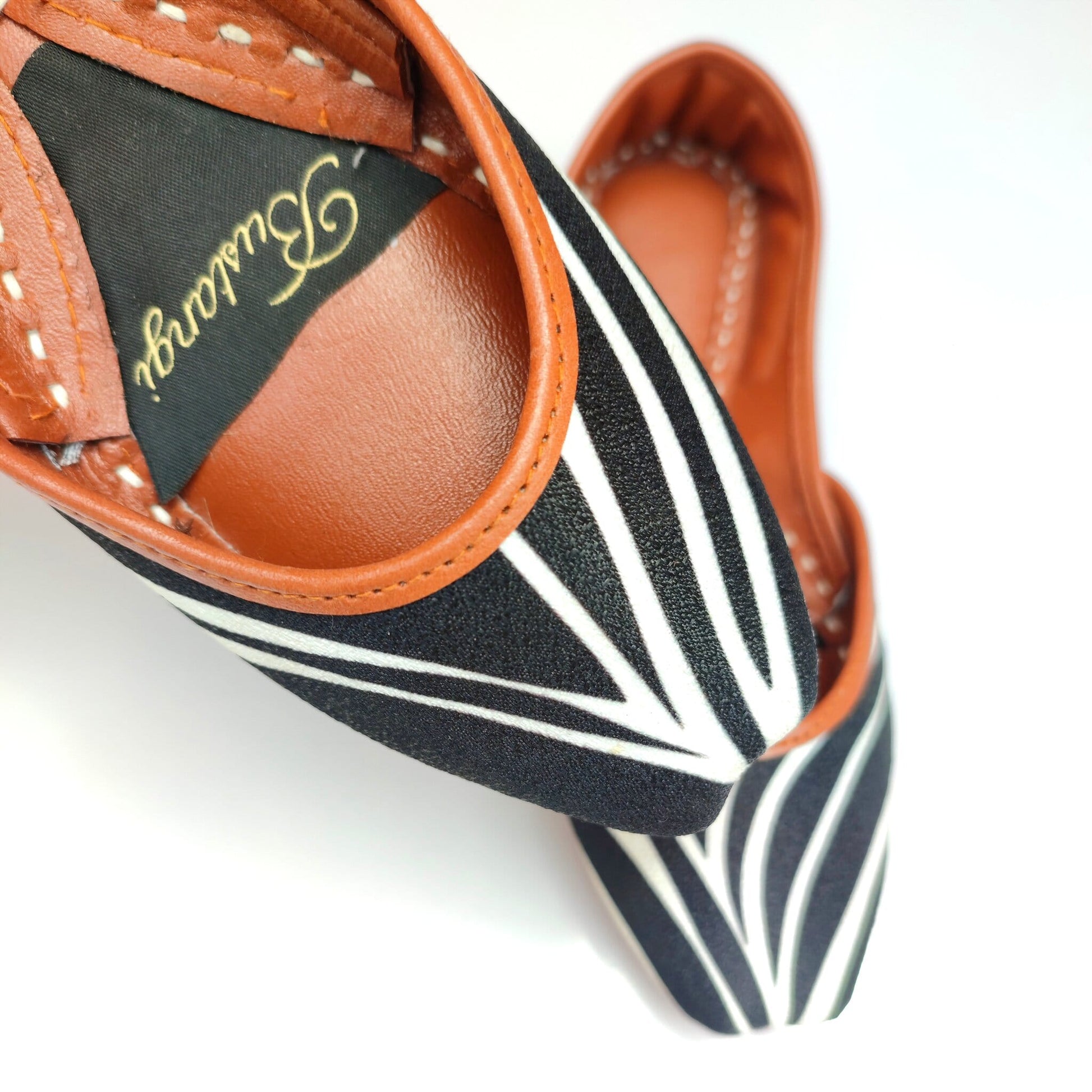Bustangi's swril Ladies khussa comes in black color. These are flat casual shoes. It has a printed swril in black and white color on top. Leather Sole and double padding is used for extra comfort. Necklines are also scalloped to avoid discomfort.
