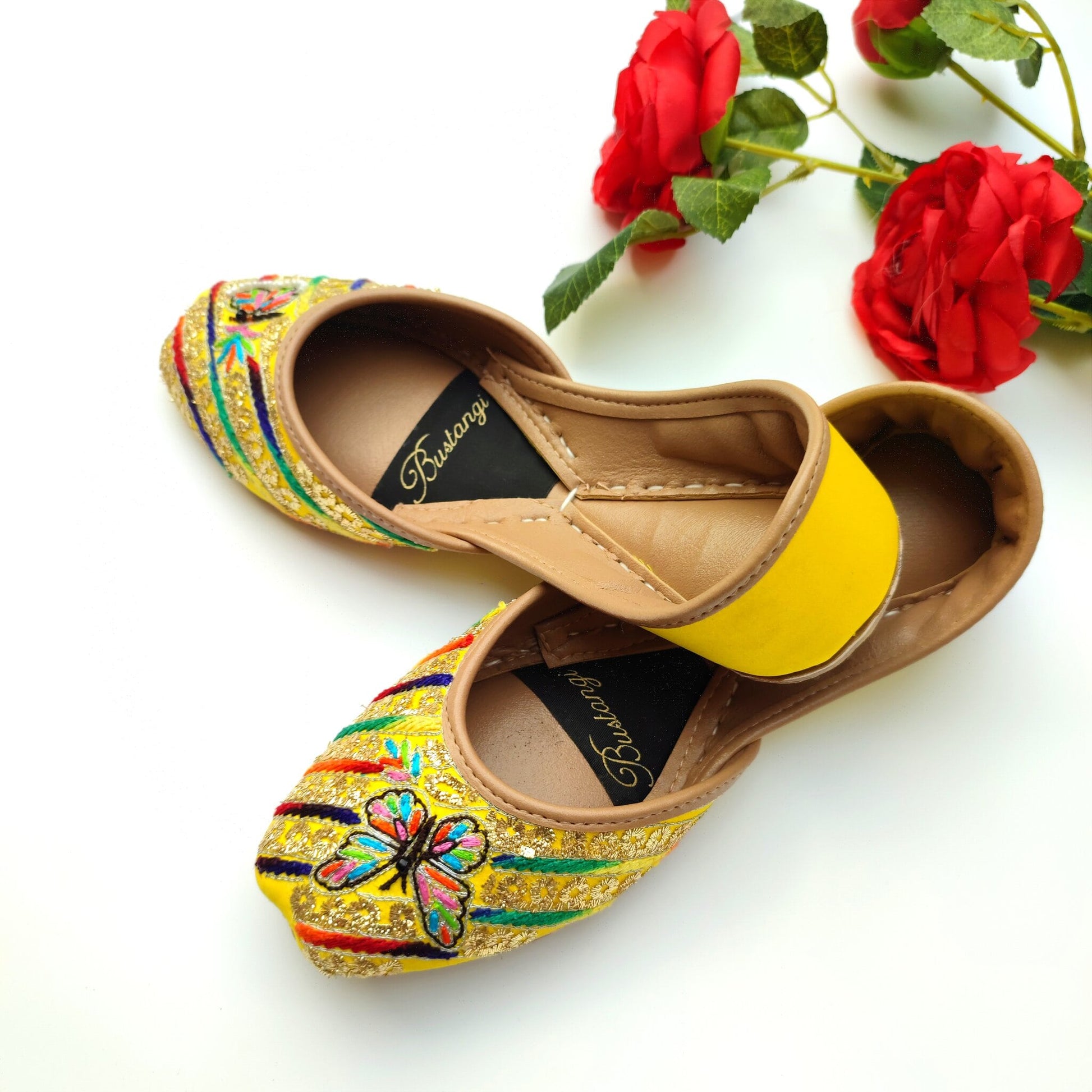 Shining like sun with awesome embellishment. This is flat embroidery Ladies khussa. Hand craft done on both back and upper with a butterfly design. Leather sole and double padding for additional comfort. Yellow color.