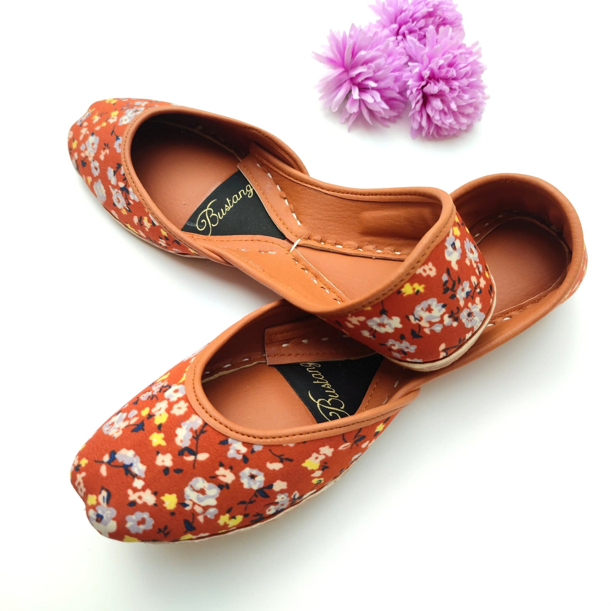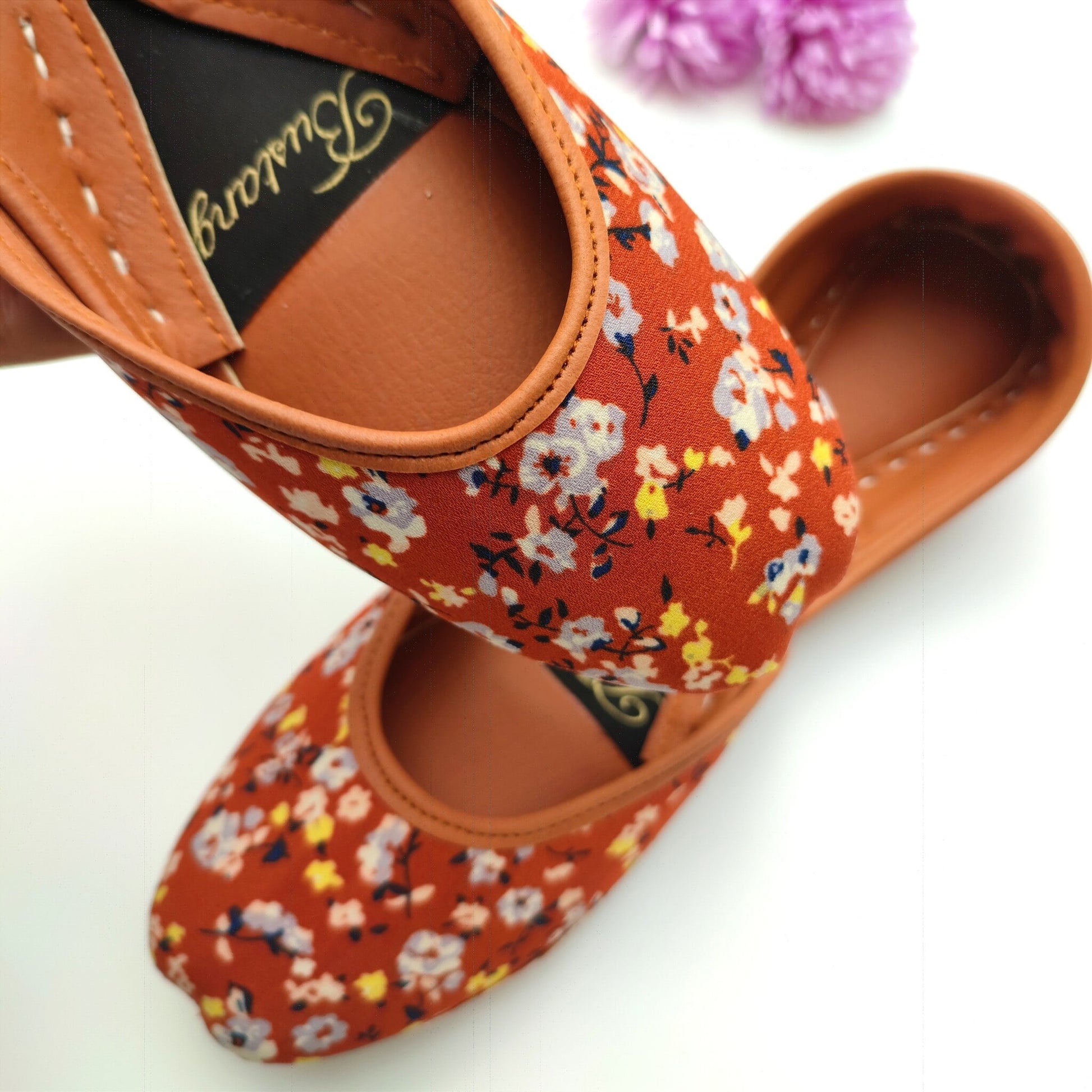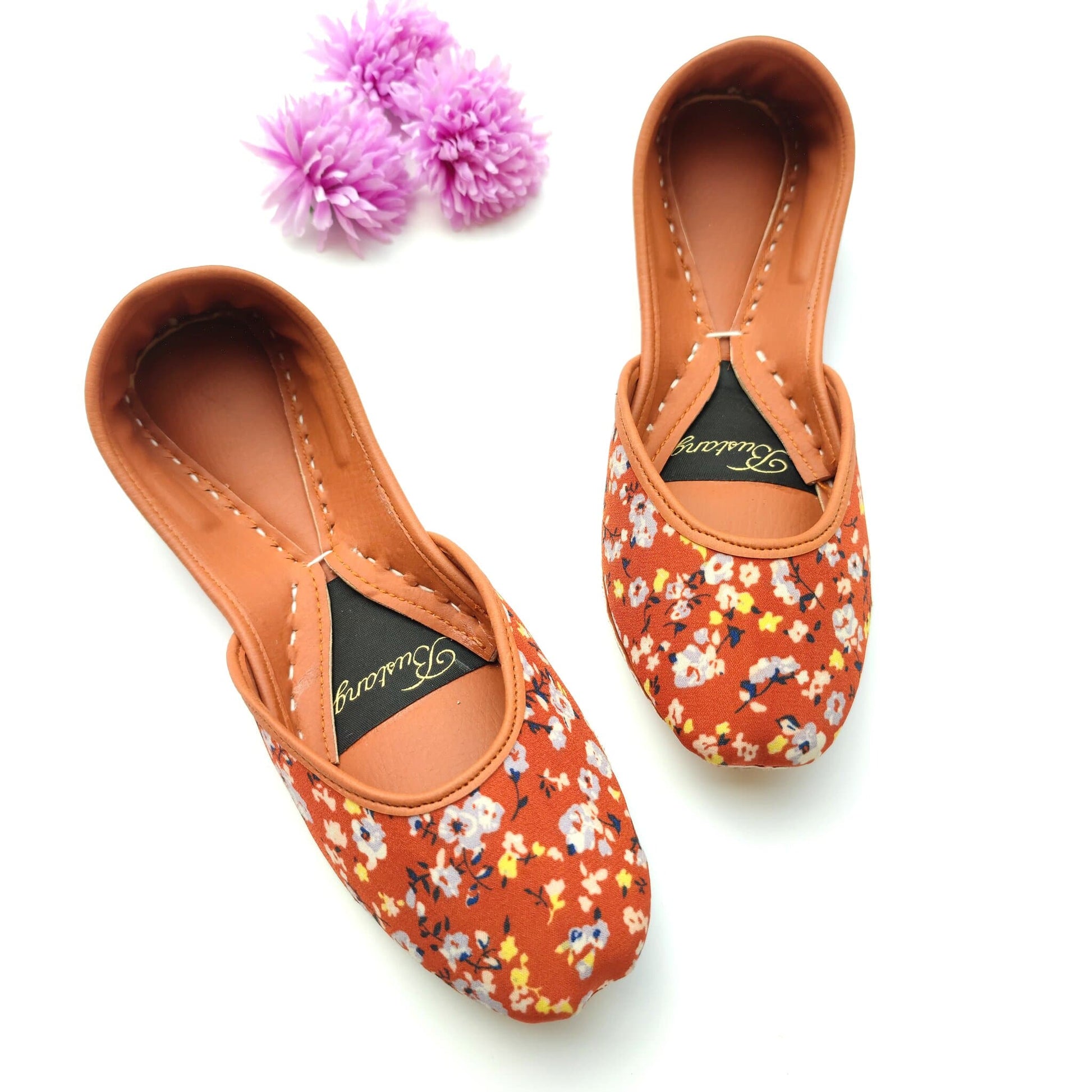Bustangi's Daffodil Casual Ladies khussa comes in Orange silk base with multi flower print on top. These are flat ethnic footwear in casual style. Leather Sole and double padding is used for extra comfort. Necklines are also scalloped to avoid discomfort.