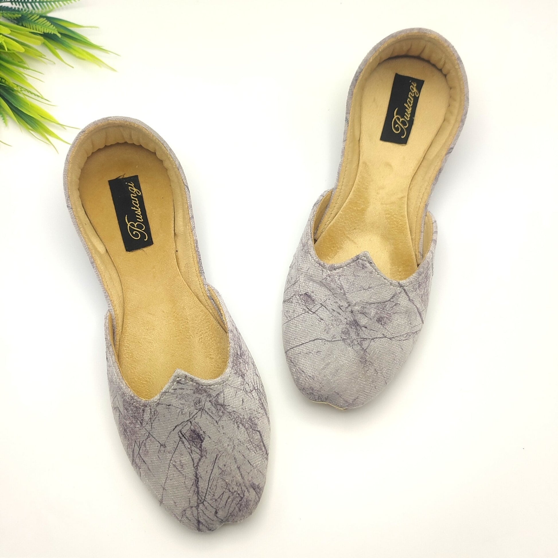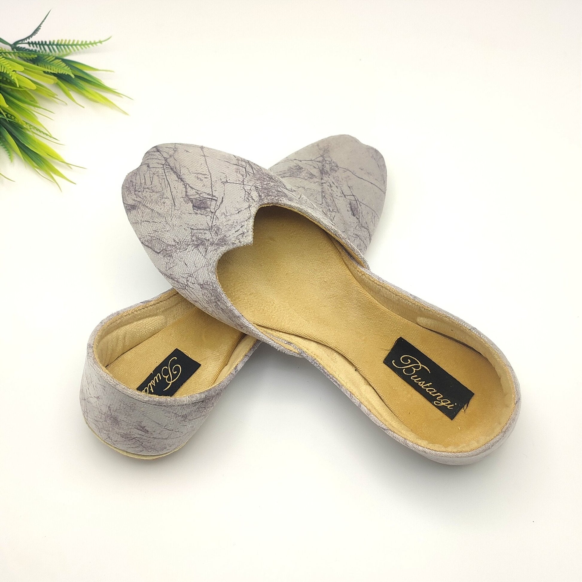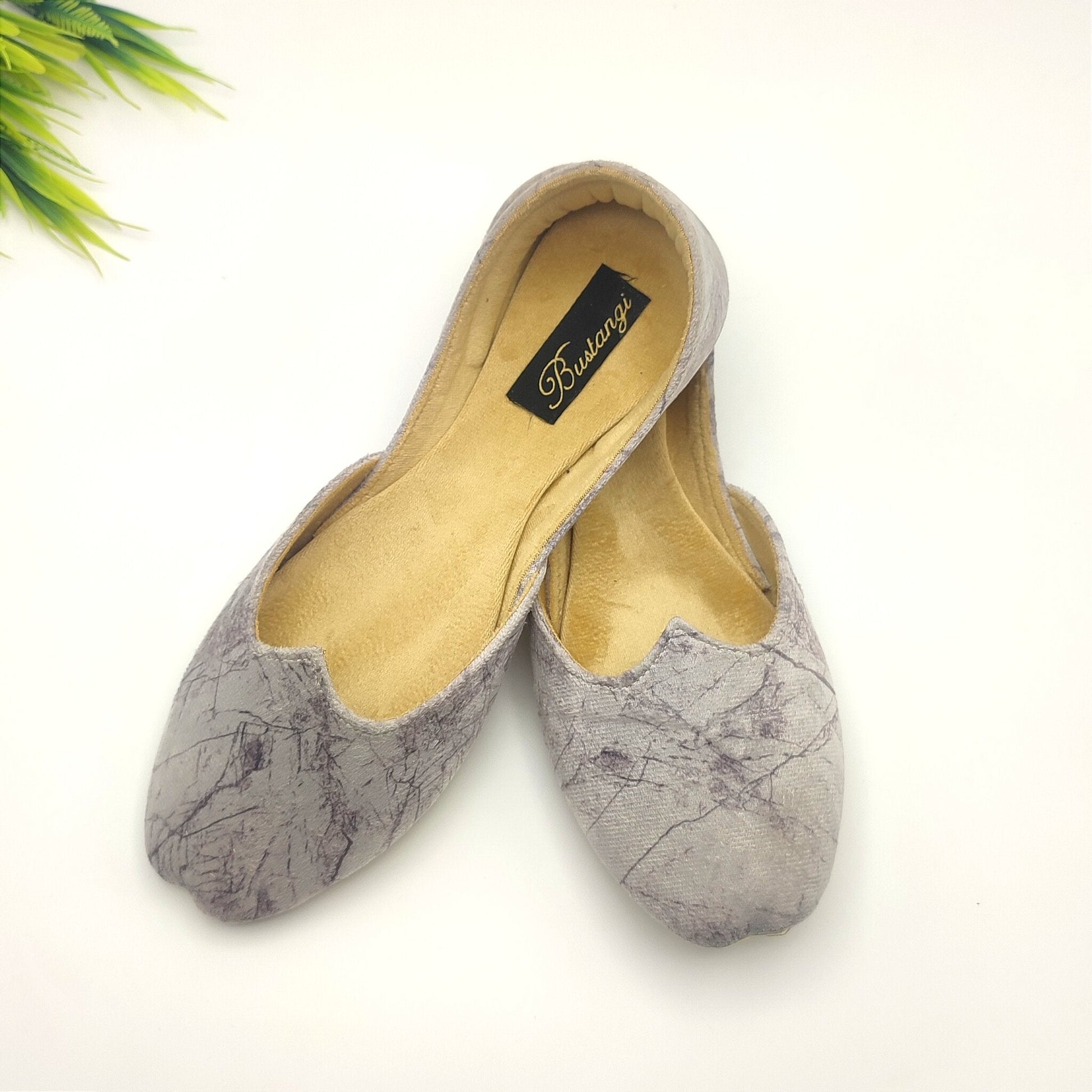 Featuring luxurious abstract lining velvet khussa along with pointed front design. Comfortable double padded cushioning is used with leather sole for additional comfort. This khussa is available in Grey color.