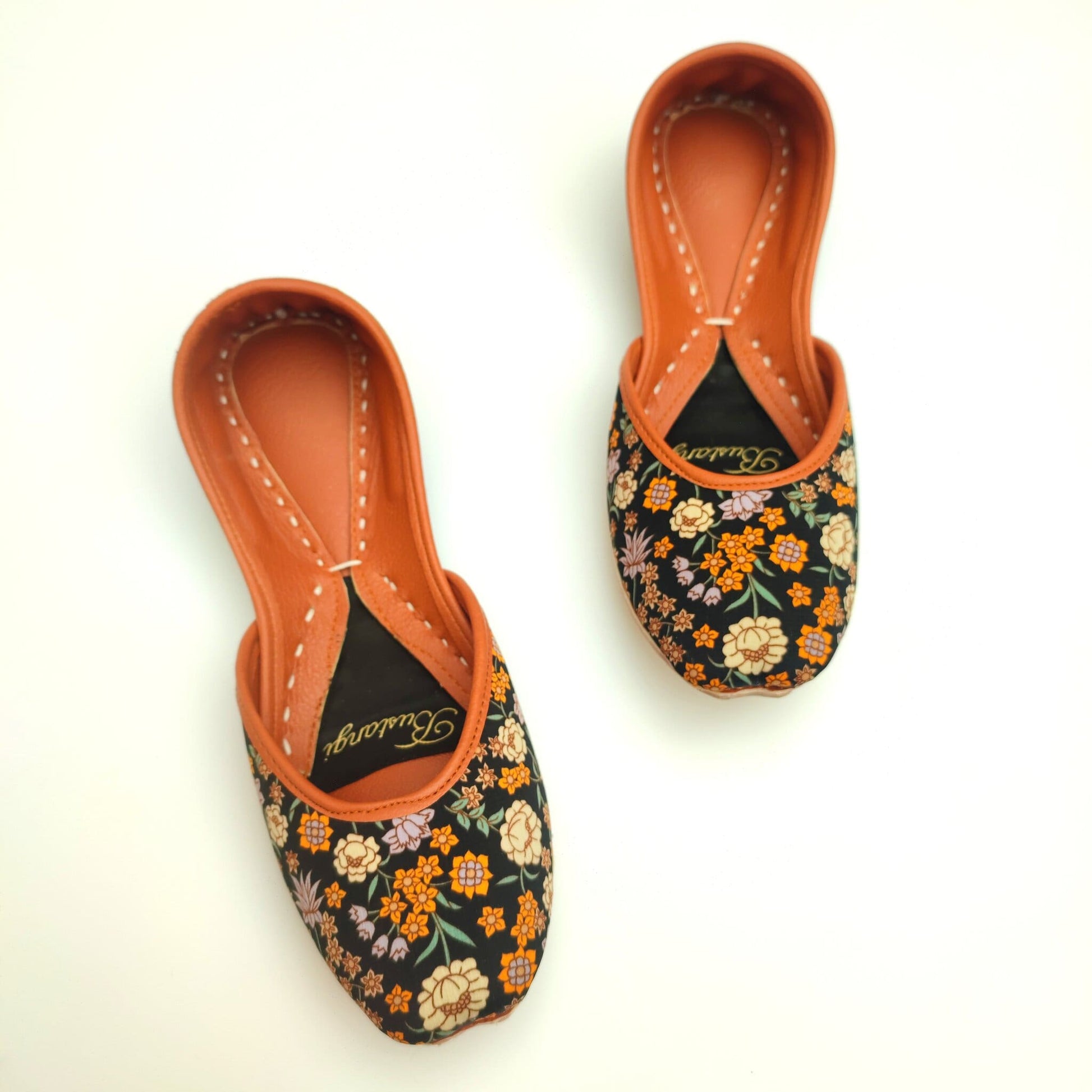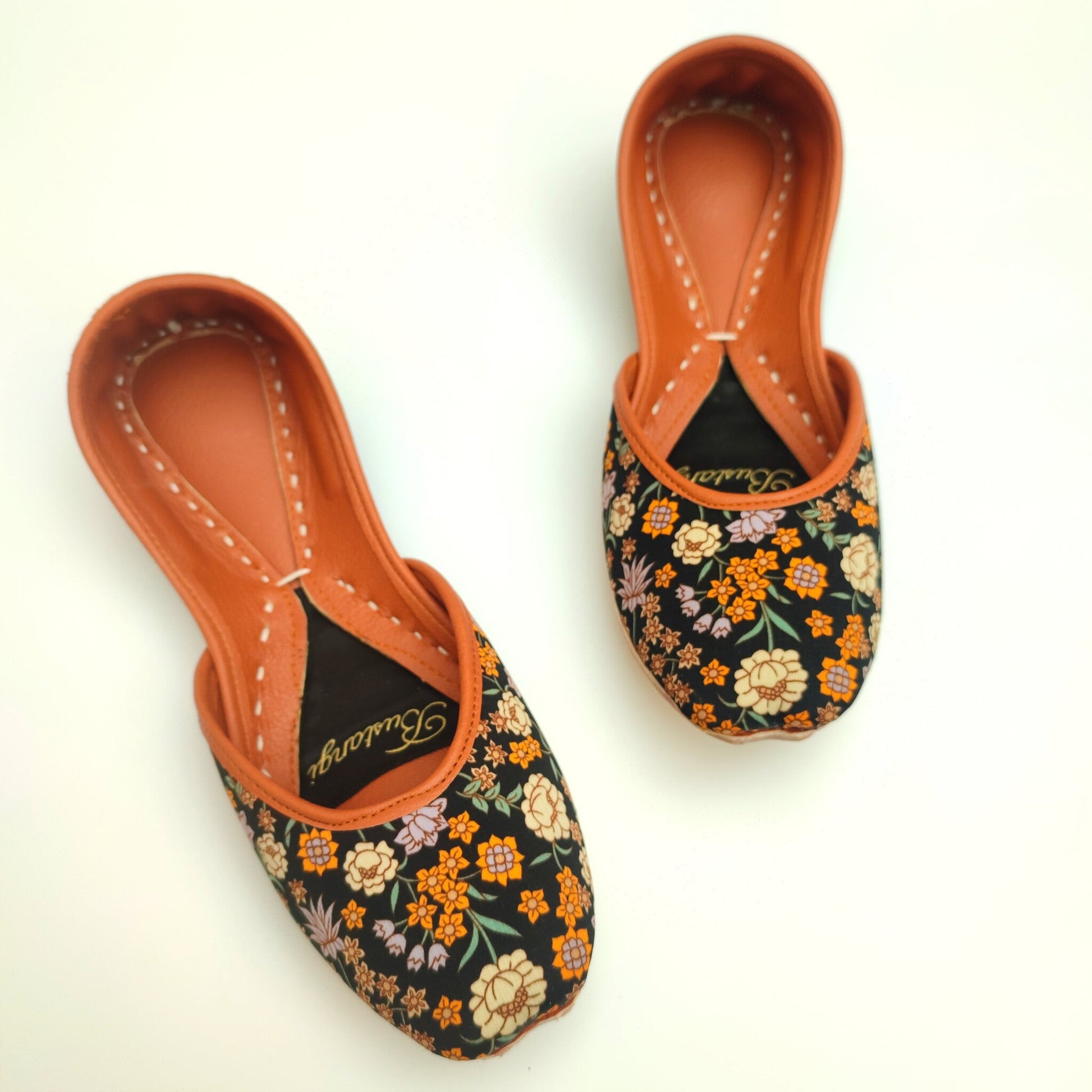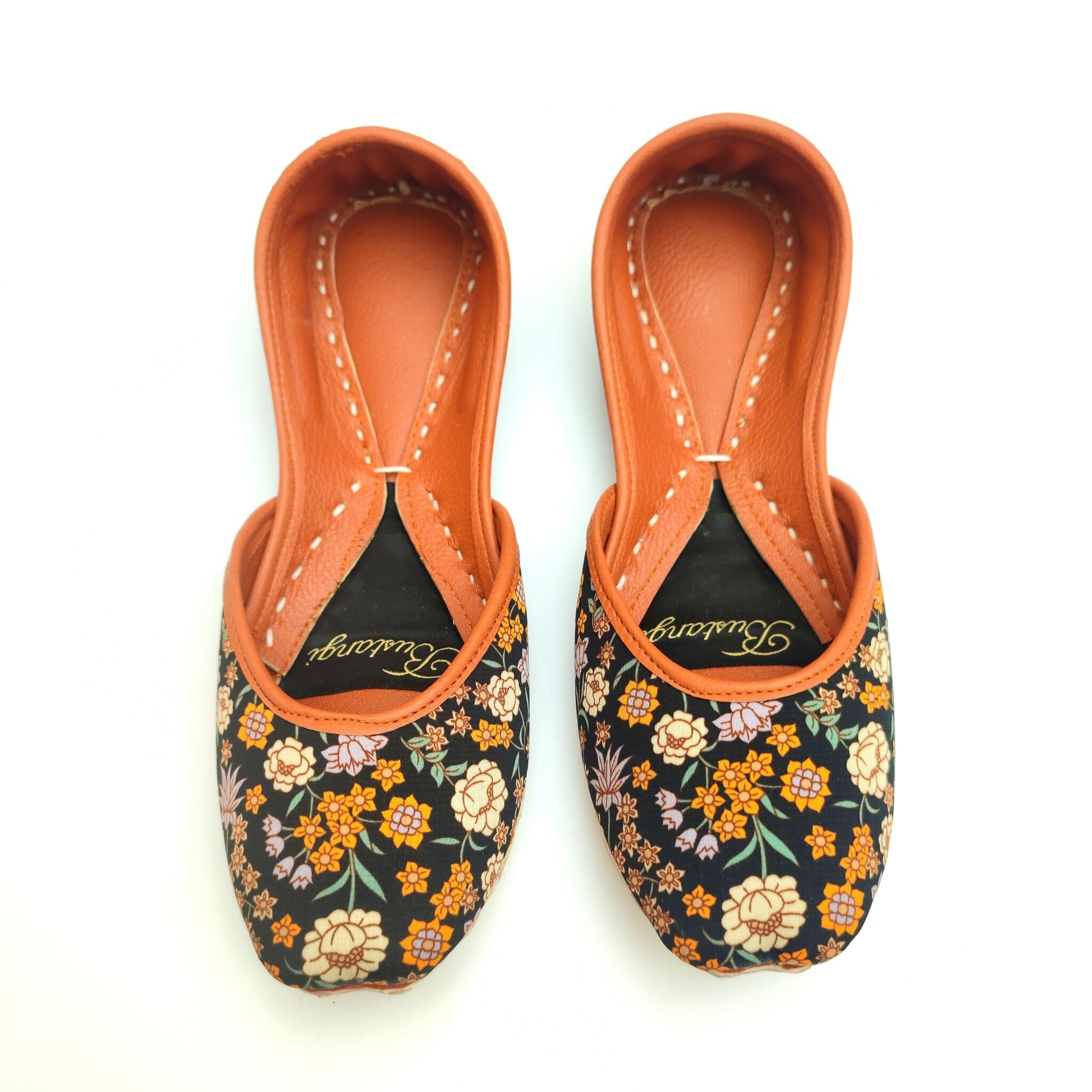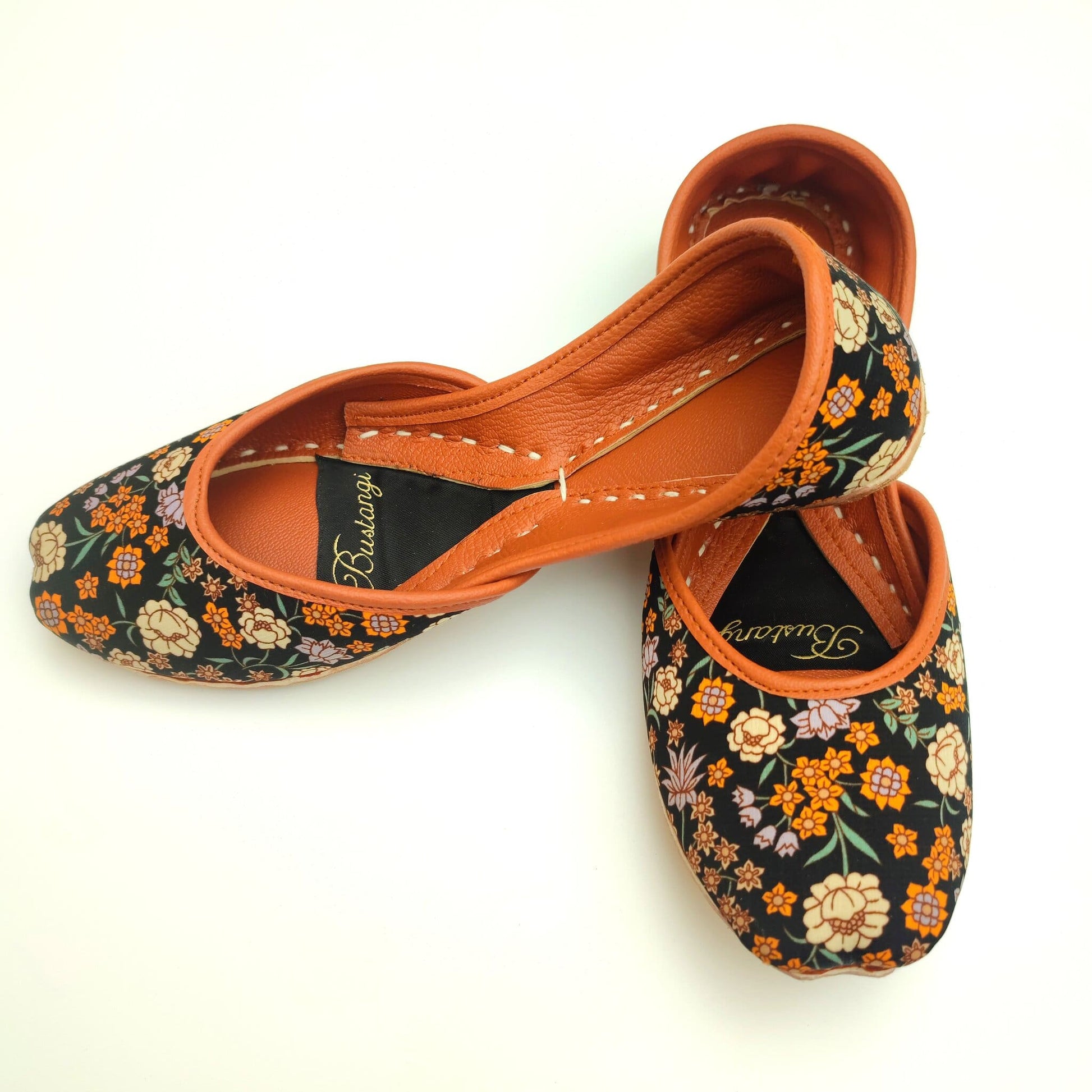 Bustangi's Freesia Casual Ladies khussa comes in black base with little orange flower print on top. These are flat ethnic footwear in casual style. Leather Sole and double padding is used for extra comfort. Necklines are also scalloped to avoid discomfort.