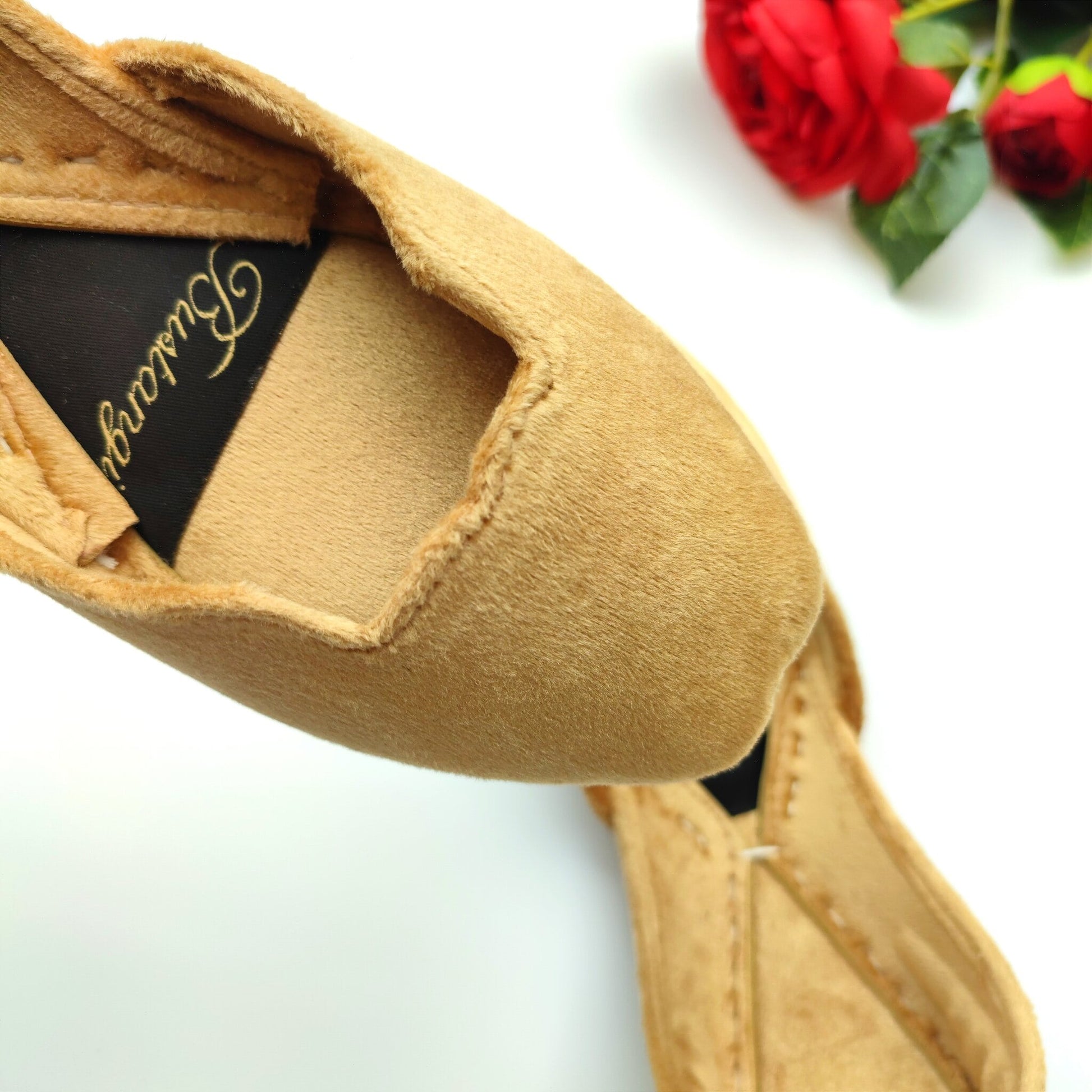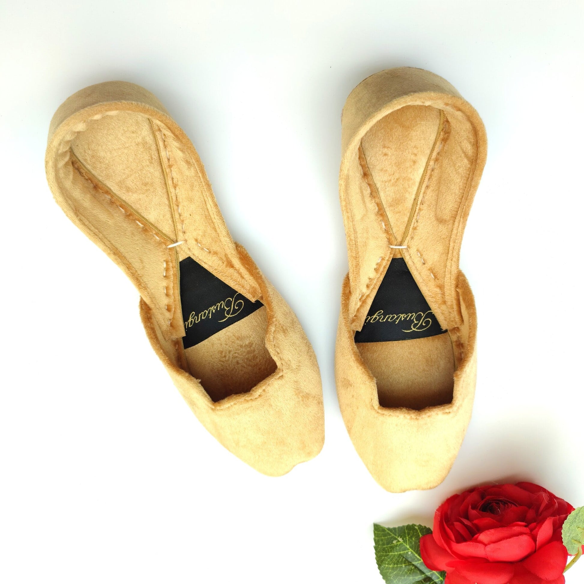 Bustangi presents you exclusive Rangreza Collection. This one is flat Golden color Ladies khussa. With velvet on top, It's made up of leather sole and double padding for additional comfort. Best for casual wear in summers and winters.