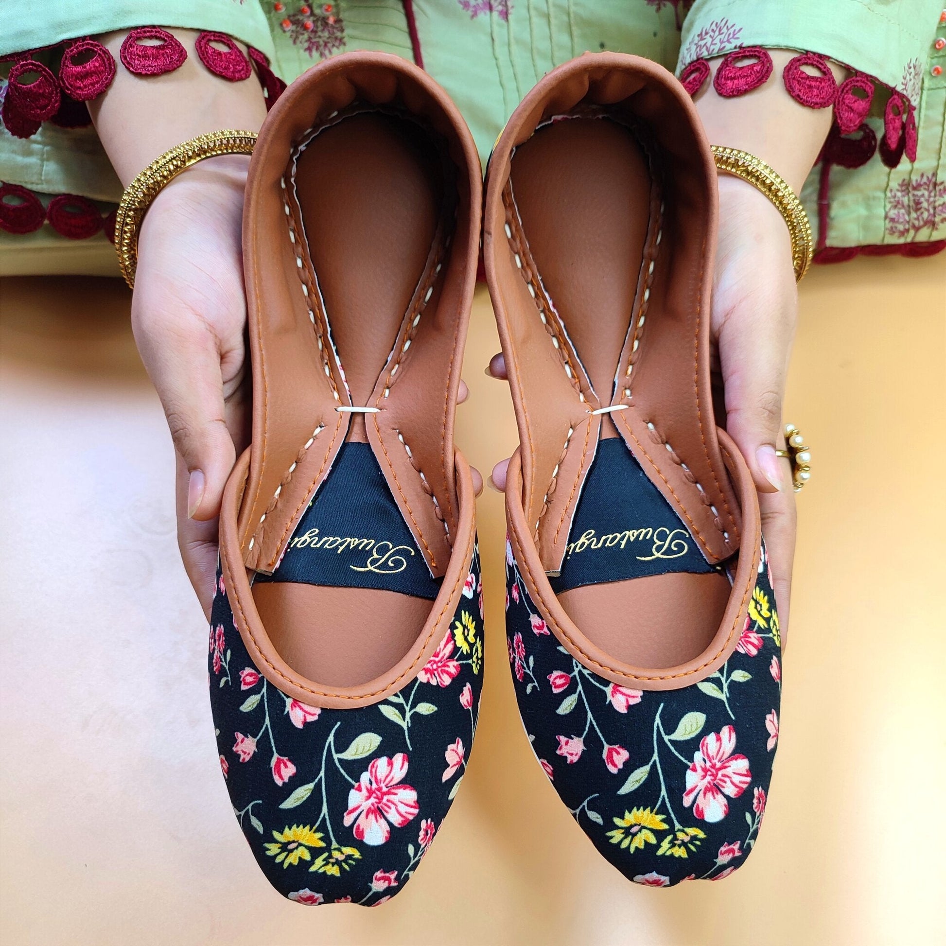 The sole of this ladies khussa is made from Leather, providing excellent traction and support, while the upper part is made from a soft and breathable material with a printed design on top. The slip-on khussa shoes design makes them easy to put on and take off, and the padded insole provides extra cushioning for your feet. Black color.