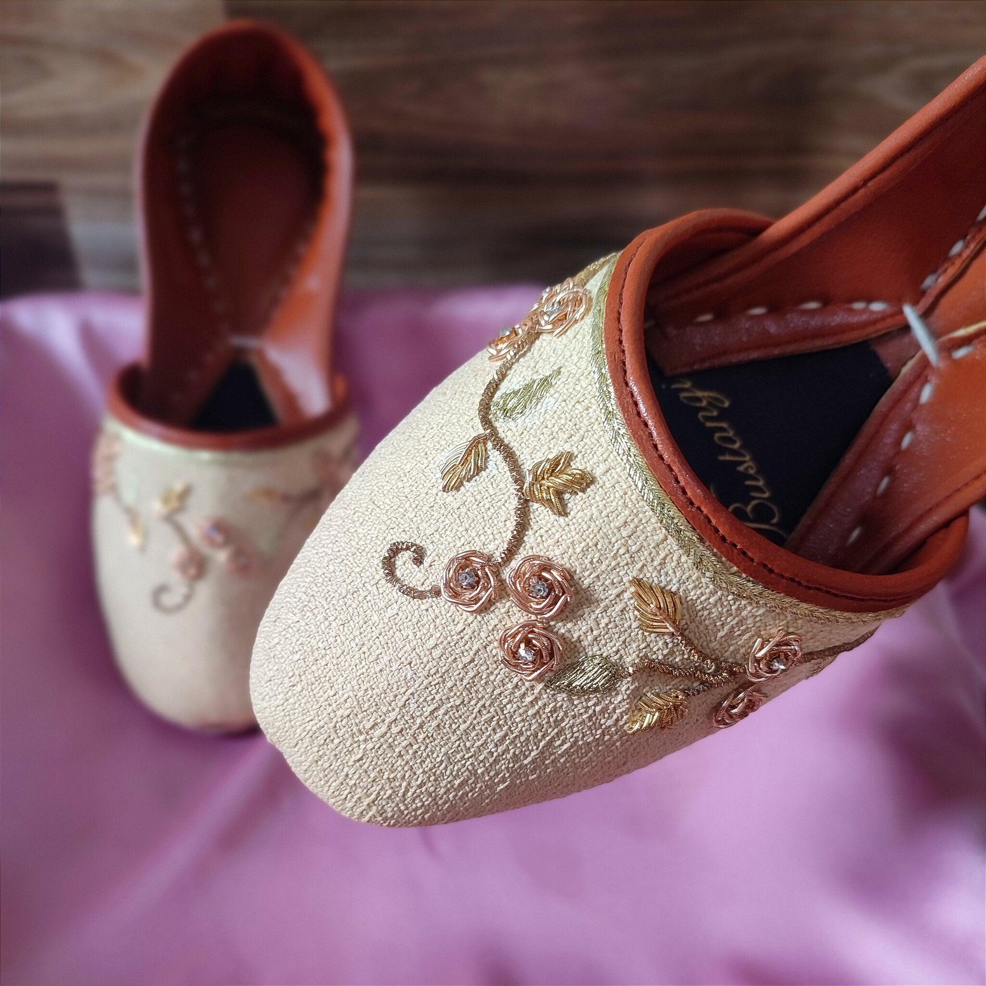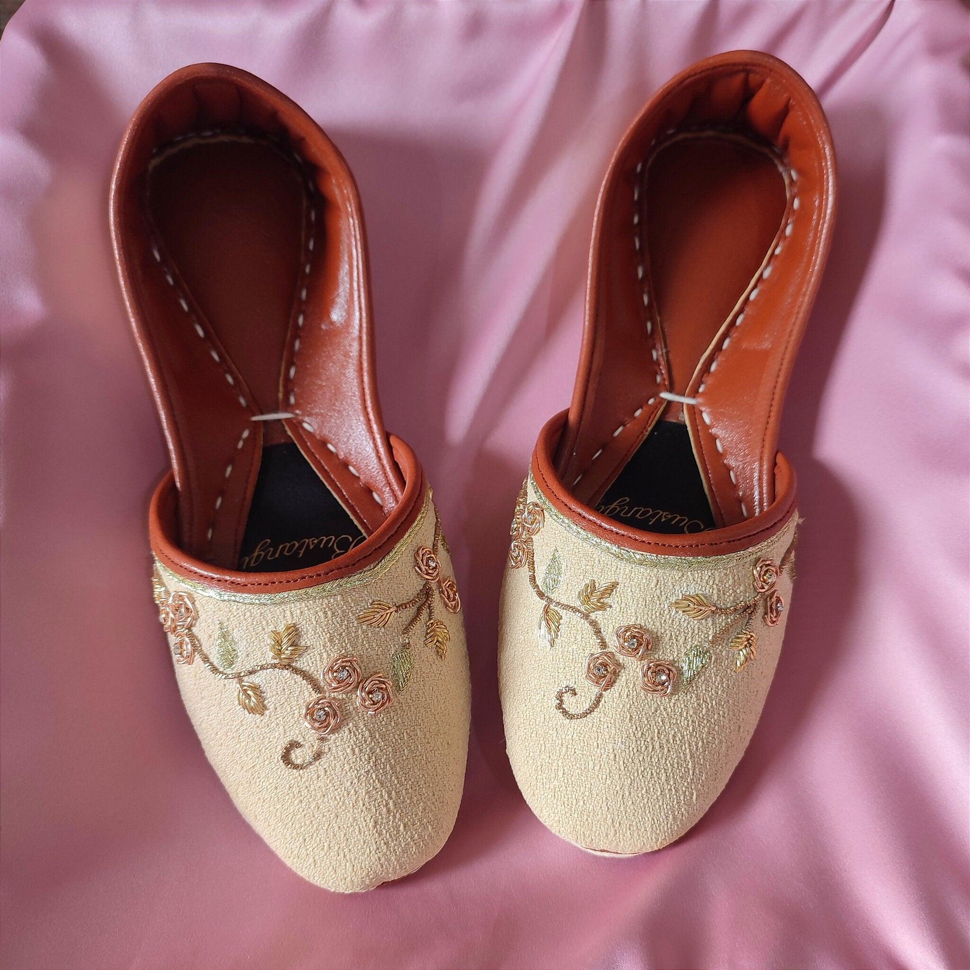 This Nawabi Women Khussa features antique flowering embroidery on top. Fawn color. It comes with leather sole and double padding for extra comfort. Necklines are also scalloped to avoid discomfort.