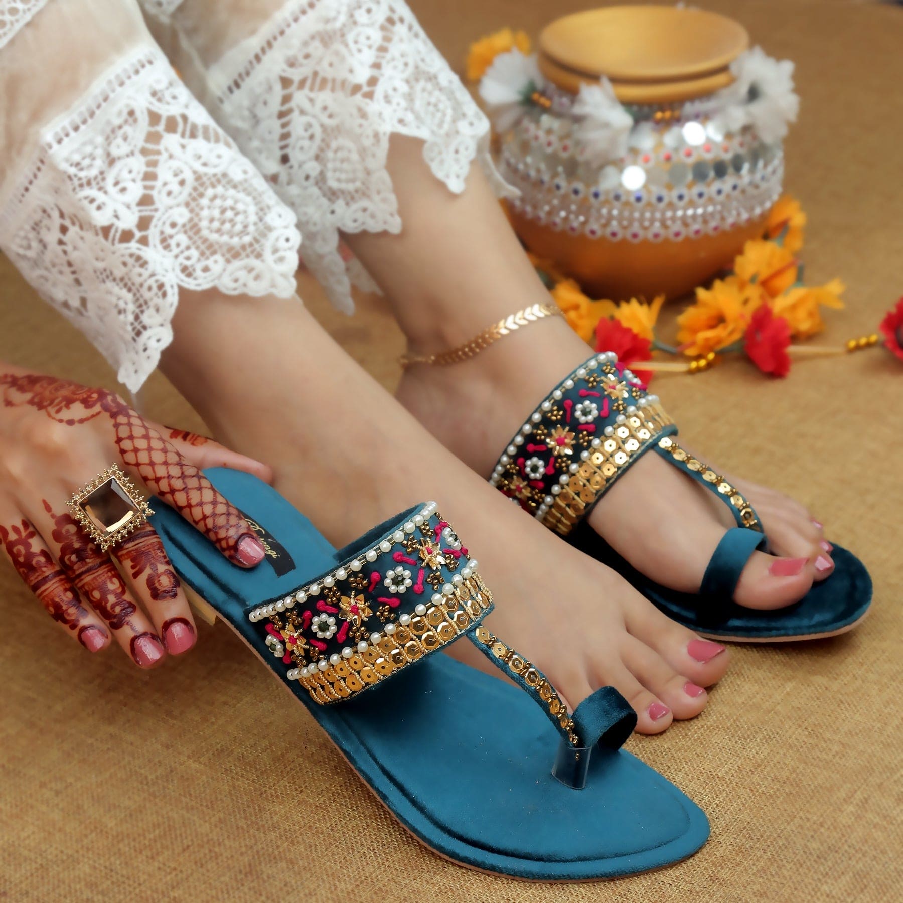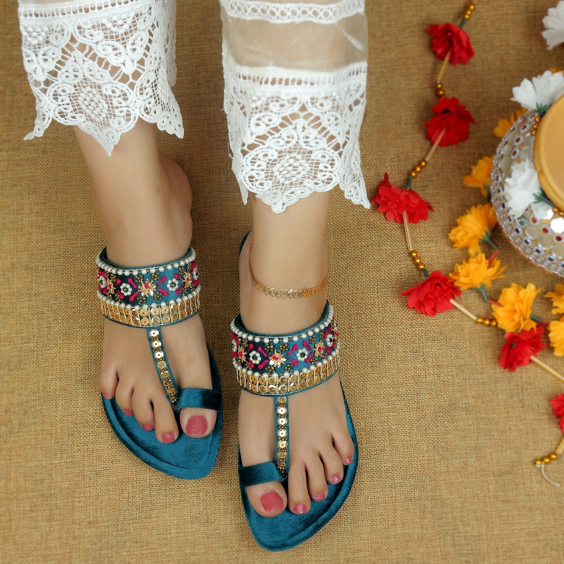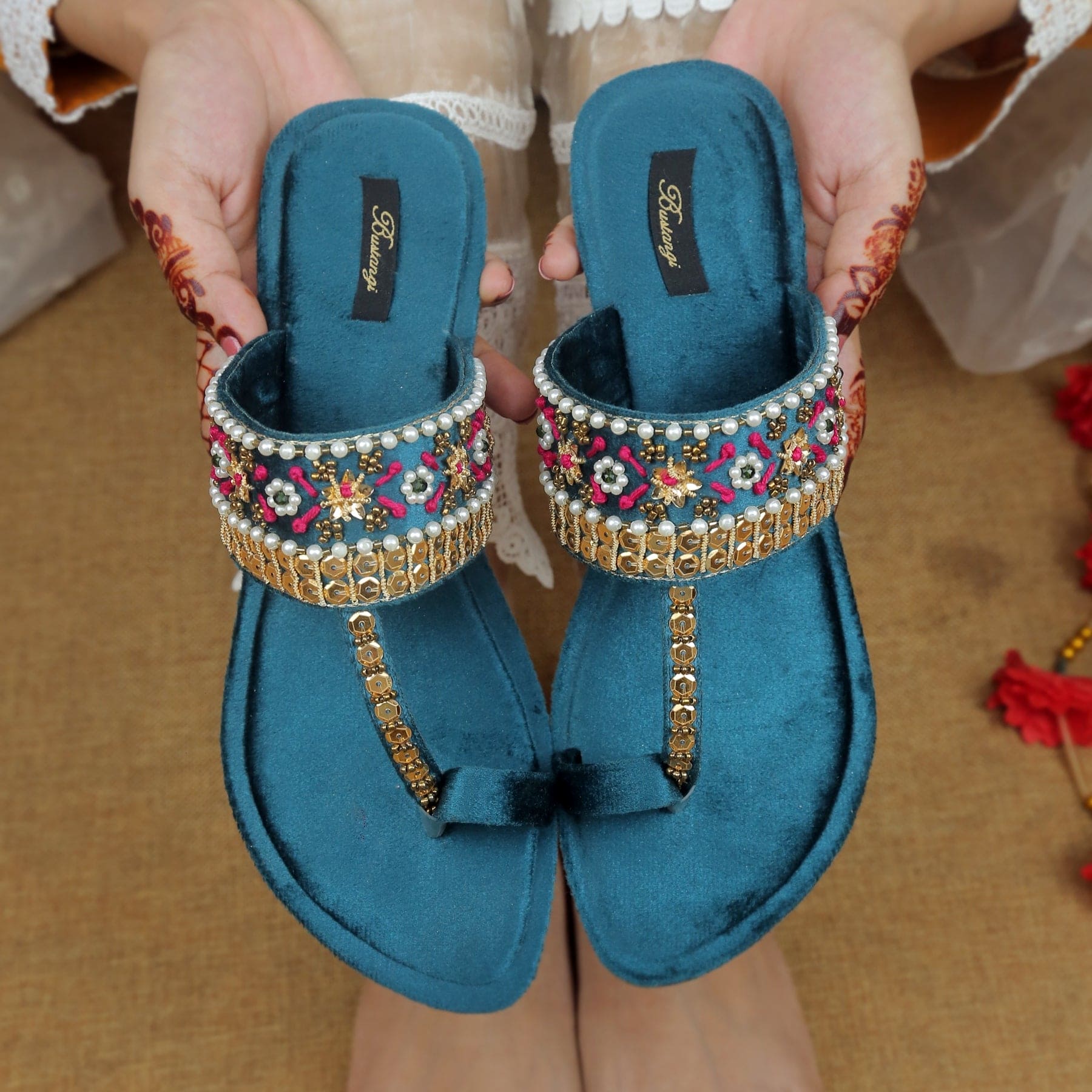 Elevate your style with Bustangi Kolhapuri chappals that add a touch of glamour to your every step