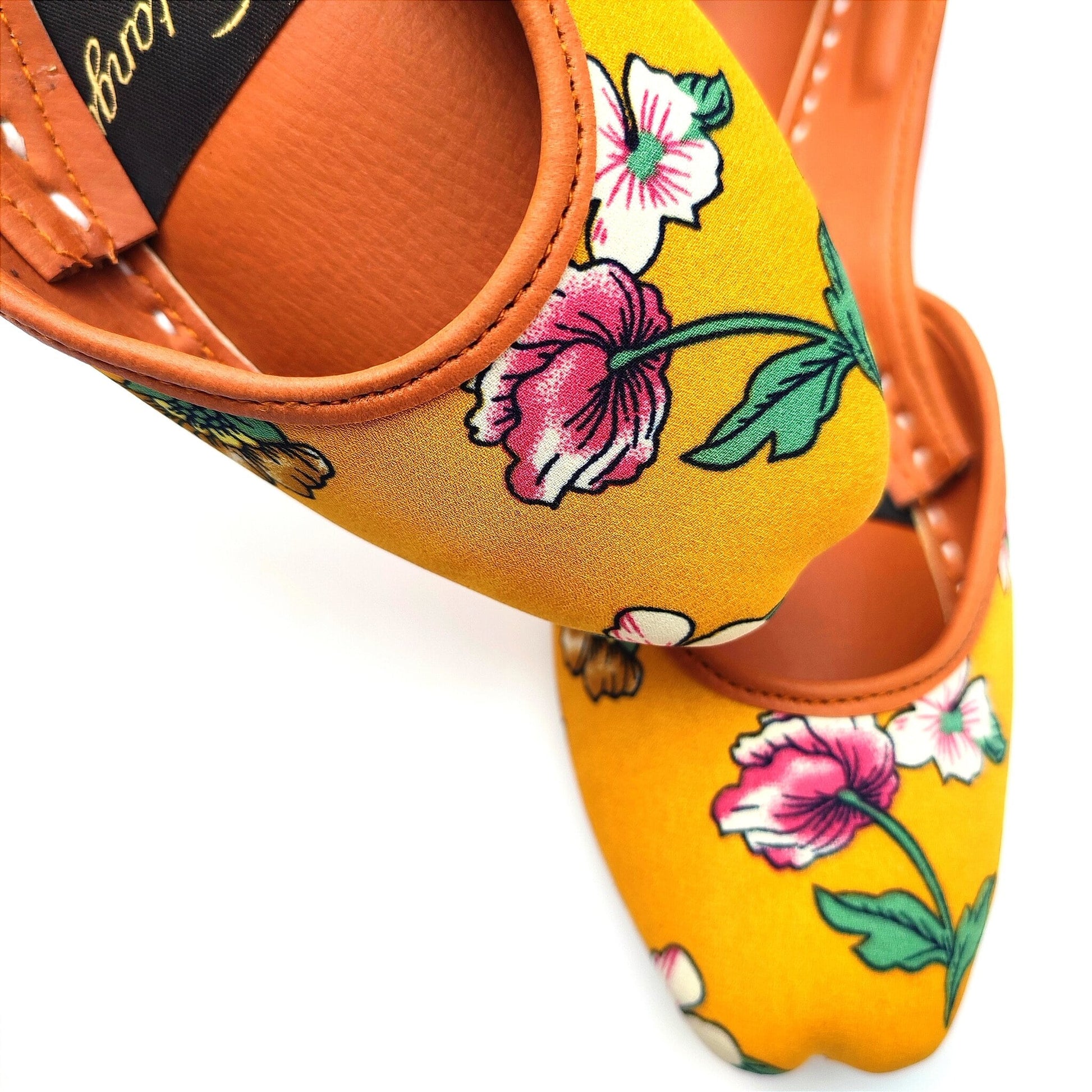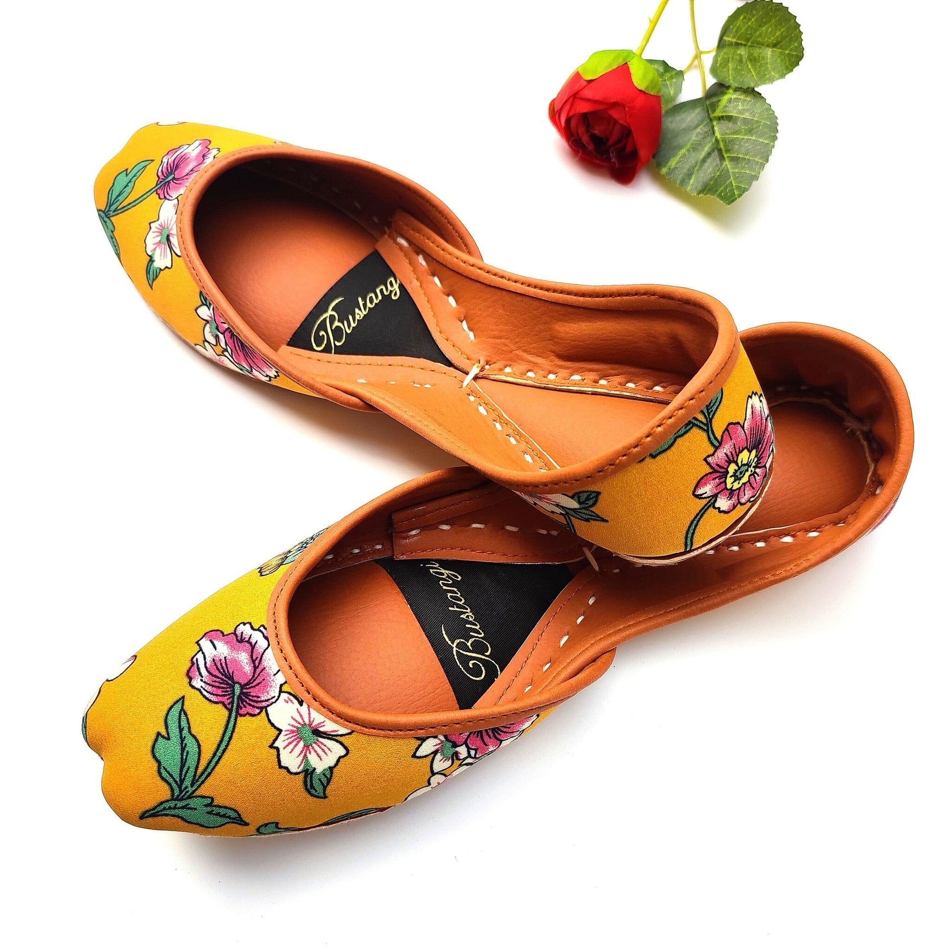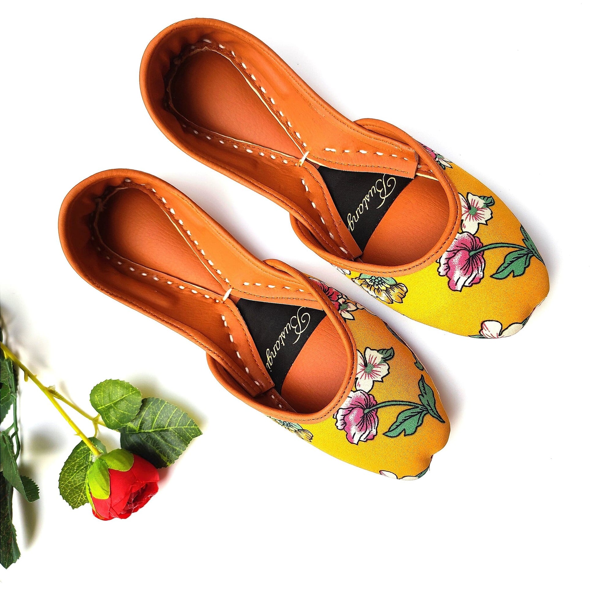 Bustangi's Lily Casual Ladies khussa comes in yellow silk base with lash tree print on top. These are flat ethnic footwear in casual style. Leather Sole and double padding is used for extra comfort. Necklines are also scalloped to avoid discomfort.