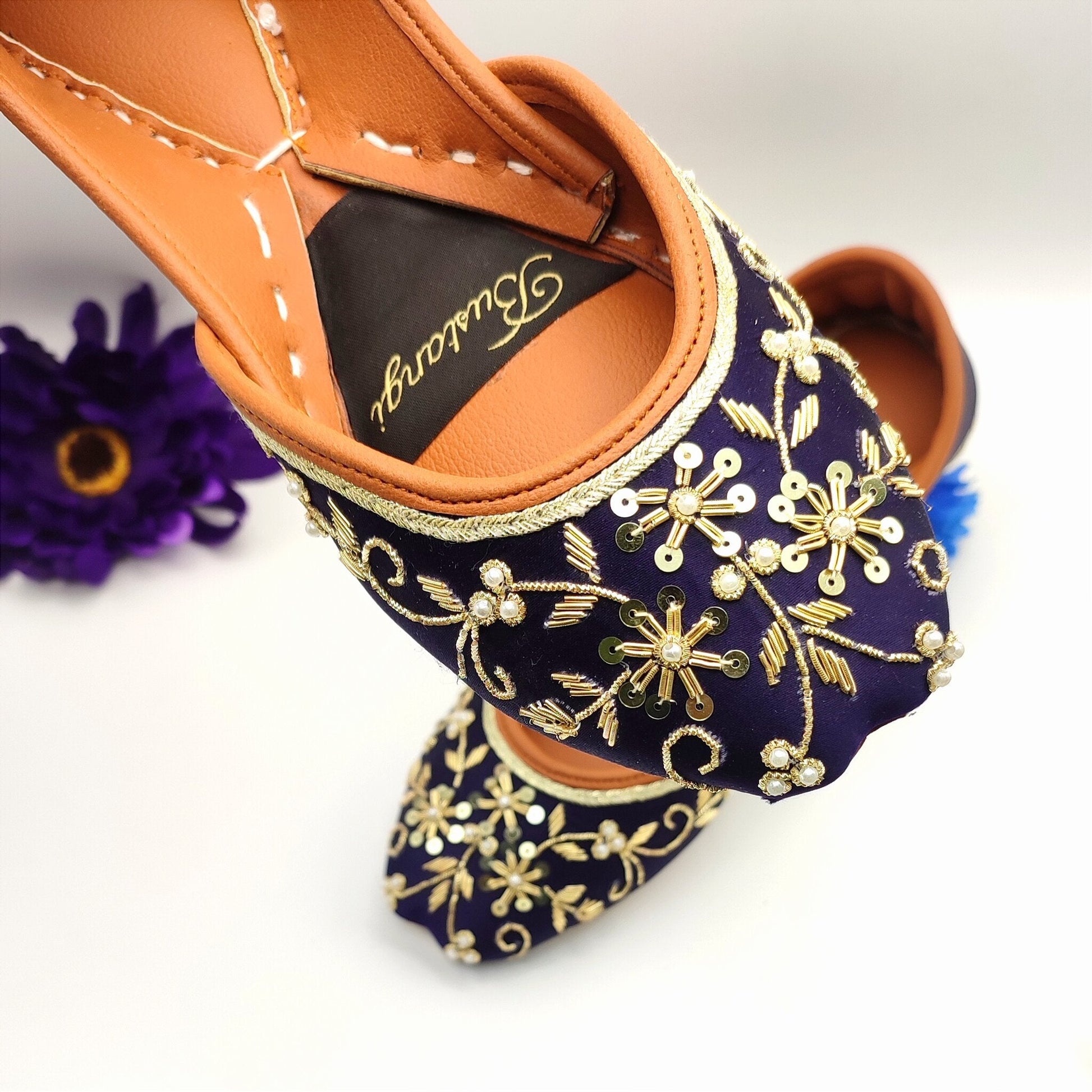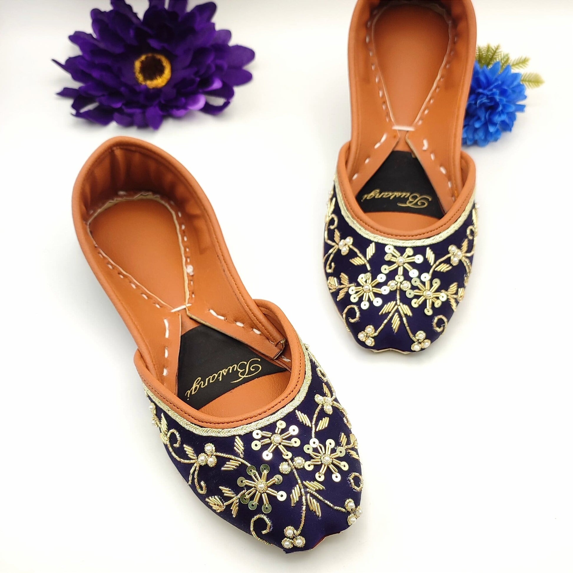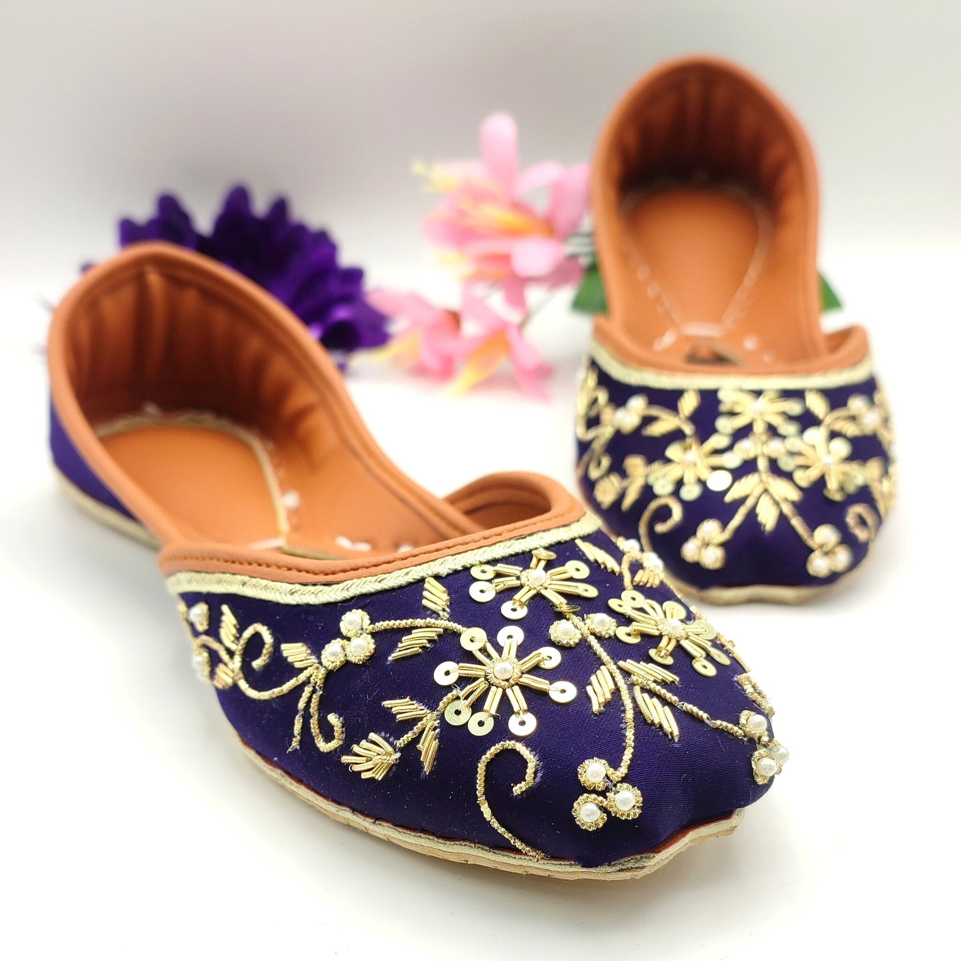 This embroidery khussa is made of leather sole it provides excellent traction and support. Beautiful handcrafted embroidery is done over the upper part on a soft and breathable material. The slip-on khussa shoes design makes them easy to put on and take off, and the padded insole provides extra cushioning for your feet. Purple color.