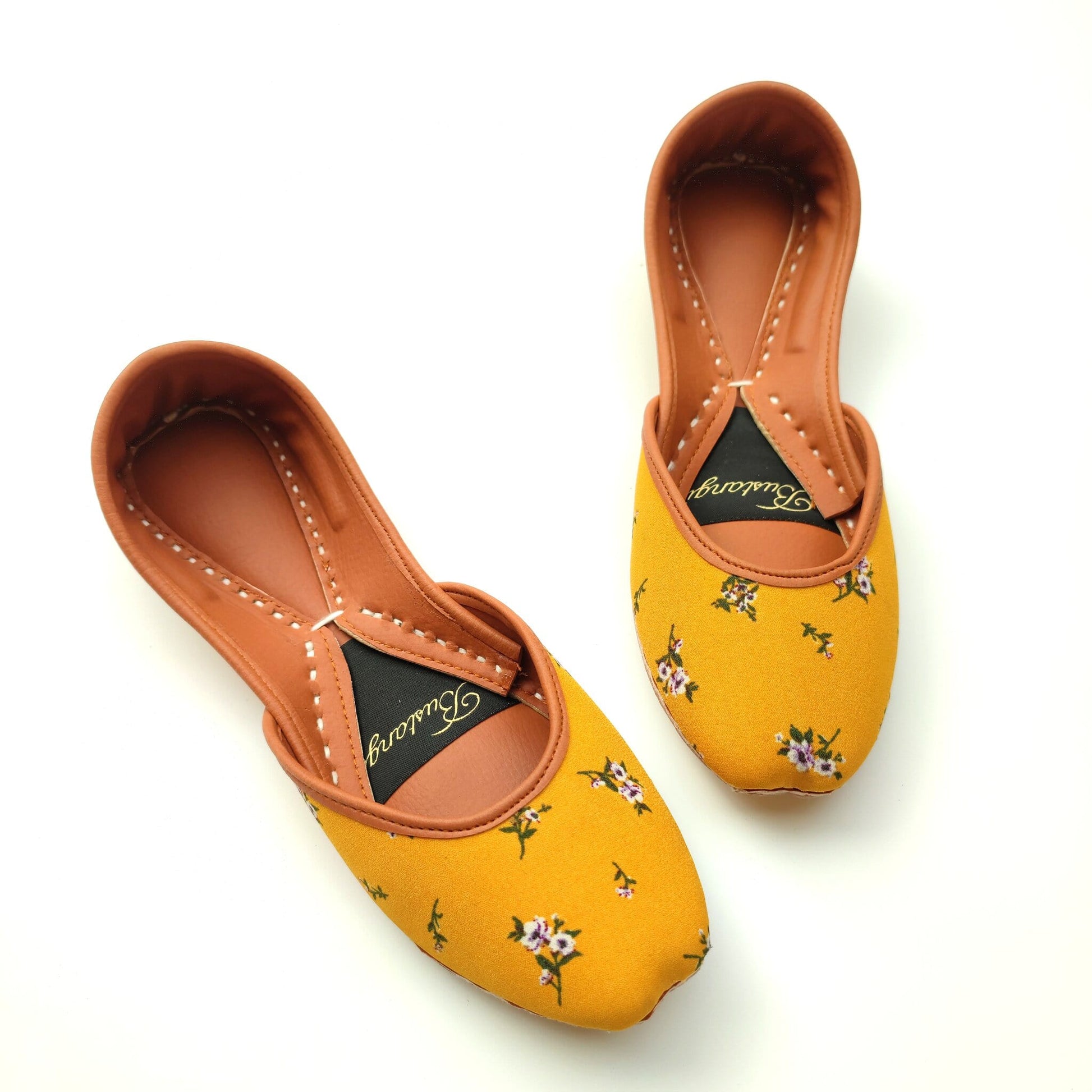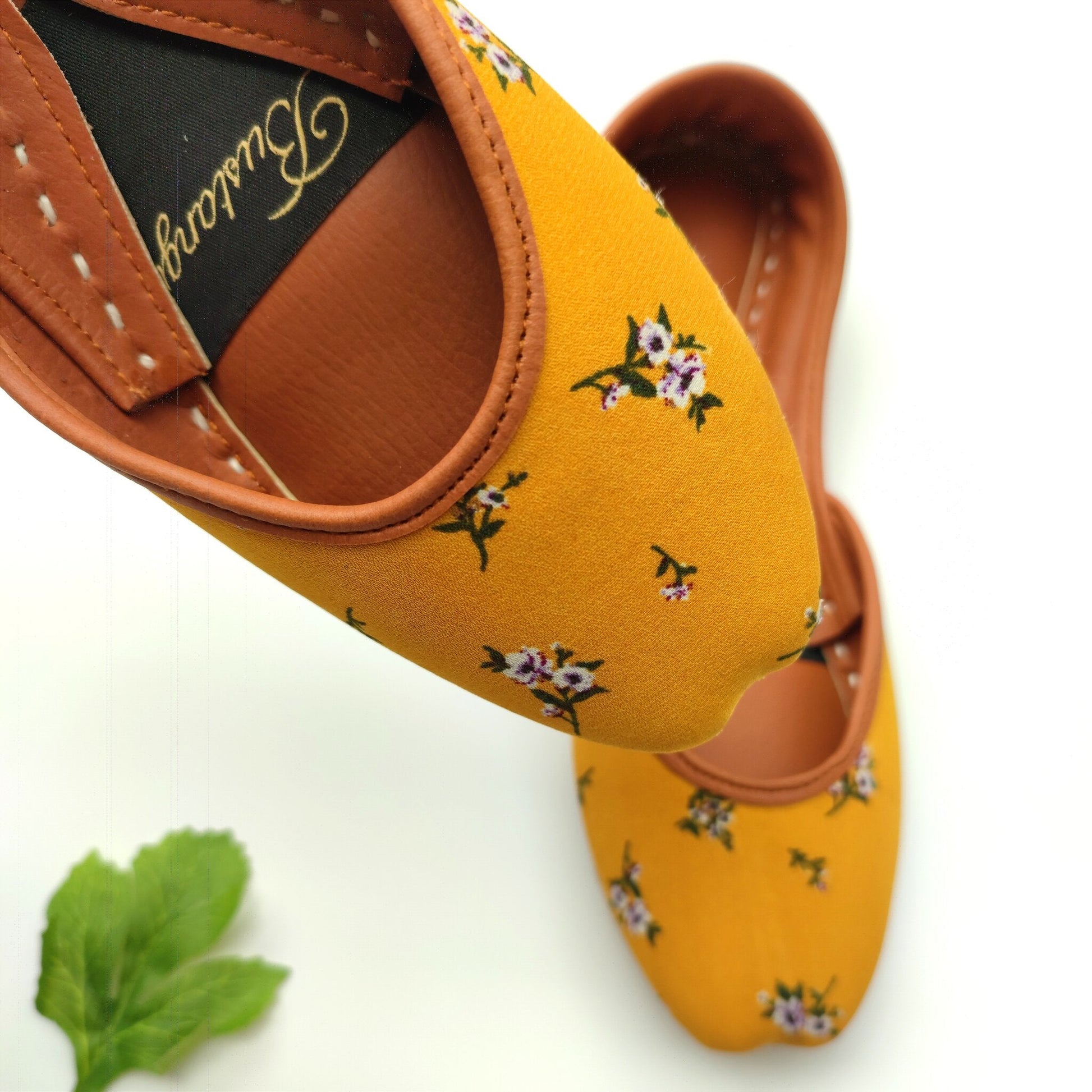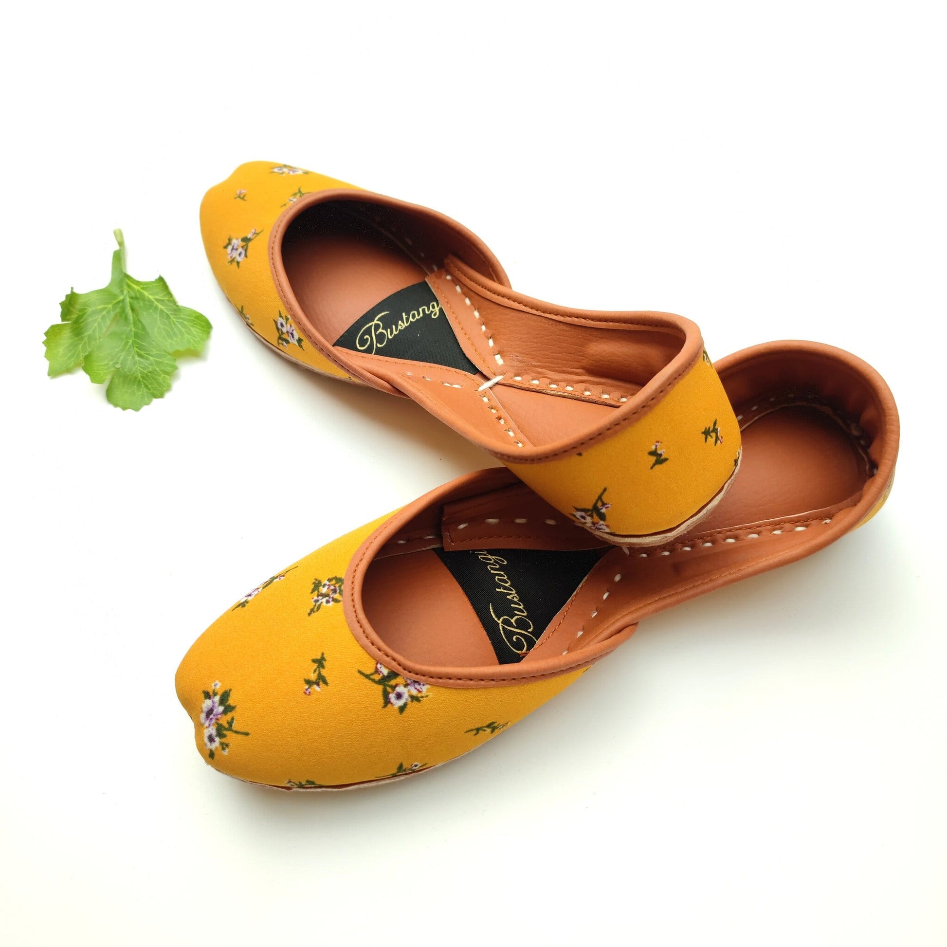 Bustangi's Marigold Casual Ladies khussa comes in Yellow silk base with flower leaf print on top. These are flat ethnic footwear in casual style. Leather Sole and double padding is used for extra comfort. Necklines are also scalloped to avoid discomfort.