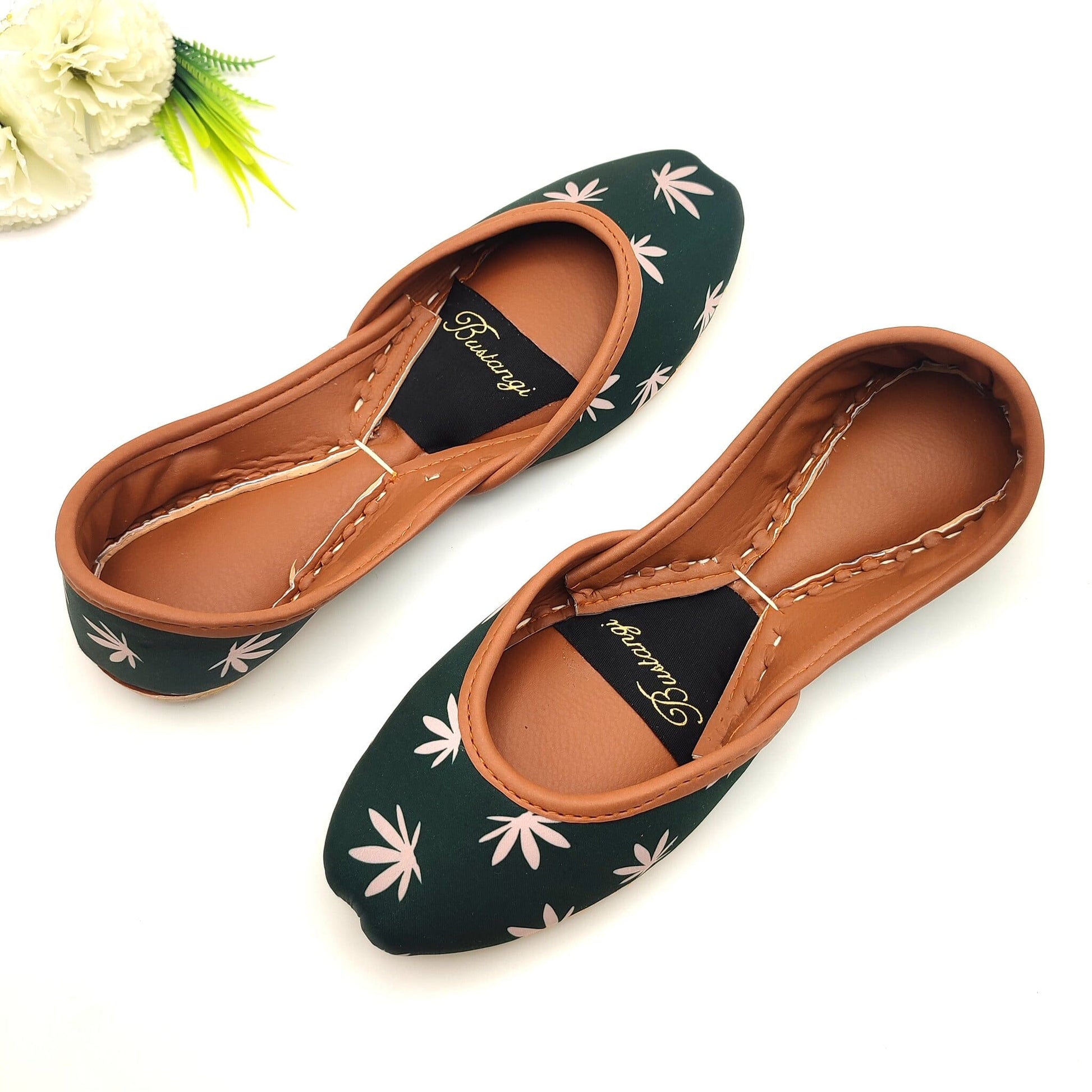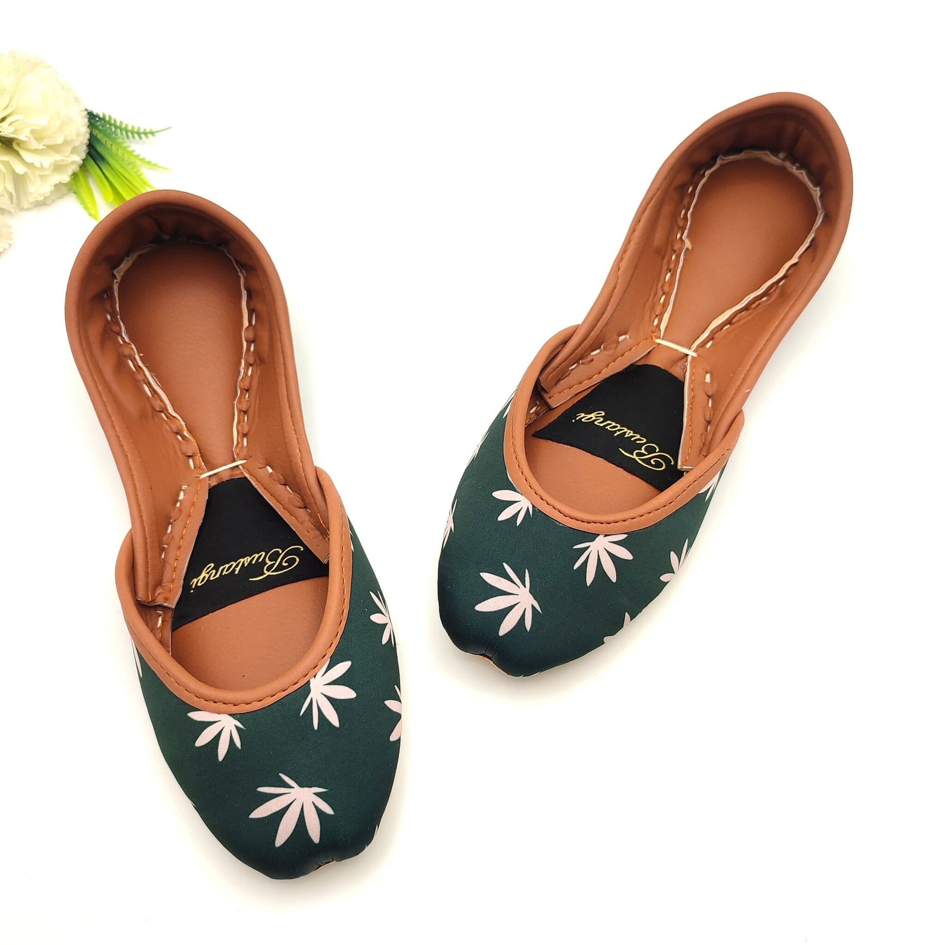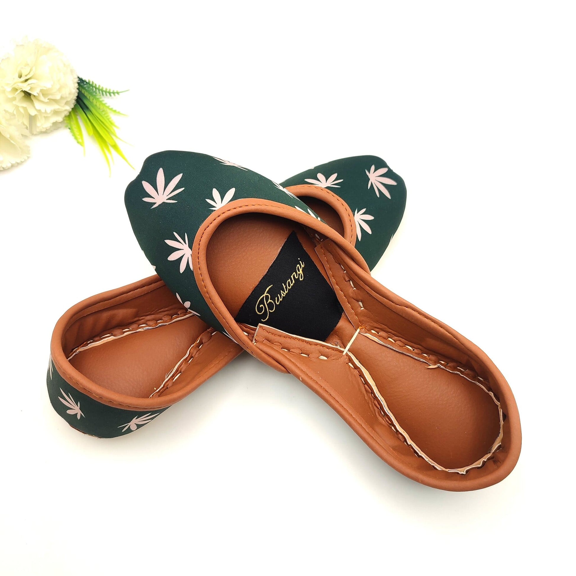 Bustangi's Star Casual Ladies khussa comes in Green silk base with star leaf print on top. These are flat ethnic footwear in casual style. Leather Sole and double padding is used for extra comfort. Necklines are also scalloped to avoid discomfort.