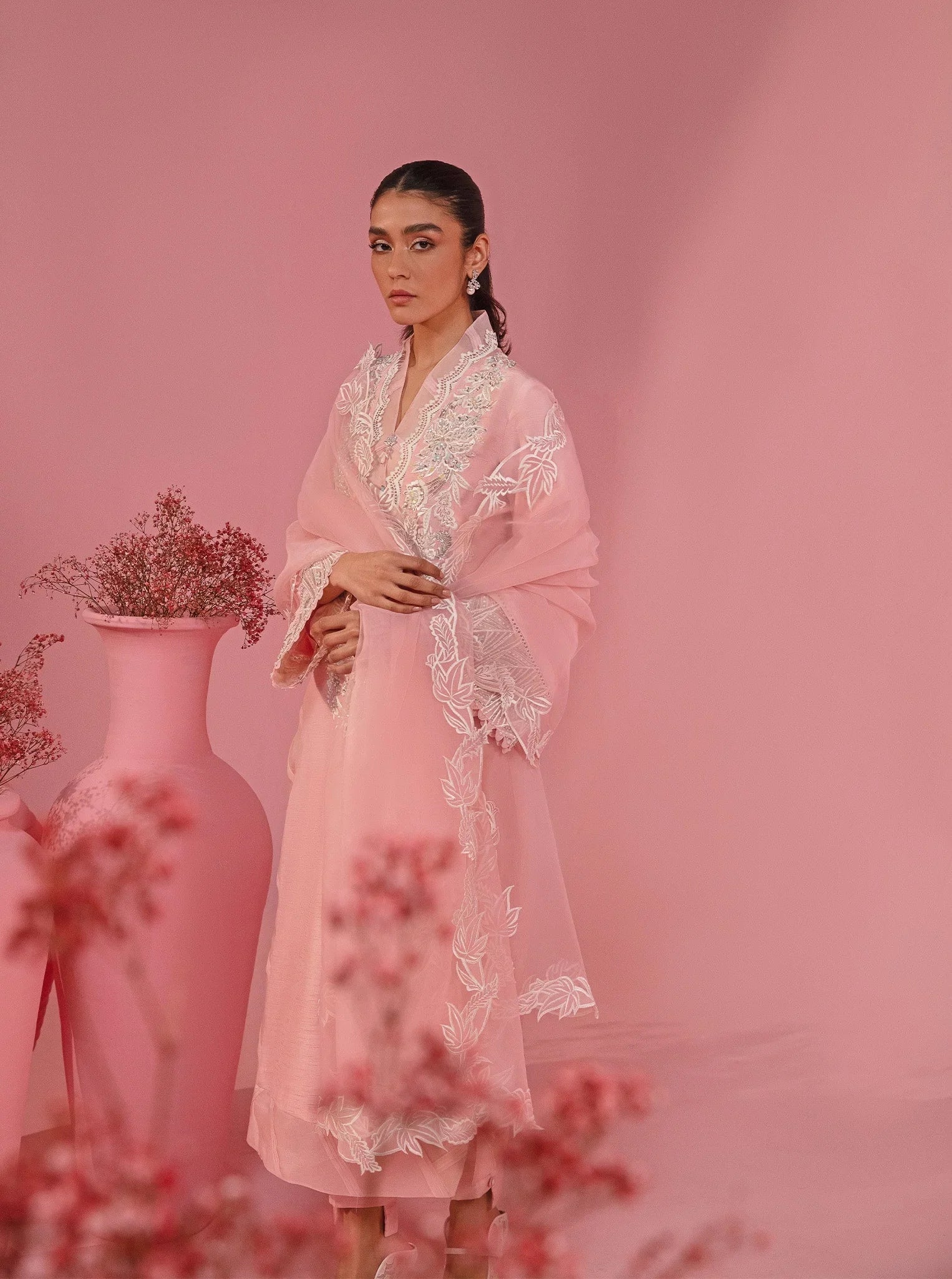 A raw silk shirt with pure organza details paired with raw silk pants and an organza dupatta. A huge motif is constructed around the neckline using white floral color and embellished with pearls, cut-dana, naqshi, and dabka. An embellished line pattern is carried on the sleeve cuffs.- Enjoy Free Shipping Across Pakistan